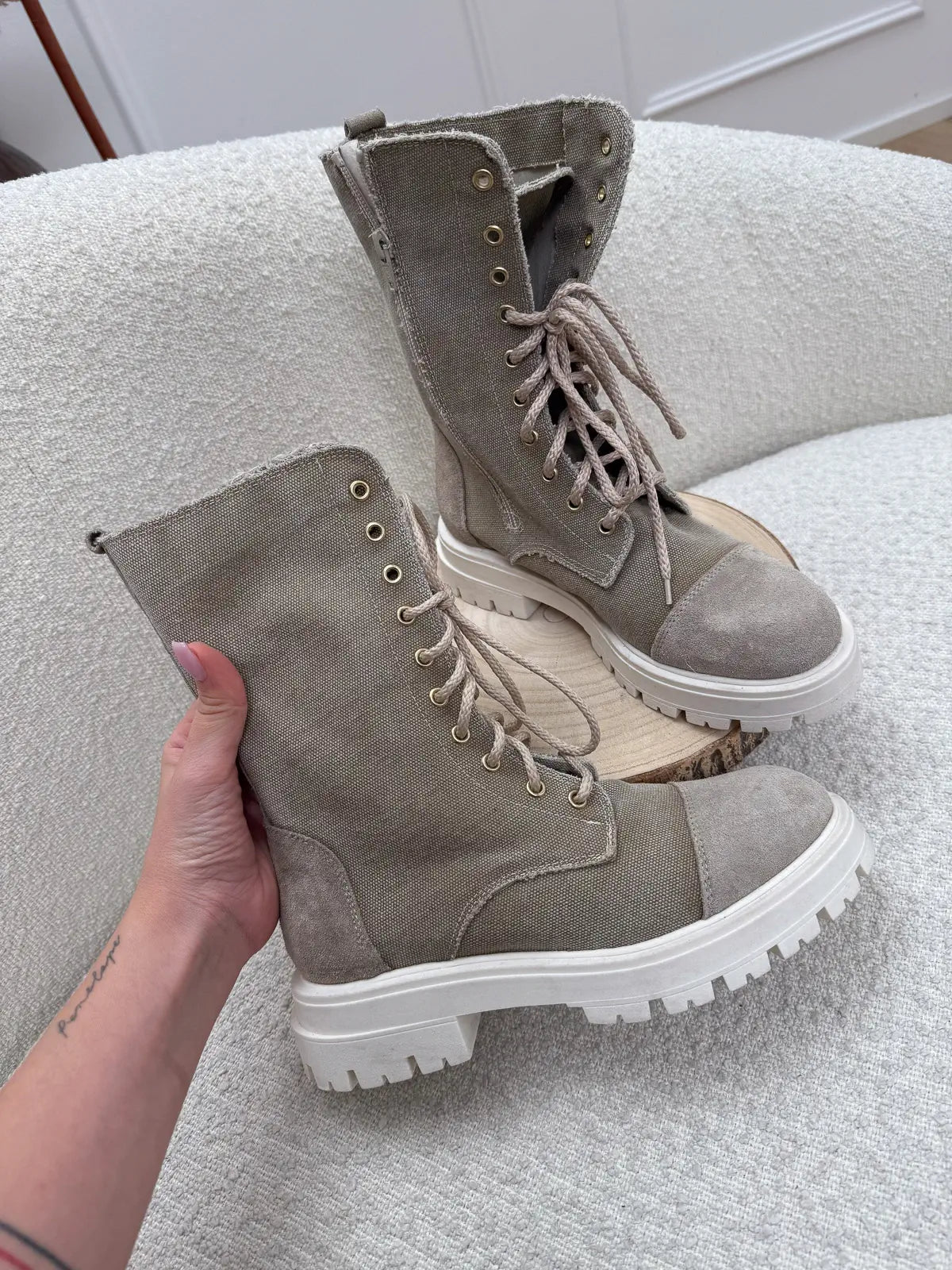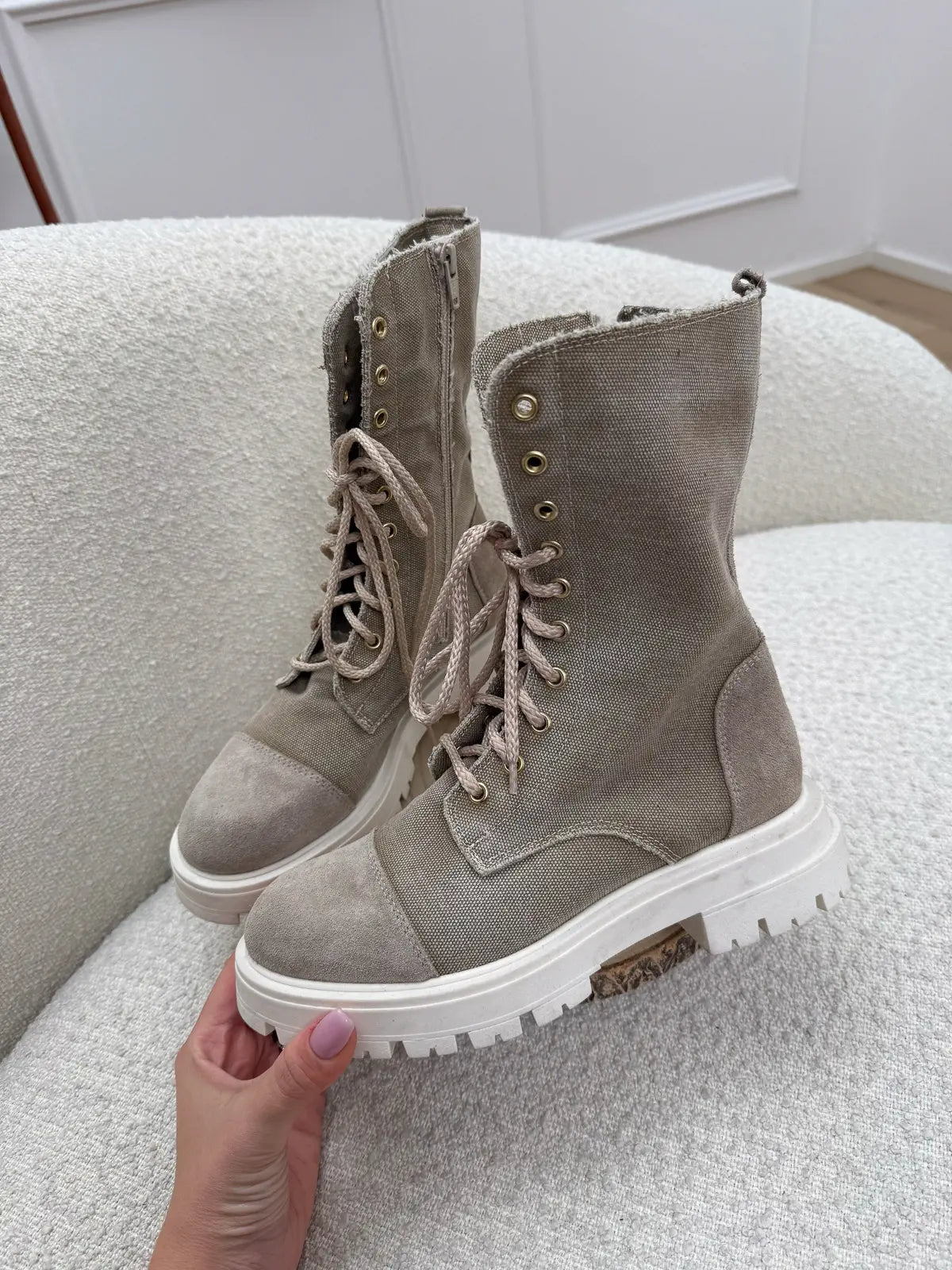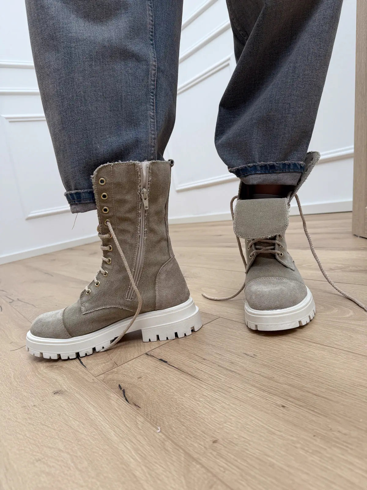 Anfibio in canvas color sabbia Divine Follie. Modello gambale altezza polpaccio con suola track panna a contrasto. Chiusura con zip laterale e stringhe frontali.
