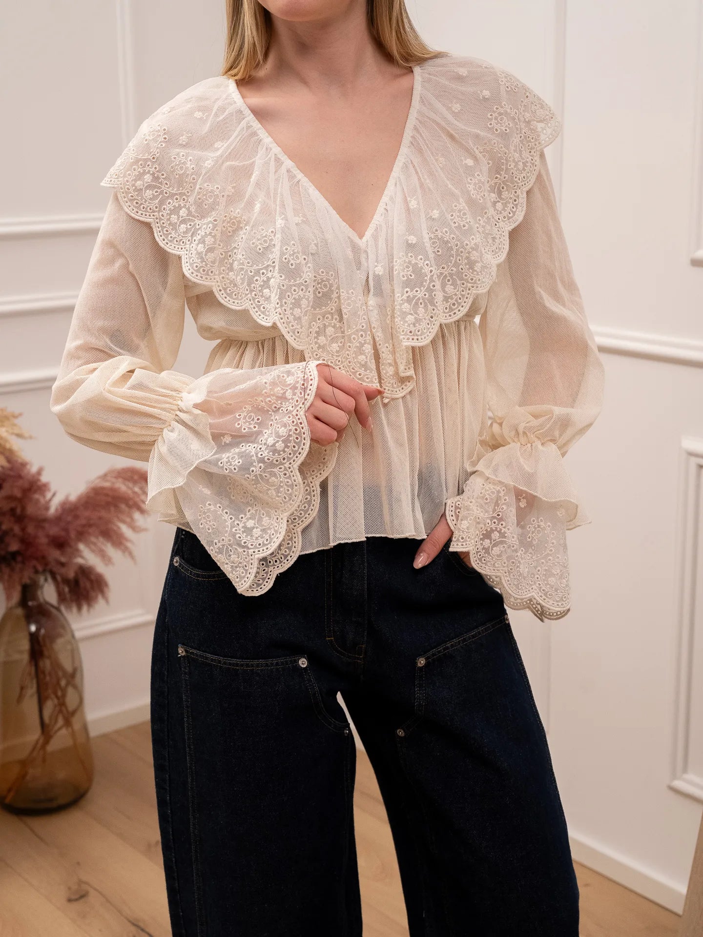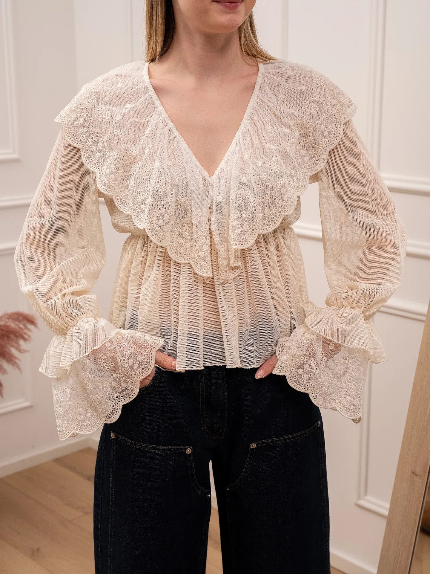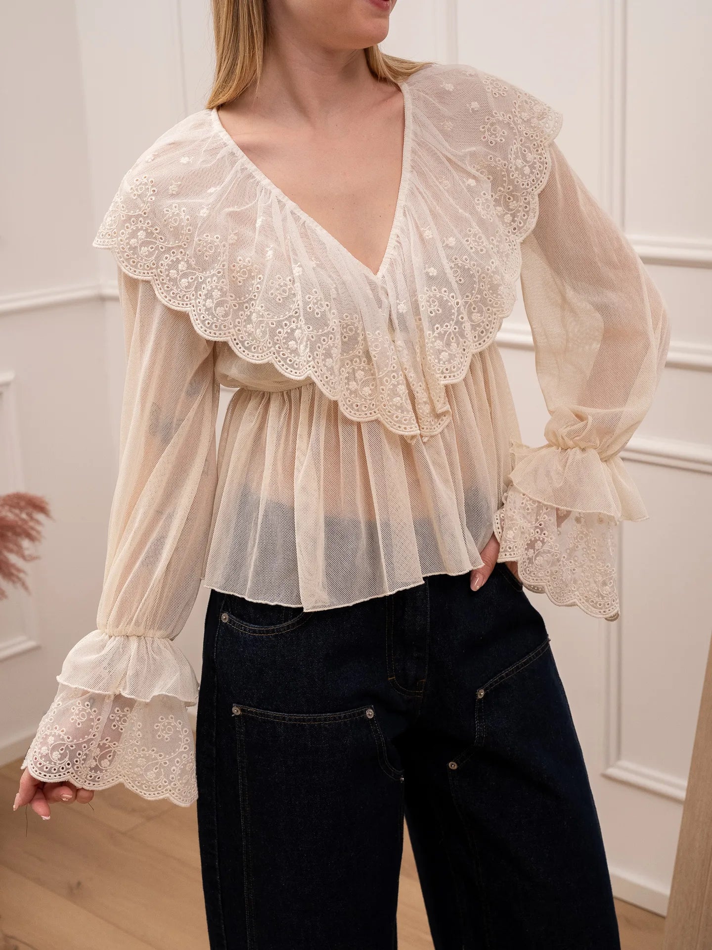 Blusa in tulle burro con pizzo e volant - Tensione In