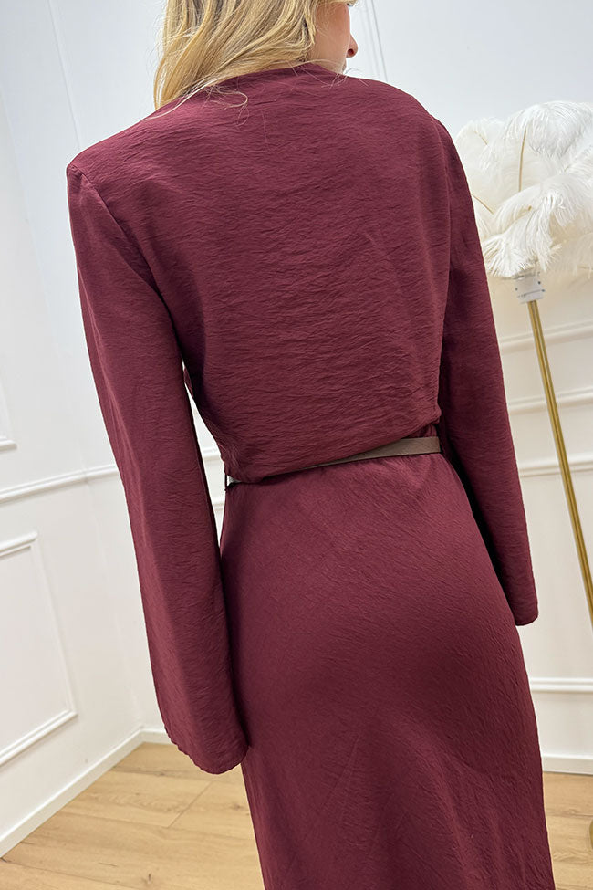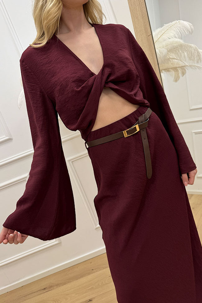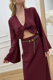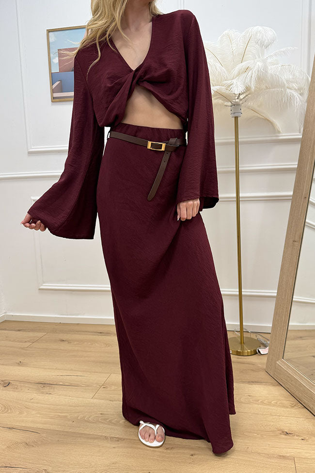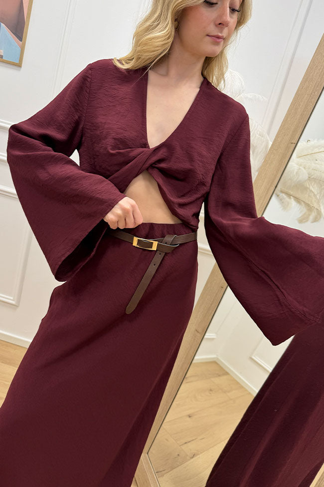 Blusa color india in viscosa effetto stropicciato HaveOne. Modello con scollo a v e nodo frontale. Manica lunga a campana.