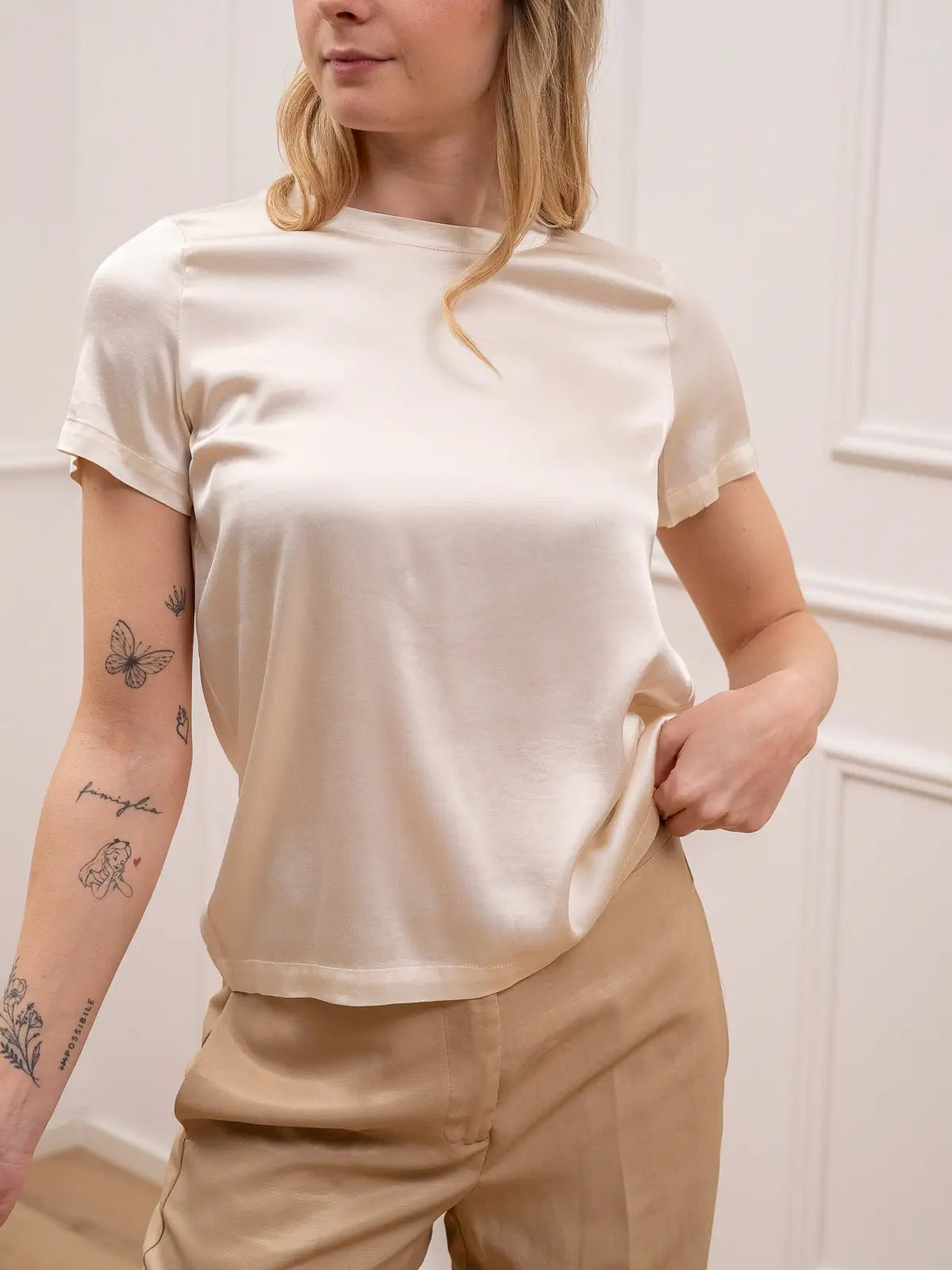 Blusa in raso color burro HaveOne. Modello basic fit regolare, girocollo a mezza manica.