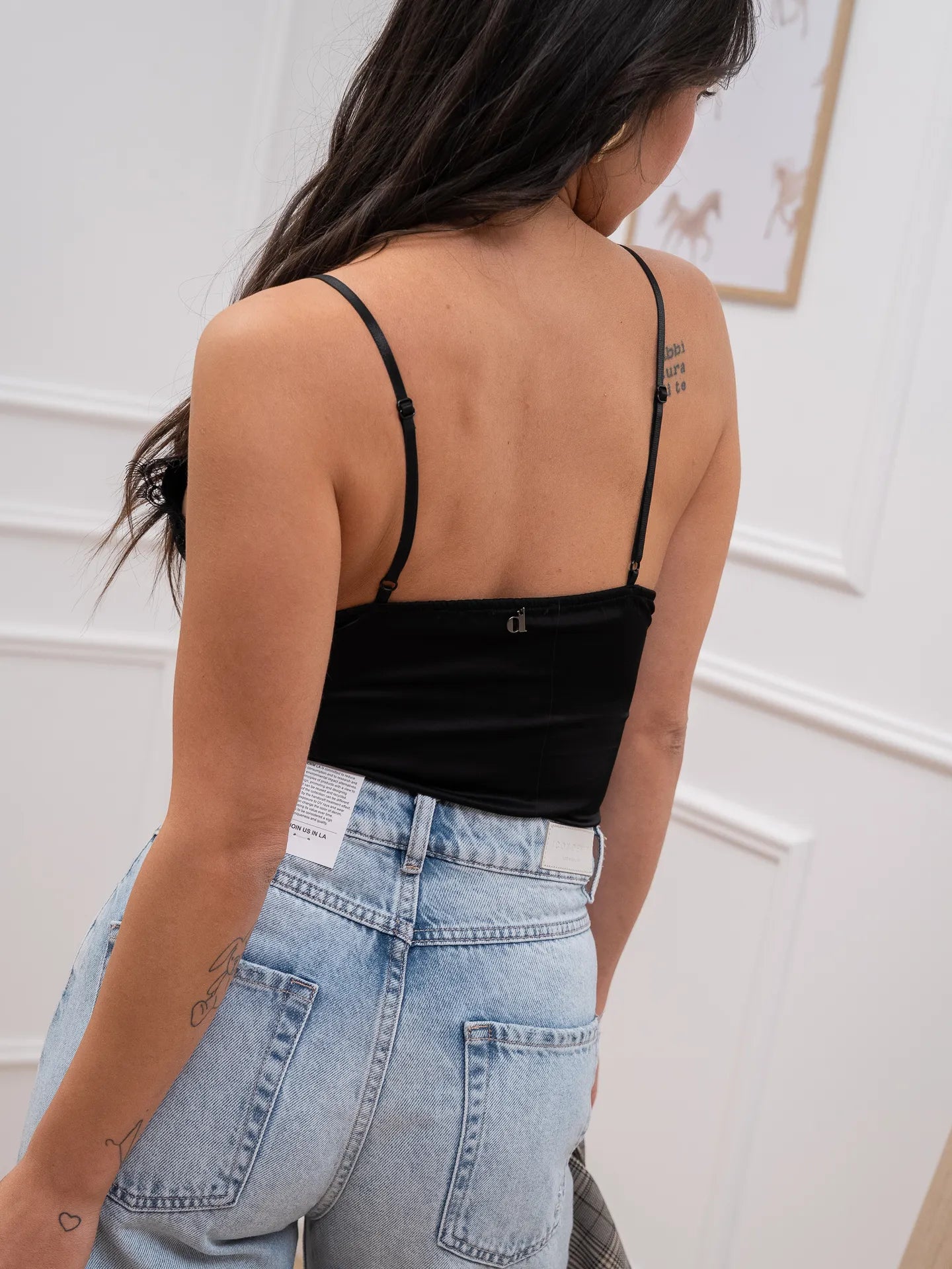 Body in raso color nero Dixie. Modello scollo a v e spalline sottili regolabili. Dettaglio di pizzo e chiusura sul fondo con bottoni a pressione.