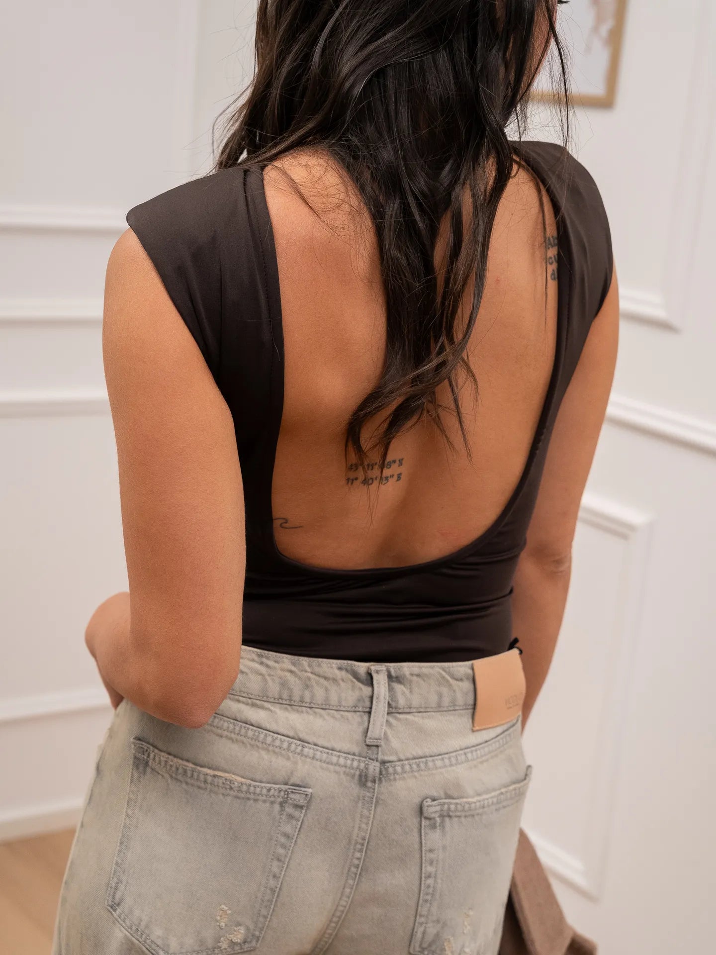 Body color moro Glamorous. Modello smanicato con schiena scoperta e spalline imbottite. Chiusura sul fondo con bottoni a pressione.