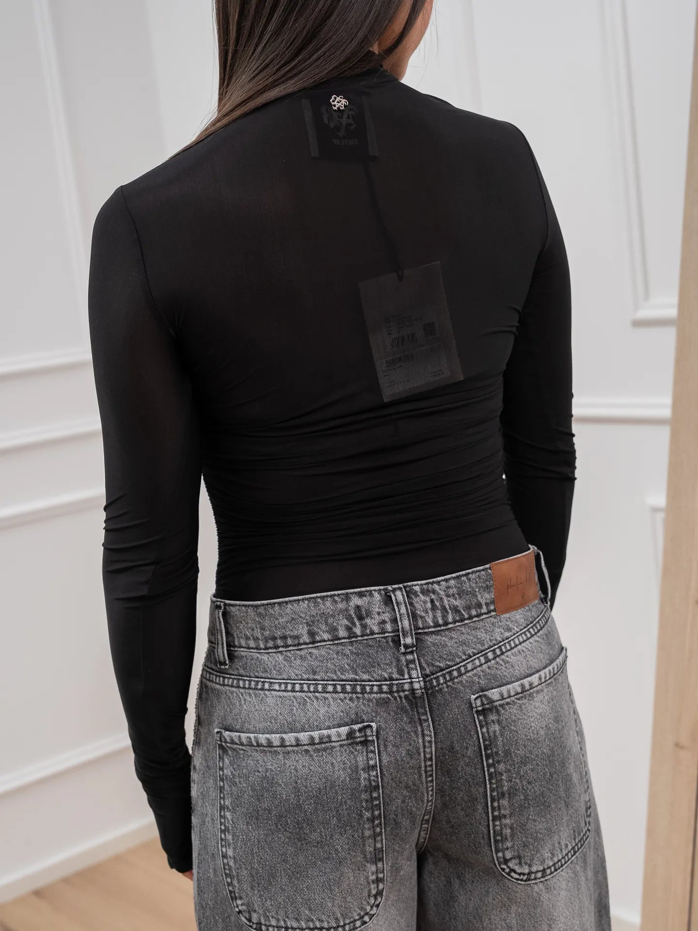 Body Scandal color nero Aniye By. Modello fit aderente con collo alto, dettaglio di arricciature laterali e manica lunga con manicotto. Chiusura sul fondo con bottoni a pressione.