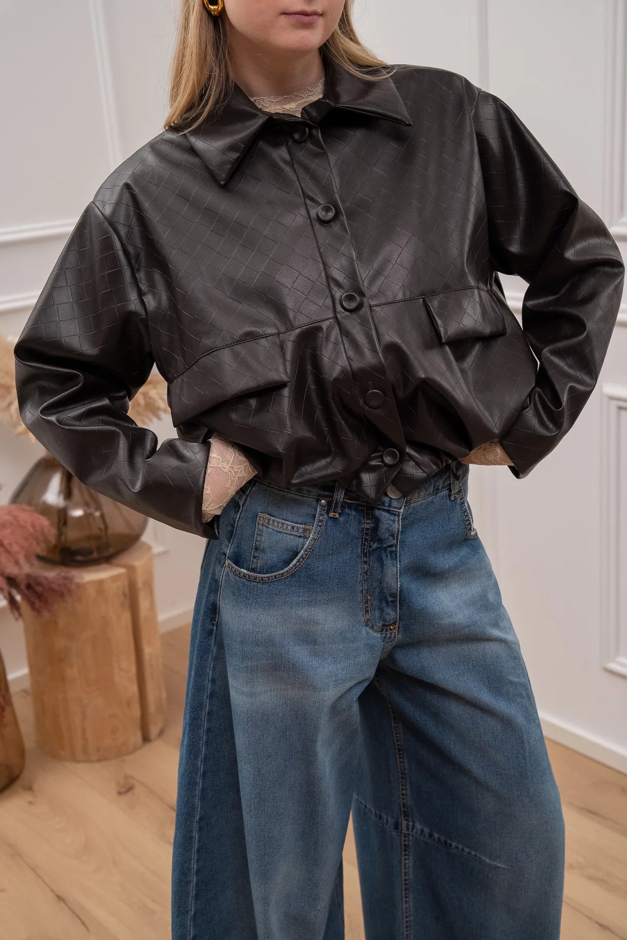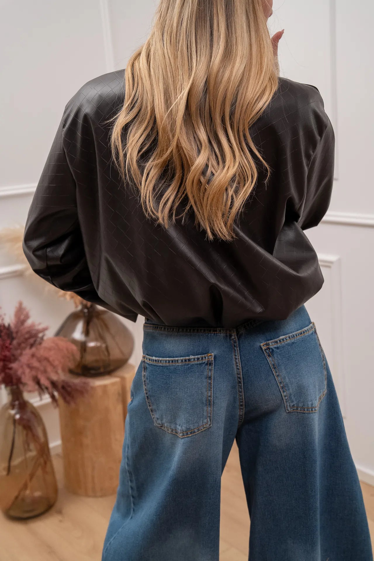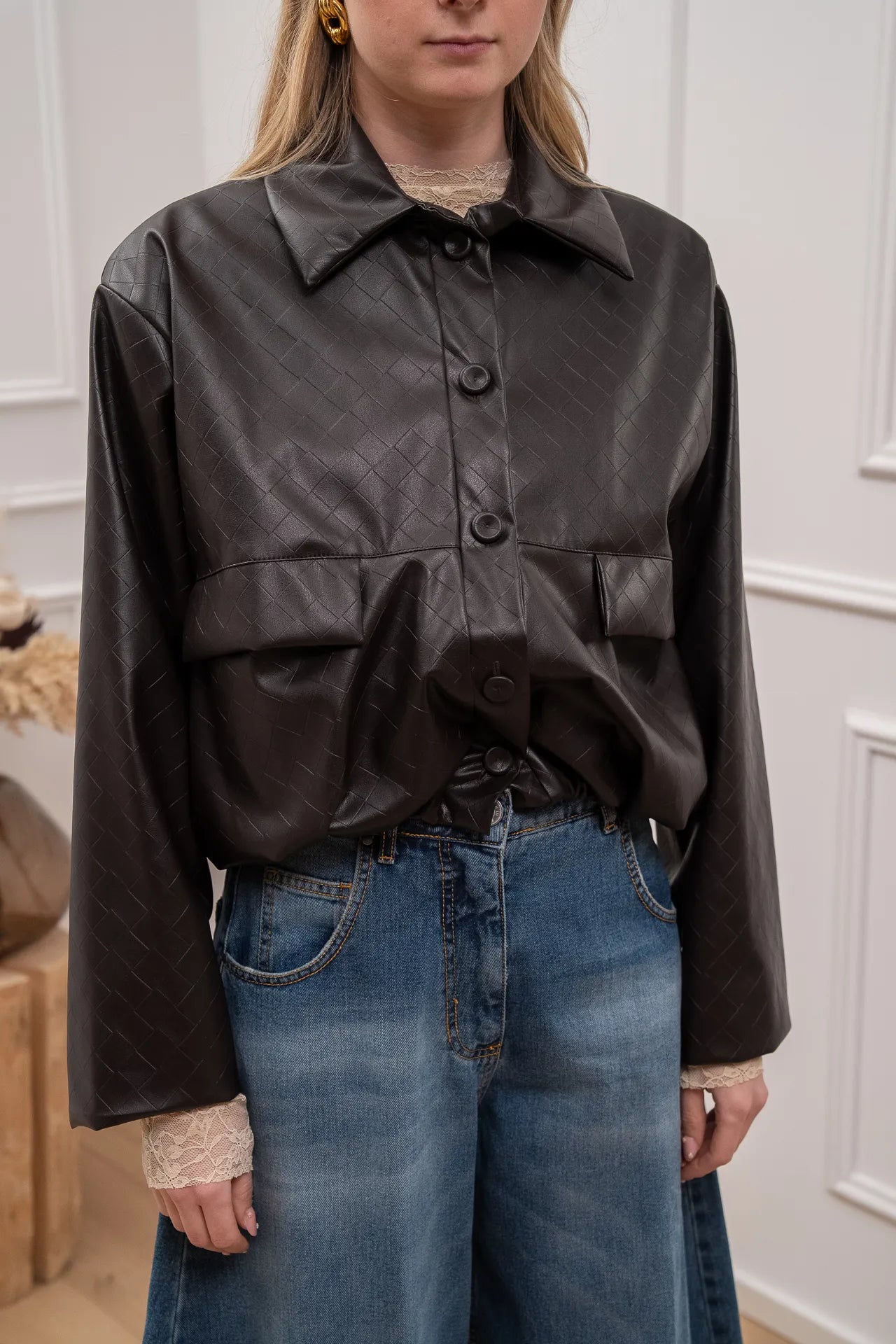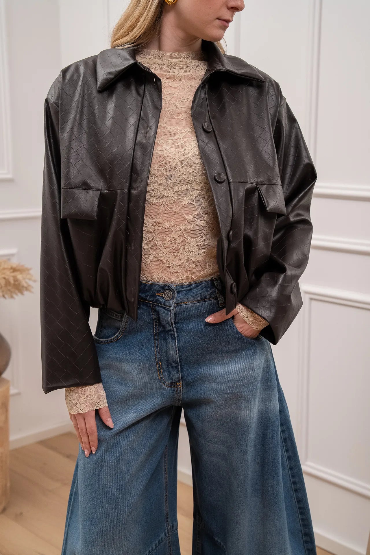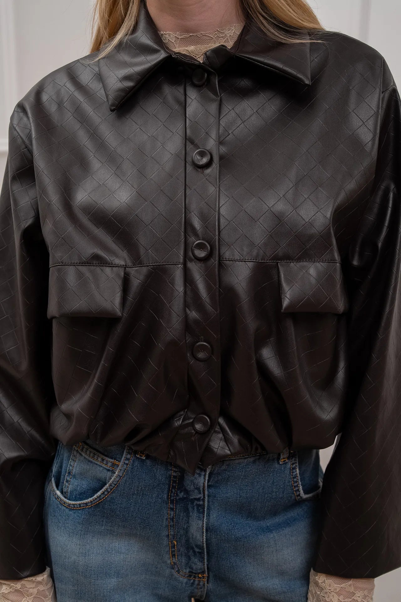 Bomber Icon color moro ecopelle effetto intrecciato Vicolo. Modello fit cropped con molla sul fondo, colletto e chiusura frontale con bottoni. Patte applicate frontali.