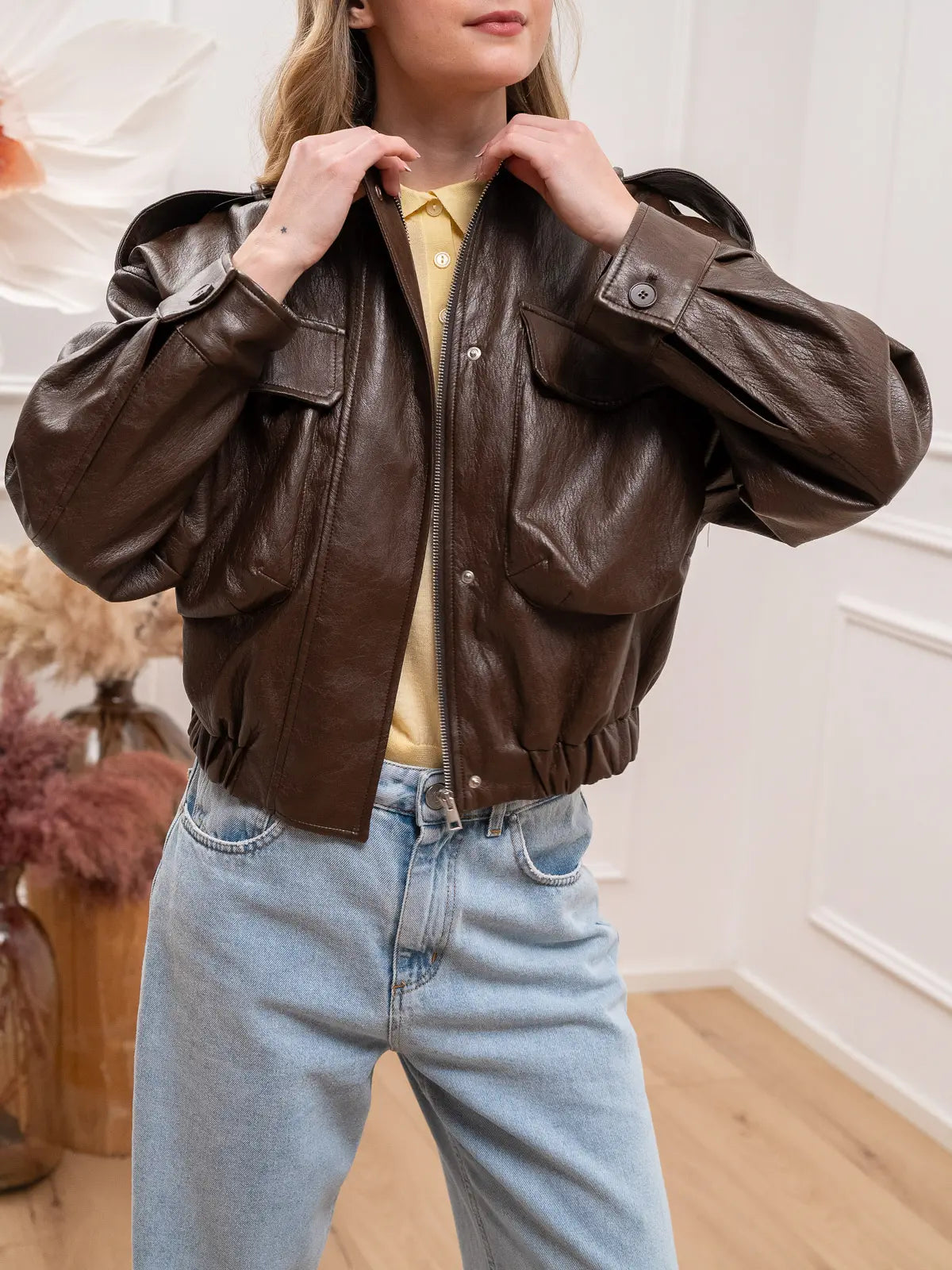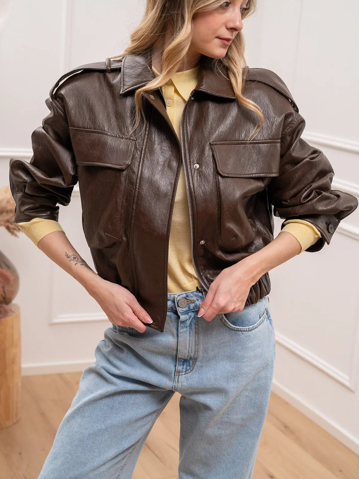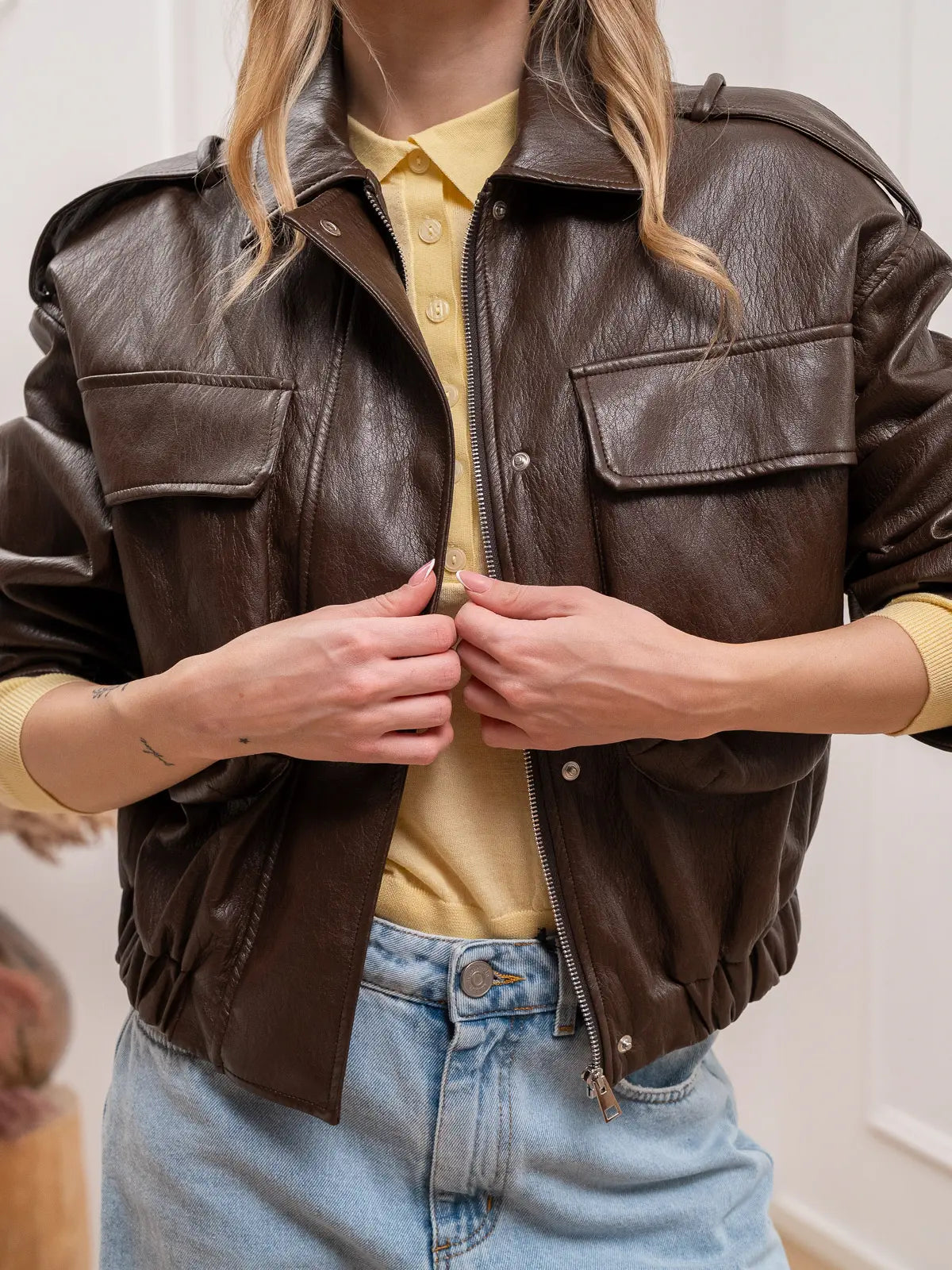 Bomber in ecopelle color cioccolato Vicolo. Modello fit cropped con elastico arricciato sul fondo. Tasconi frontali con patta e chiusura doppia con zip e bottoni a pressione. Manica lunga con polsino ampio e bottone.
