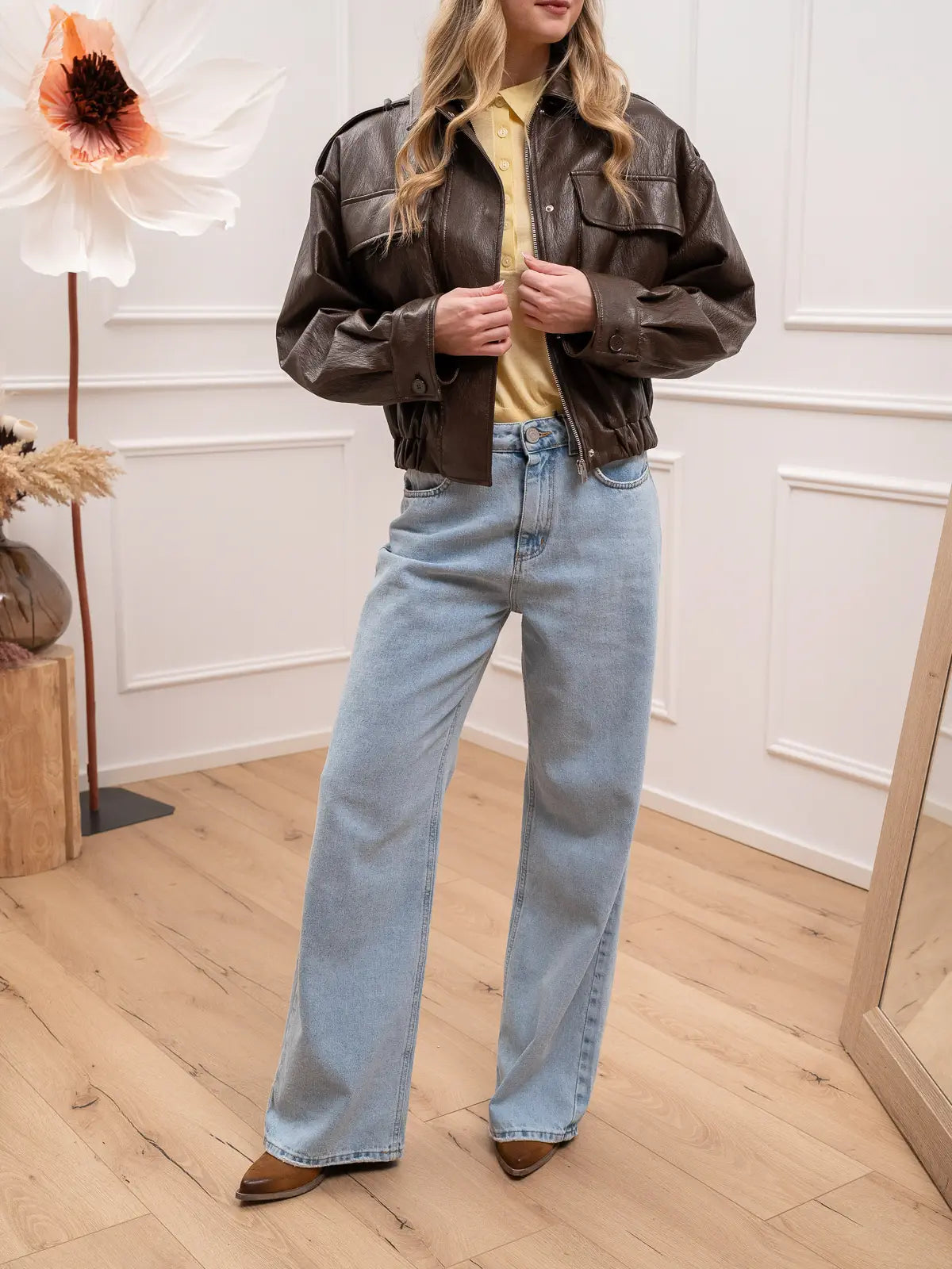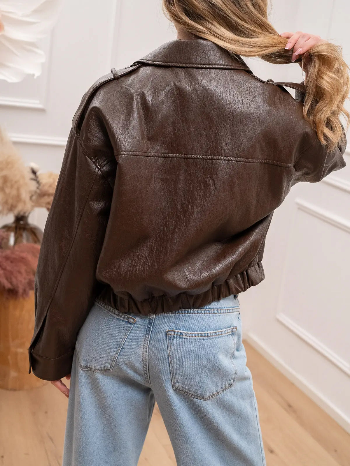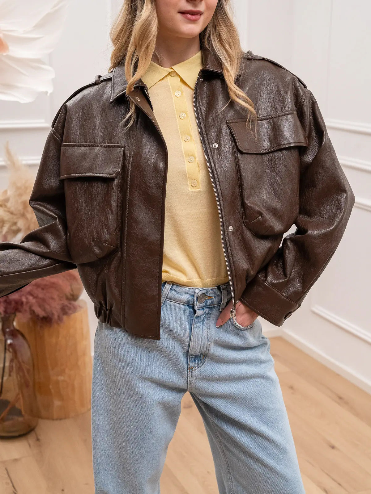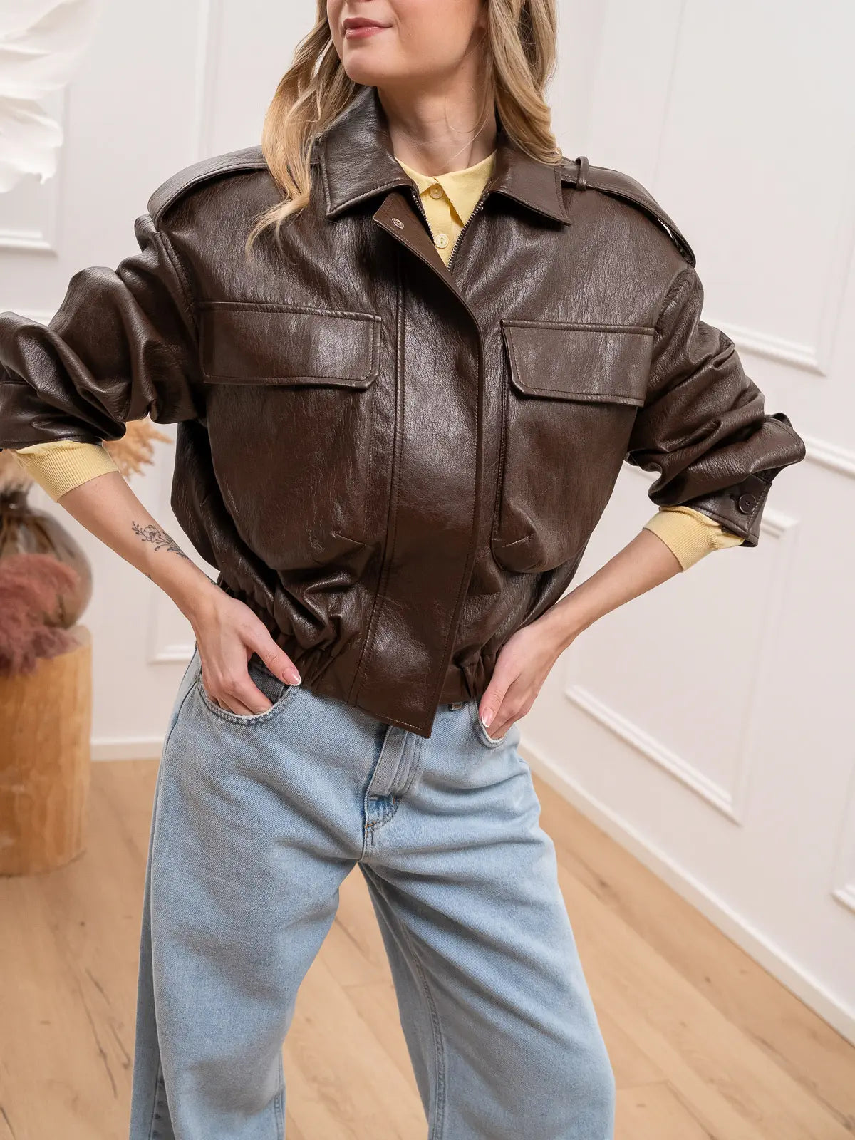 Bomber in ecopelle color cioccolato Vicolo. Modello fit cropped con elastico arricciato sul fondo. Tasconi frontali con patta e chiusura doppia con zip e bottoni a pressione. Manica lunga con polsino ampio e bottone.