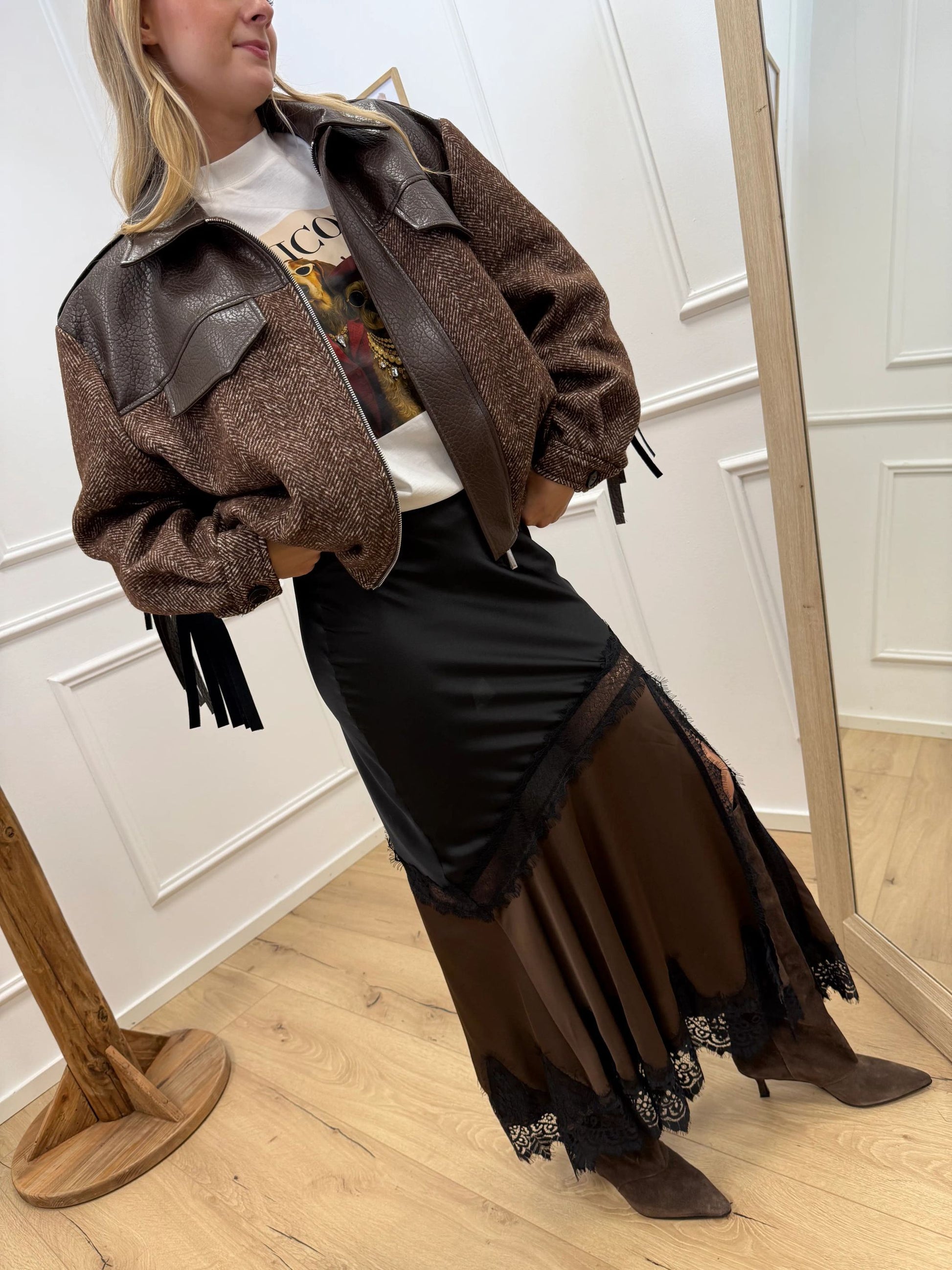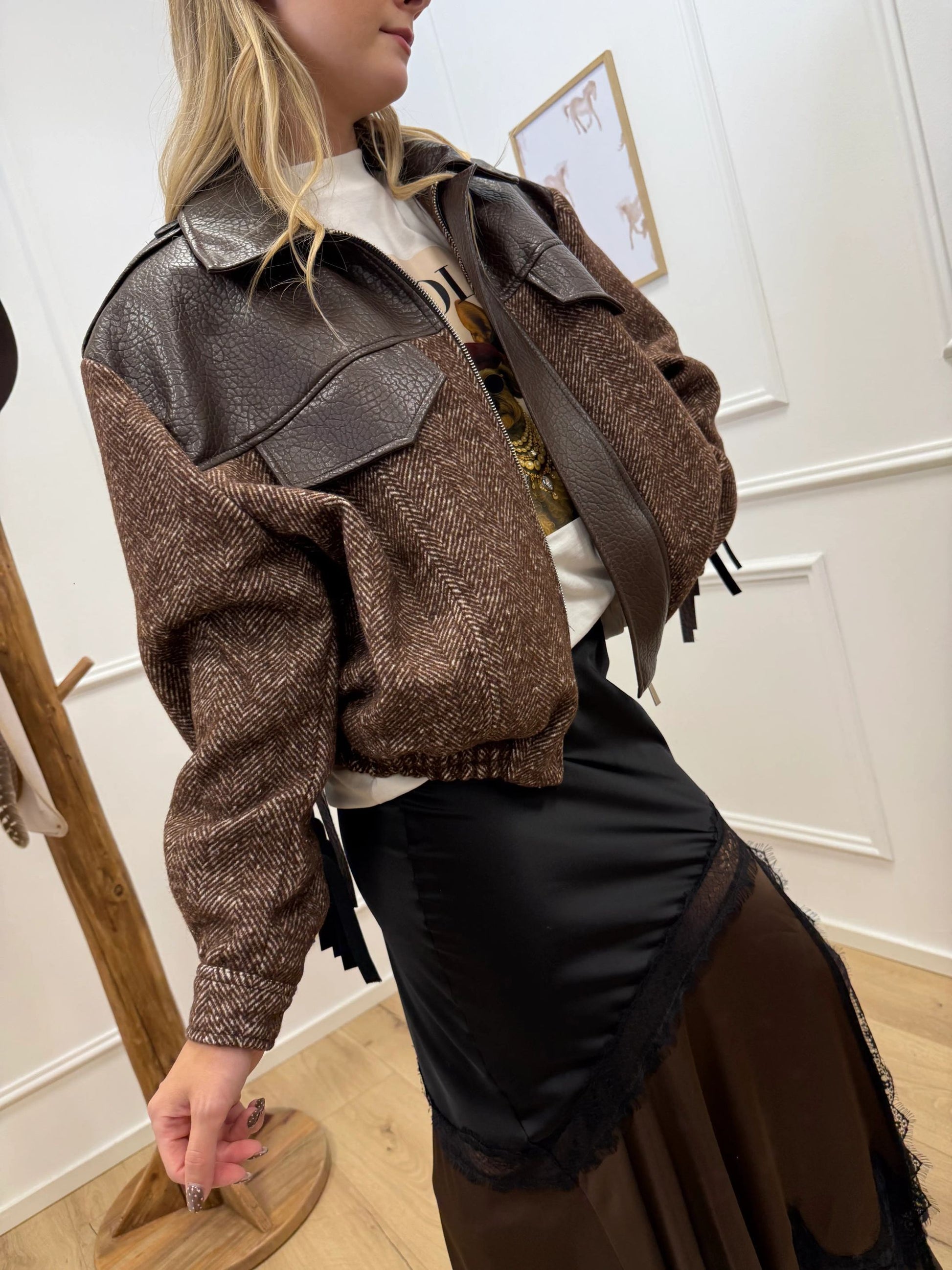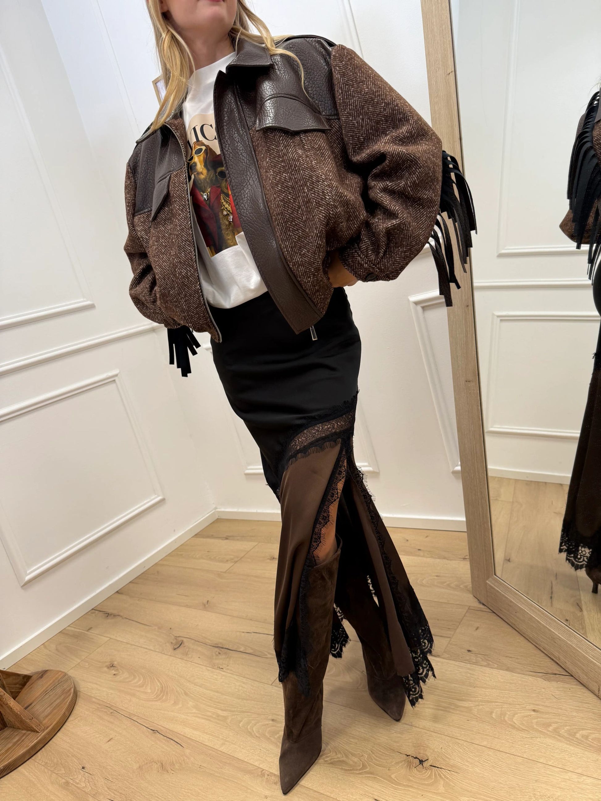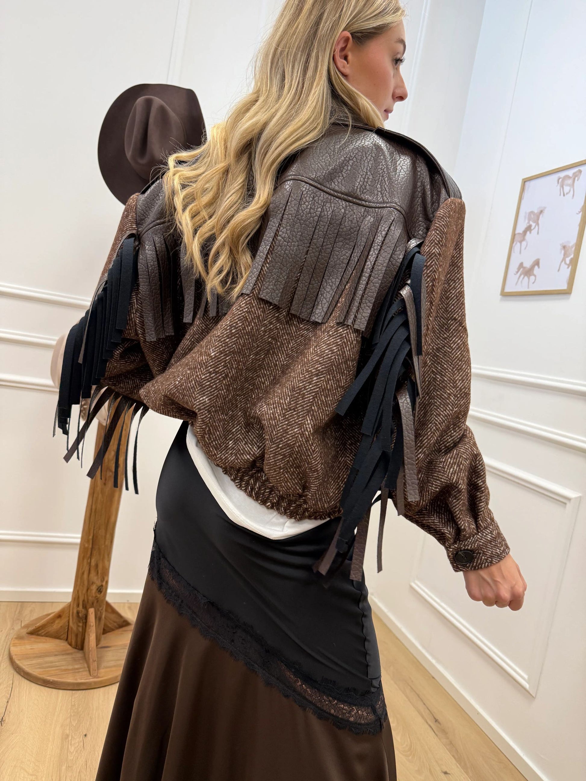 Bomber in ecopelle e lana moro con frange - HaveOne