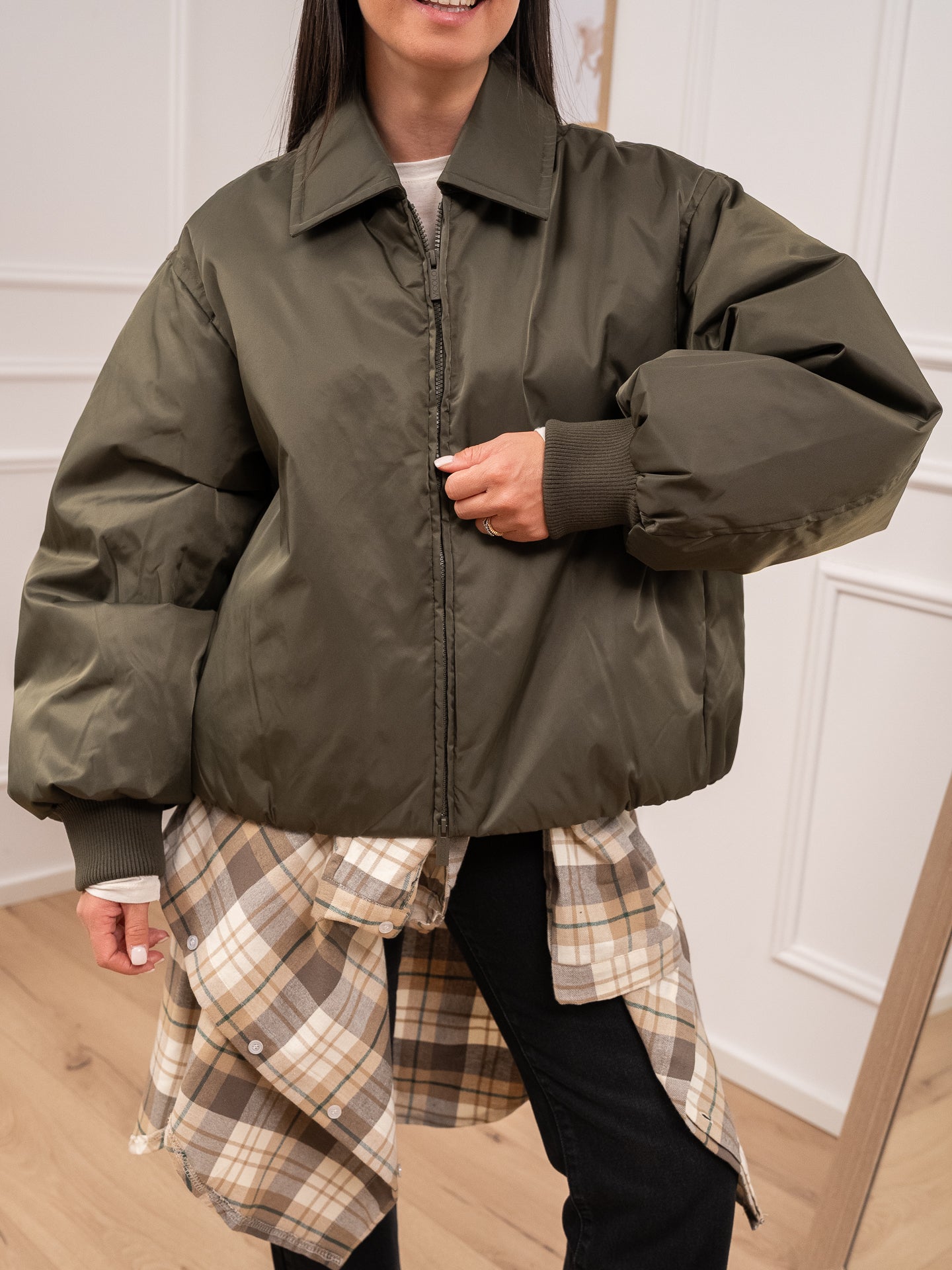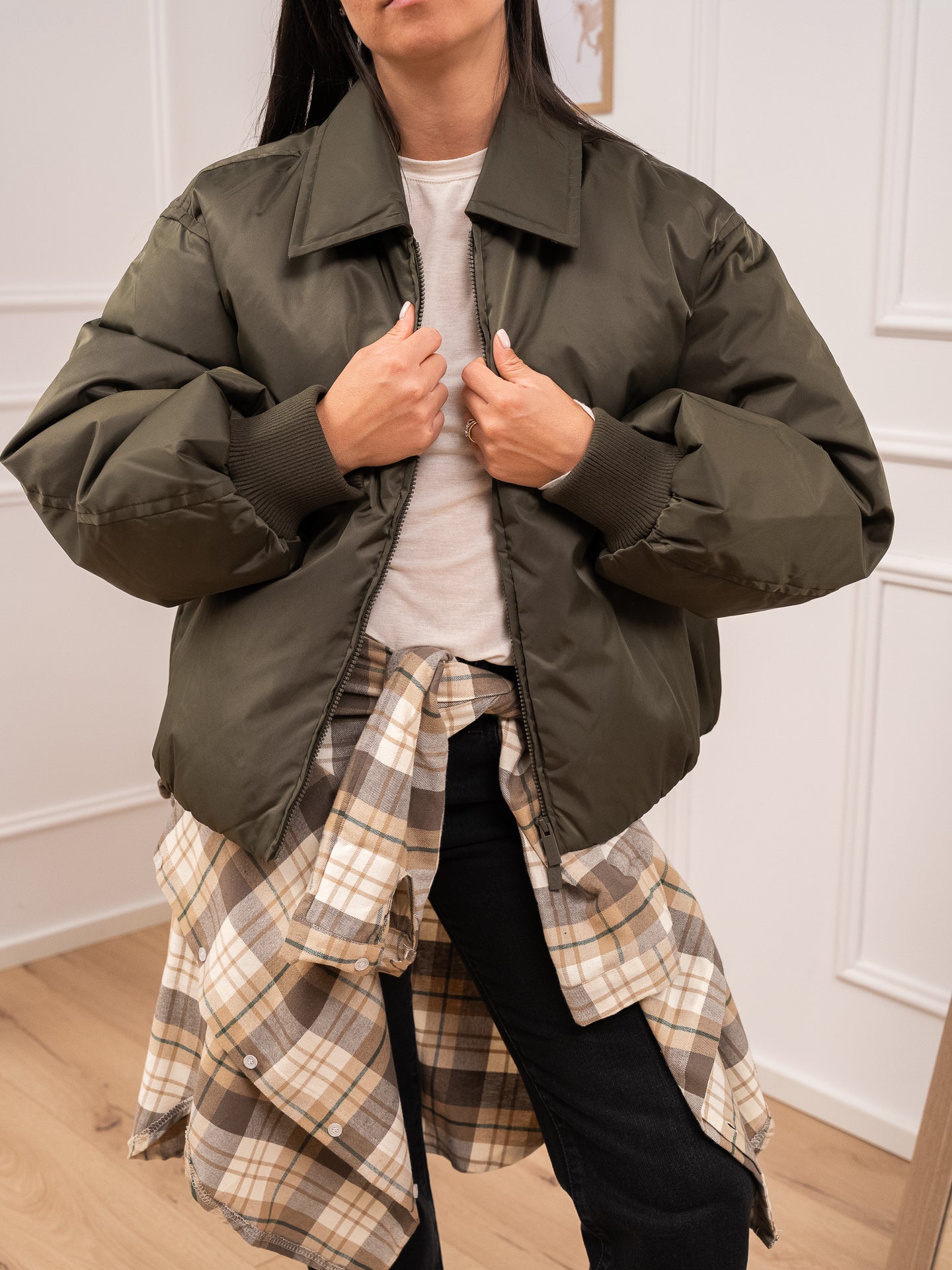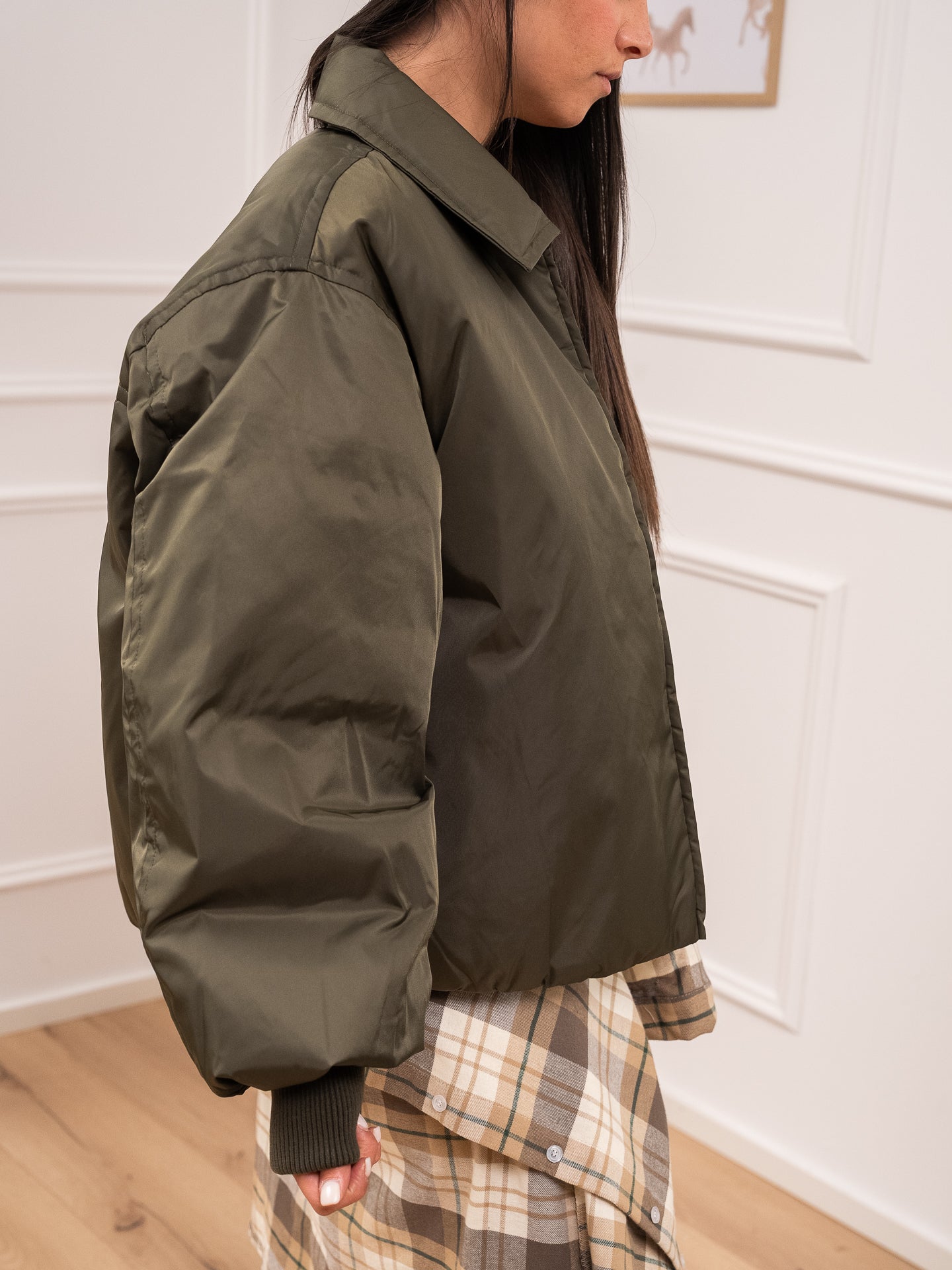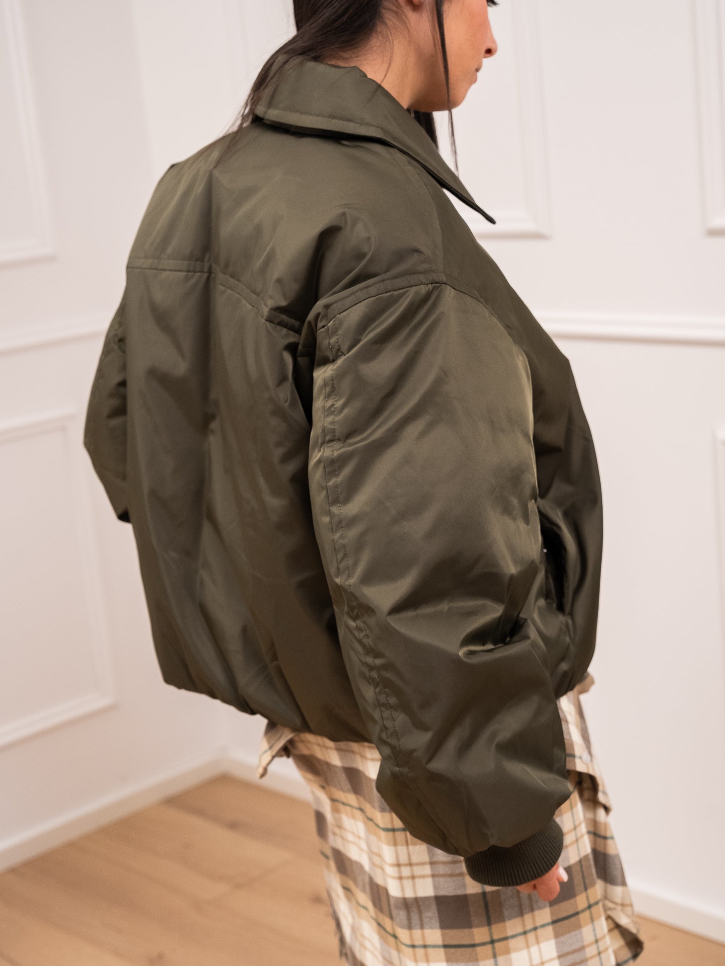 Bomber in nylon color militare Vicolo. Modello con colletto e chiusura frontale con zip. Elastico interno sul fondo. Manica con polsino elasticizzato sul fondo. Tasche a filetto con bottoncino a pressione.