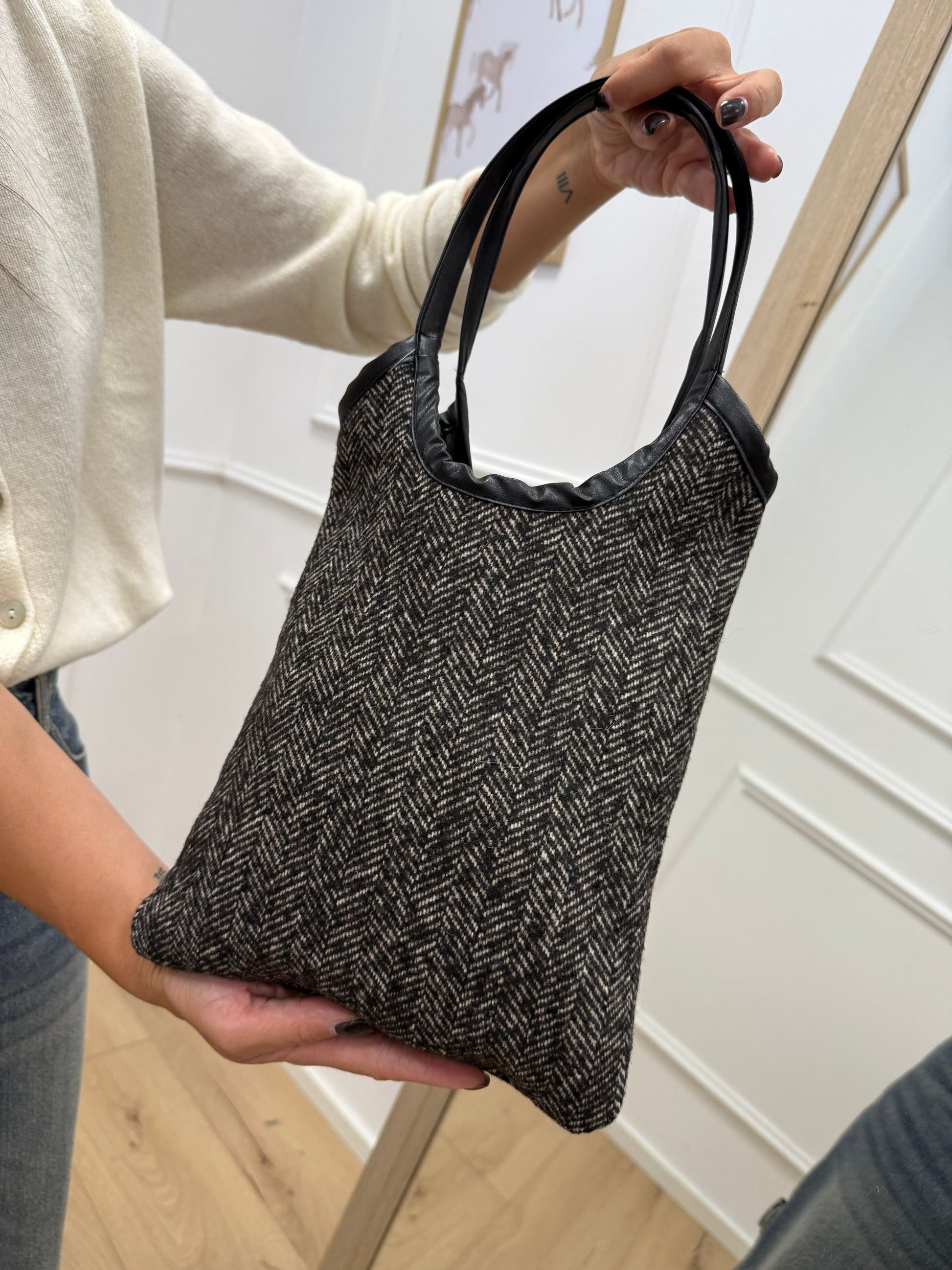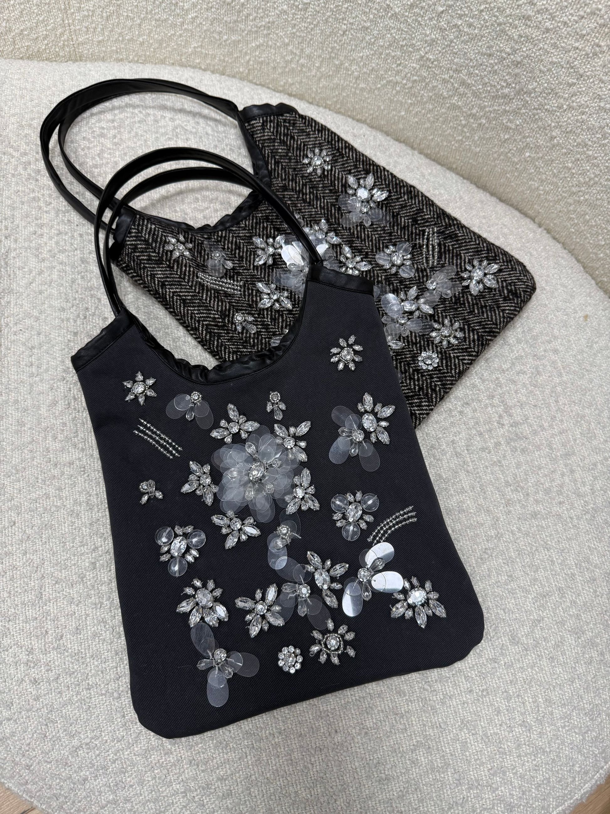 Borsa boho color grigio piombo HaveOne. Modello a sacchetto con doppio manico, finiture in ecopelle nera e dettaglio di ricami gioiello frontali.