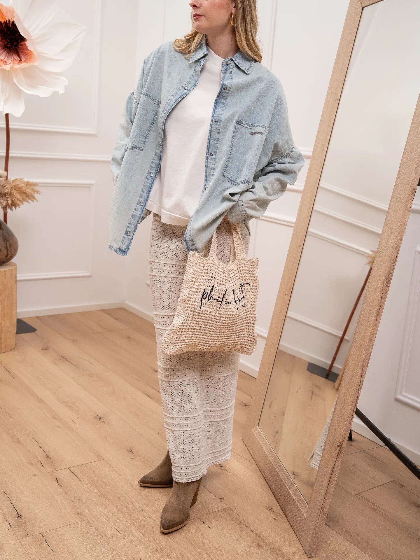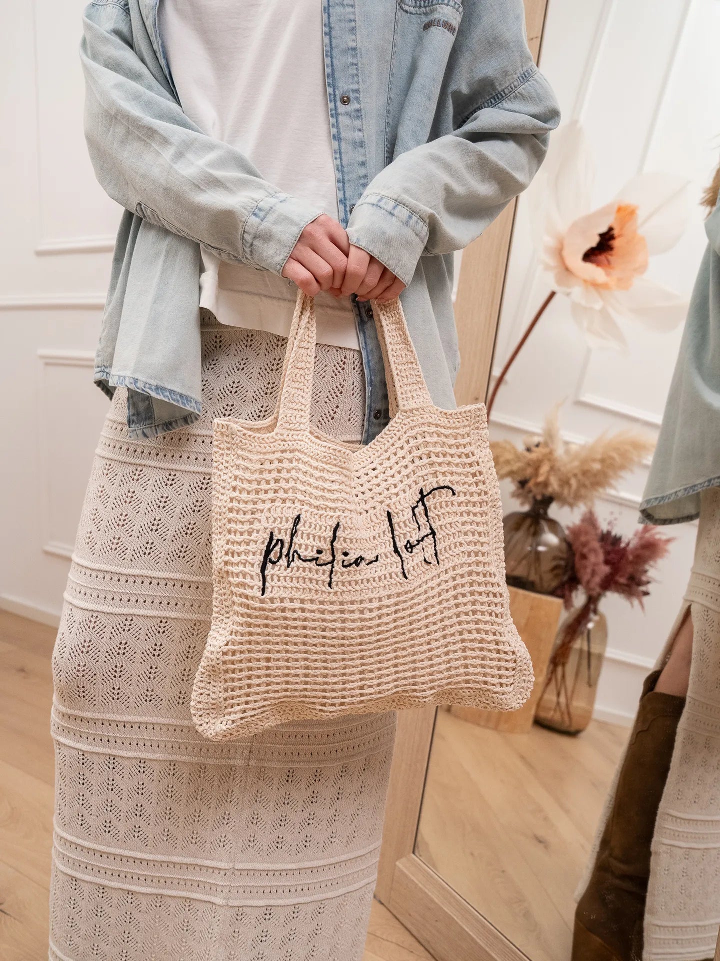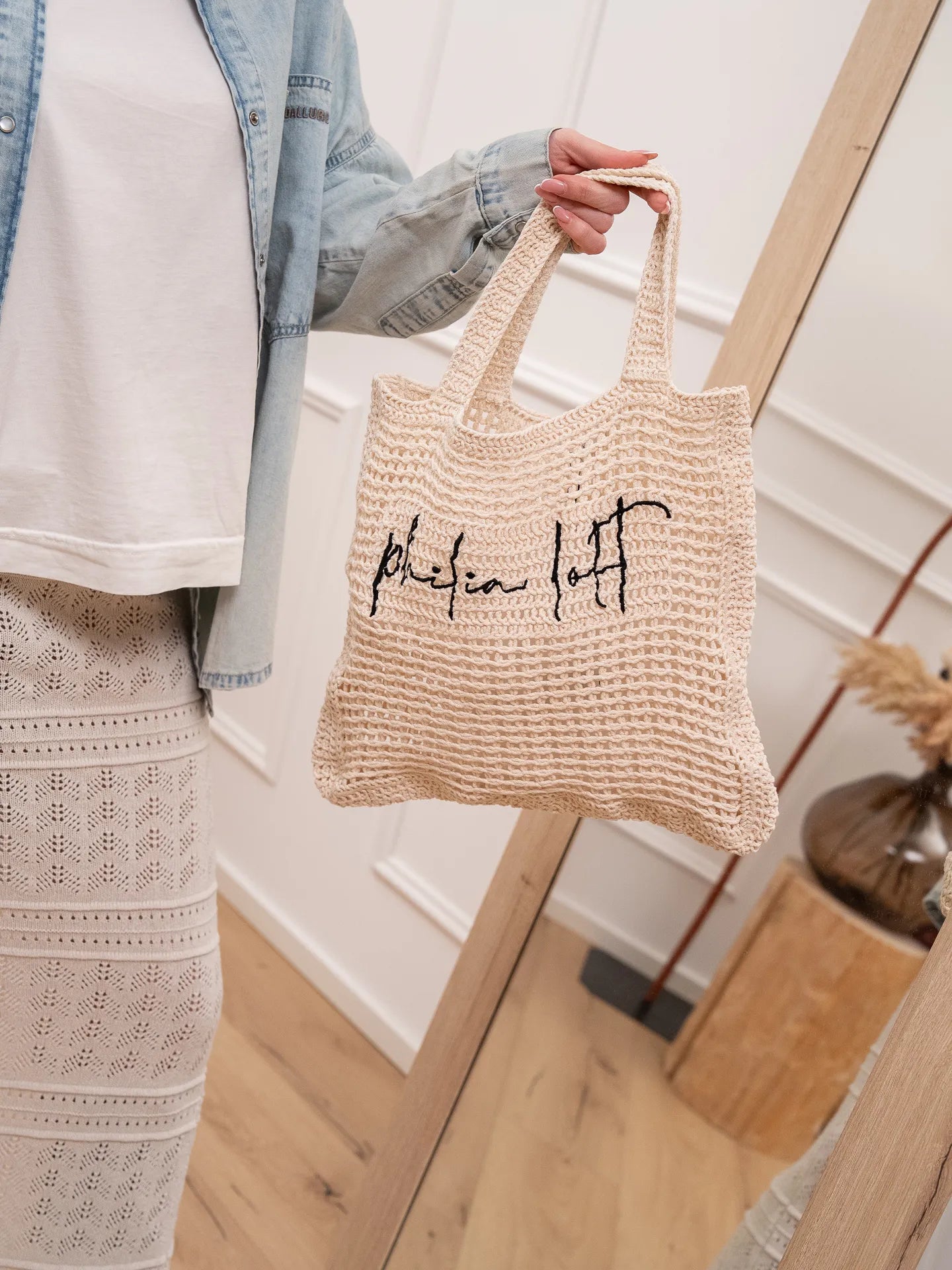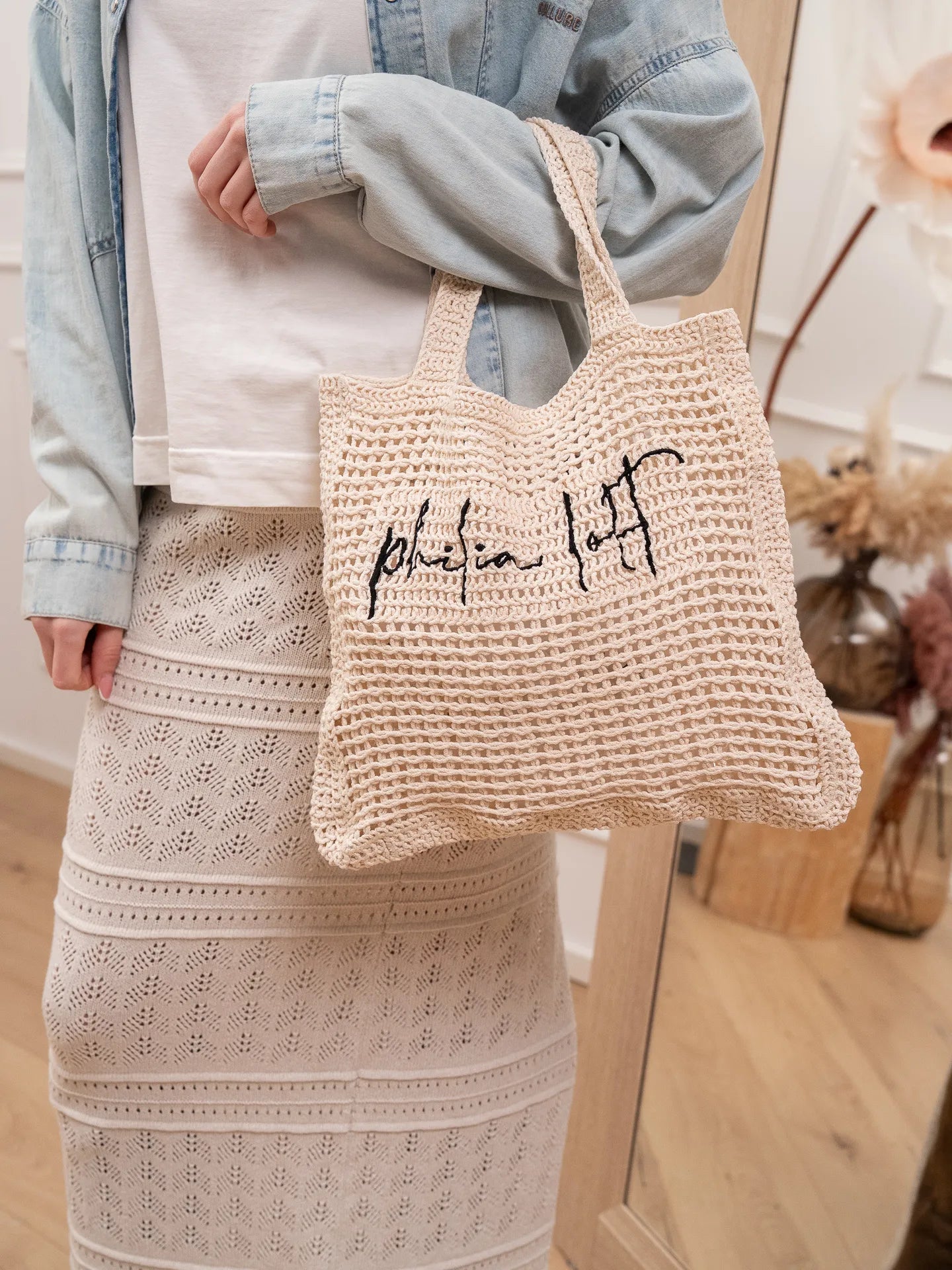 Borsa crochet color naturale Philia Loft. Modello shopper con doppio manico. Logo a contrasto frontale.