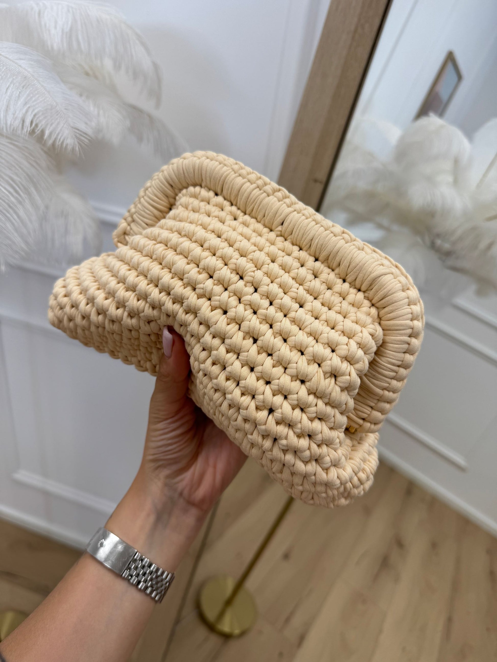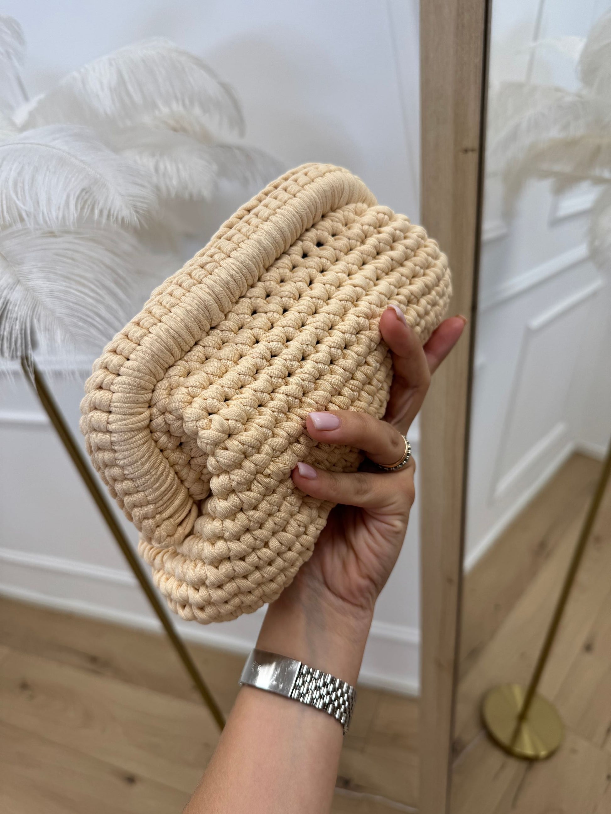 Borsa crochet color skin in tessuto. Modello forma pasticcino con chiusura centrale.