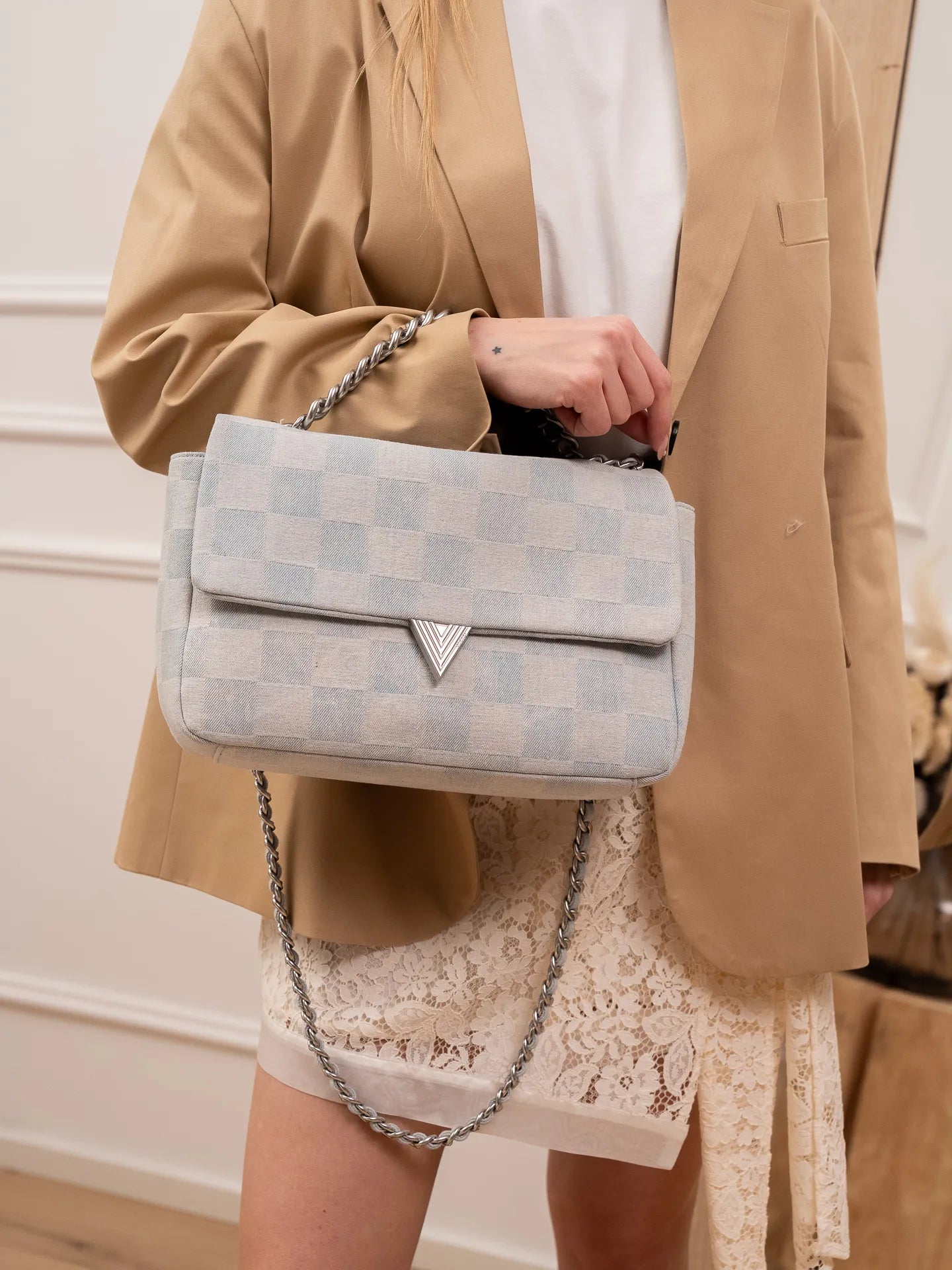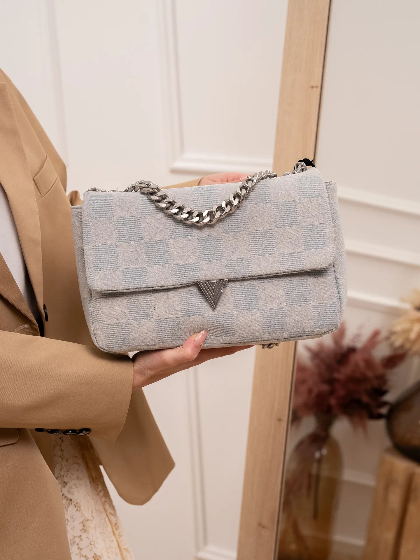 Borsa Dama a tracolla in denim tessuto a scacchi Vicolo. Chiusura a pattina con bottone a pressione con calamita. Dettaglio fibbia V in metallo. Tracolla con catena fissa con tessuto denim passante. Manico fisso con catena. La borsa può essere indossata sia come borsa a spalla che come borsa a mano. Tasca interna con cerniera e taschina piatta.