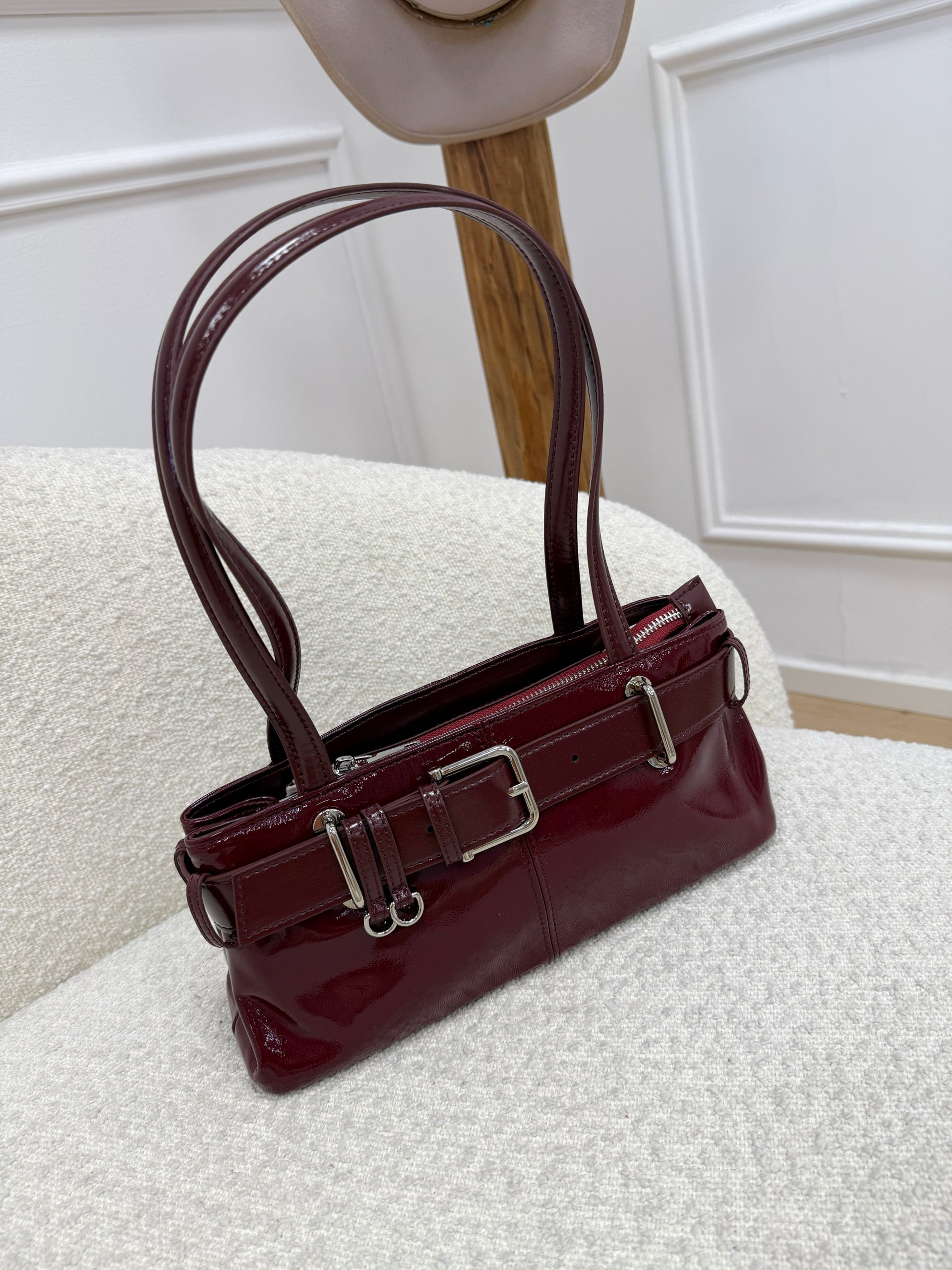 Borsa Glossy lucida. Modello lungo stile baguette con doppio manico per portarla a mano. Chiusura zip e dettaglio di cinturina con fibbia. Piccole tasche interne.