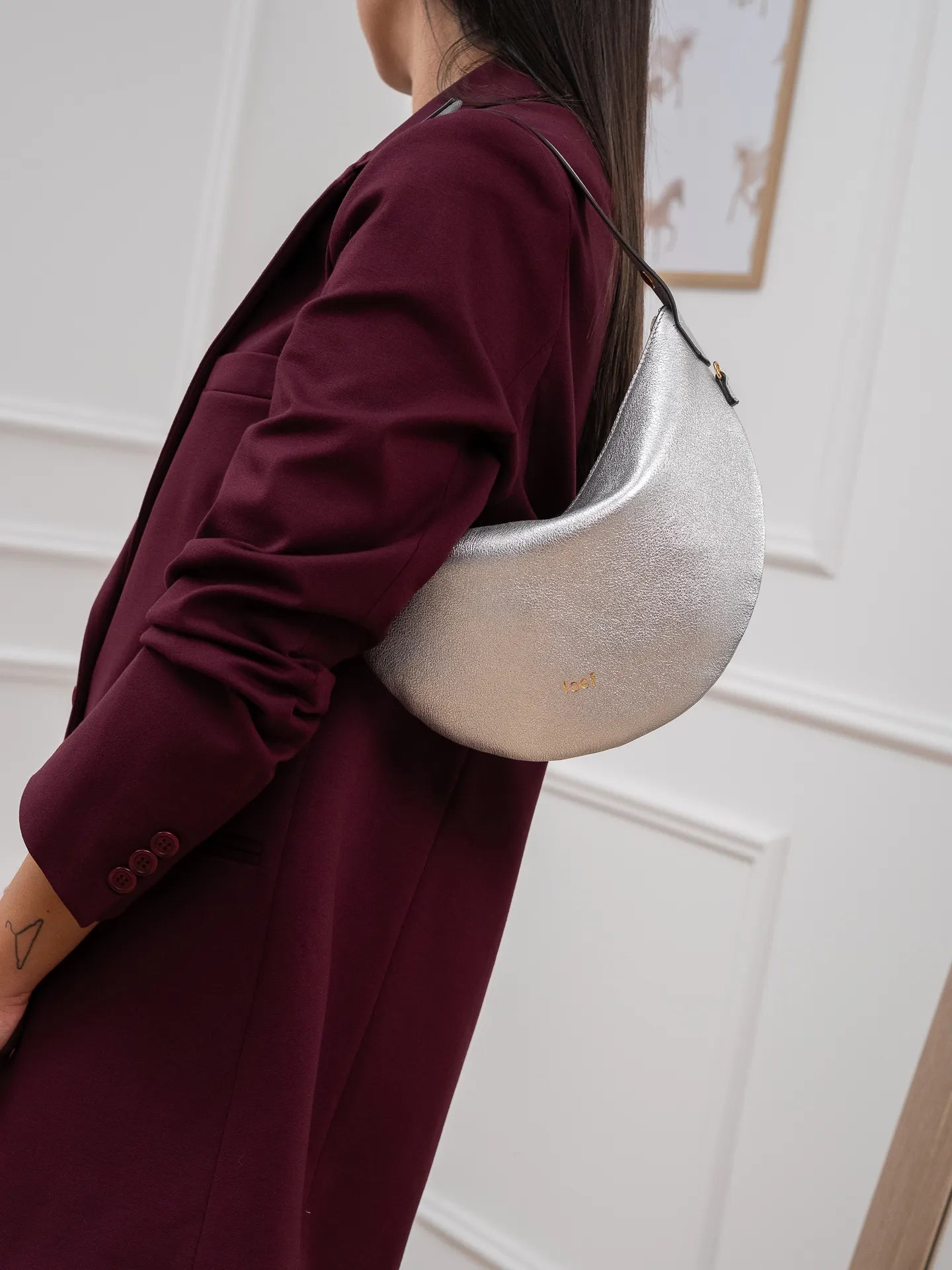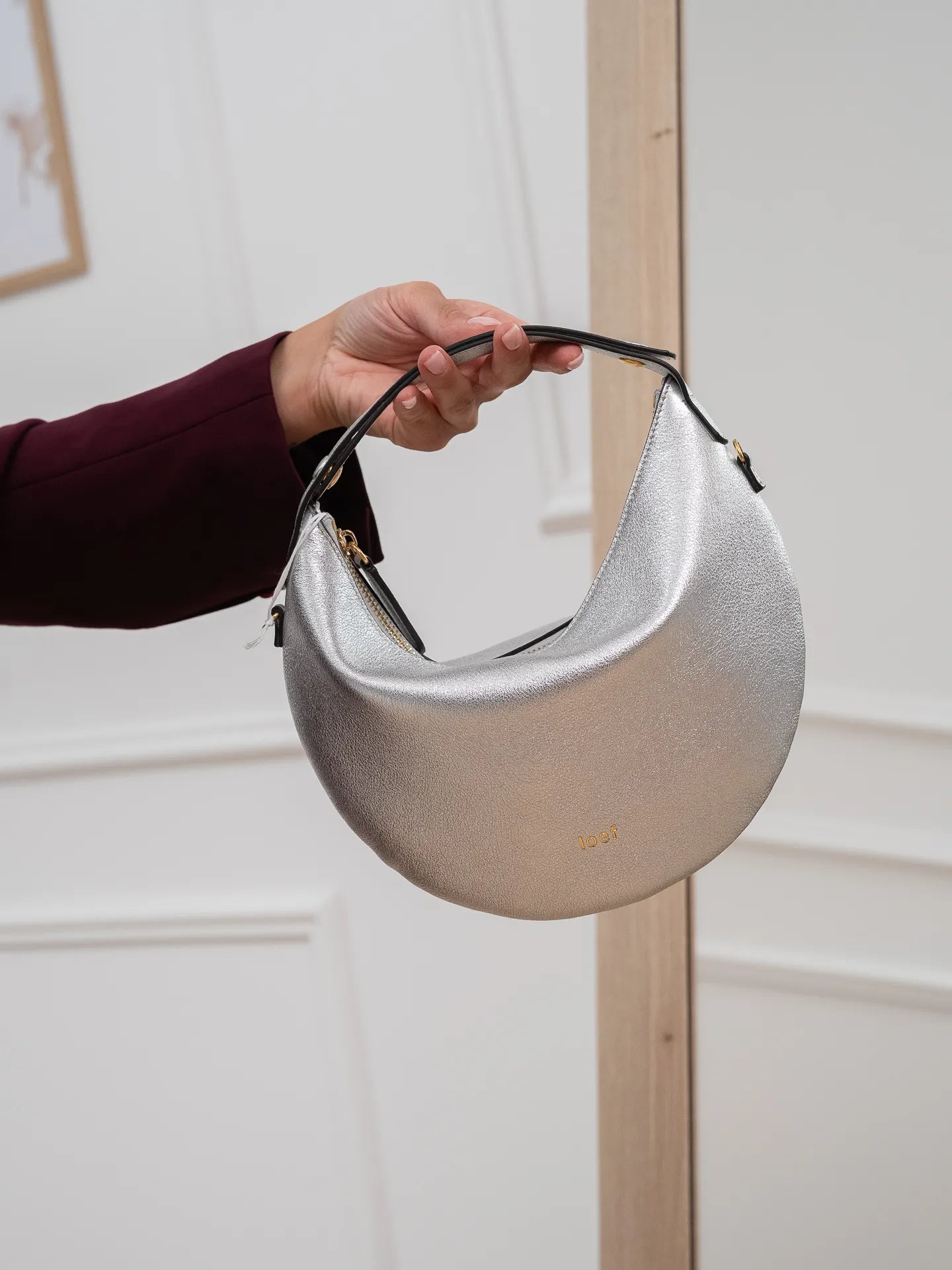 Borsa "Lula" in pelle laminata color argento Ioef. Modello mini bag dalla forma a mezzaluna morbida, manico che si apre e una tracolla rimovibile. Borsa a mano, spalla o tracolla. Chiusura con zip e fodera interna in cotone, unico scomparto.