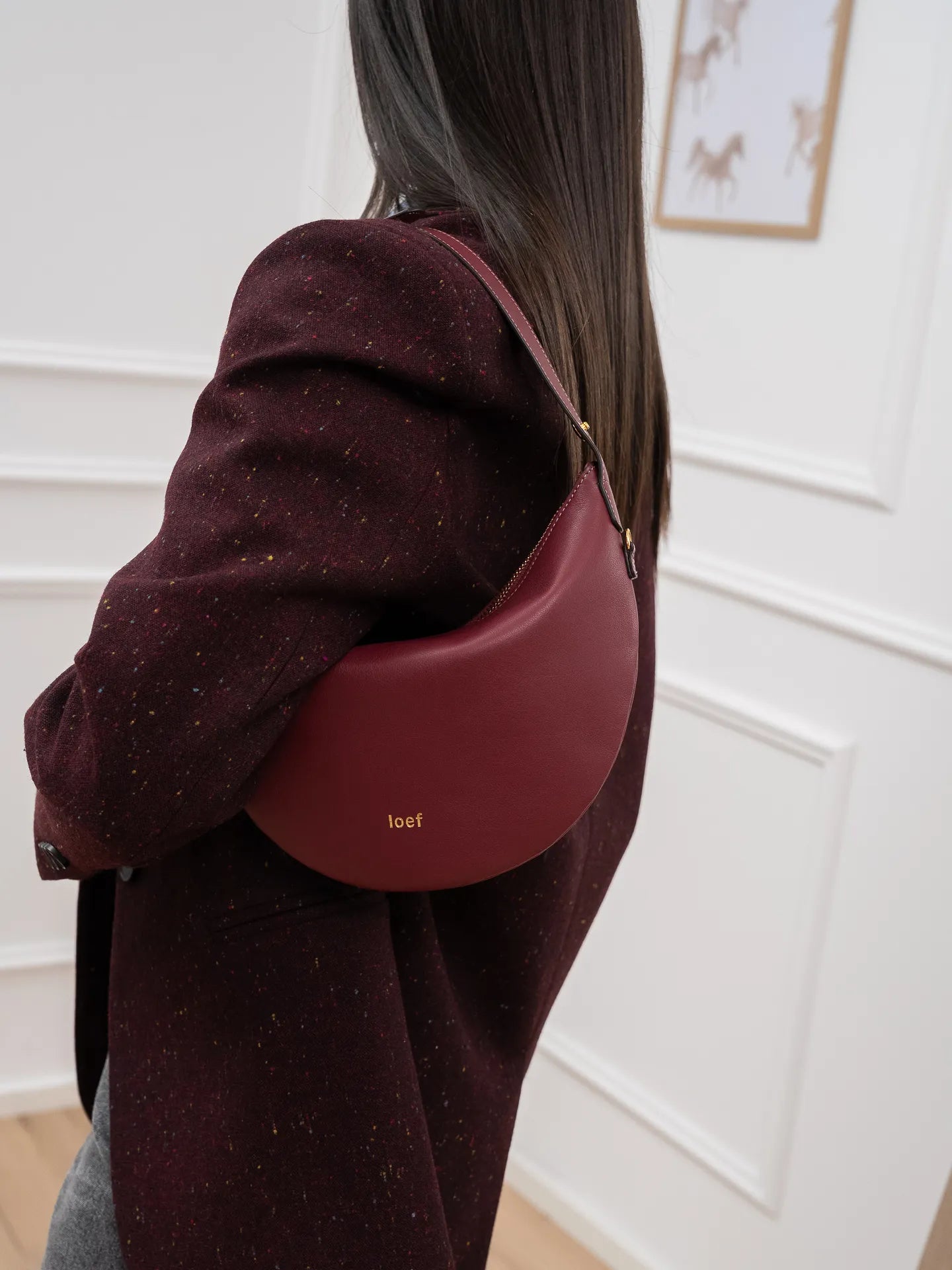 Borsa "Lula" in pelle nabuk color rubino Ioef. Modello mini bag dalla forma a mezzaluna morbida, manico che si apre e una tracolla rimovibile. Borsa a mano, spalla o tracolla. Chiusura con zip e fodera interna in cotone, unico scomparto.