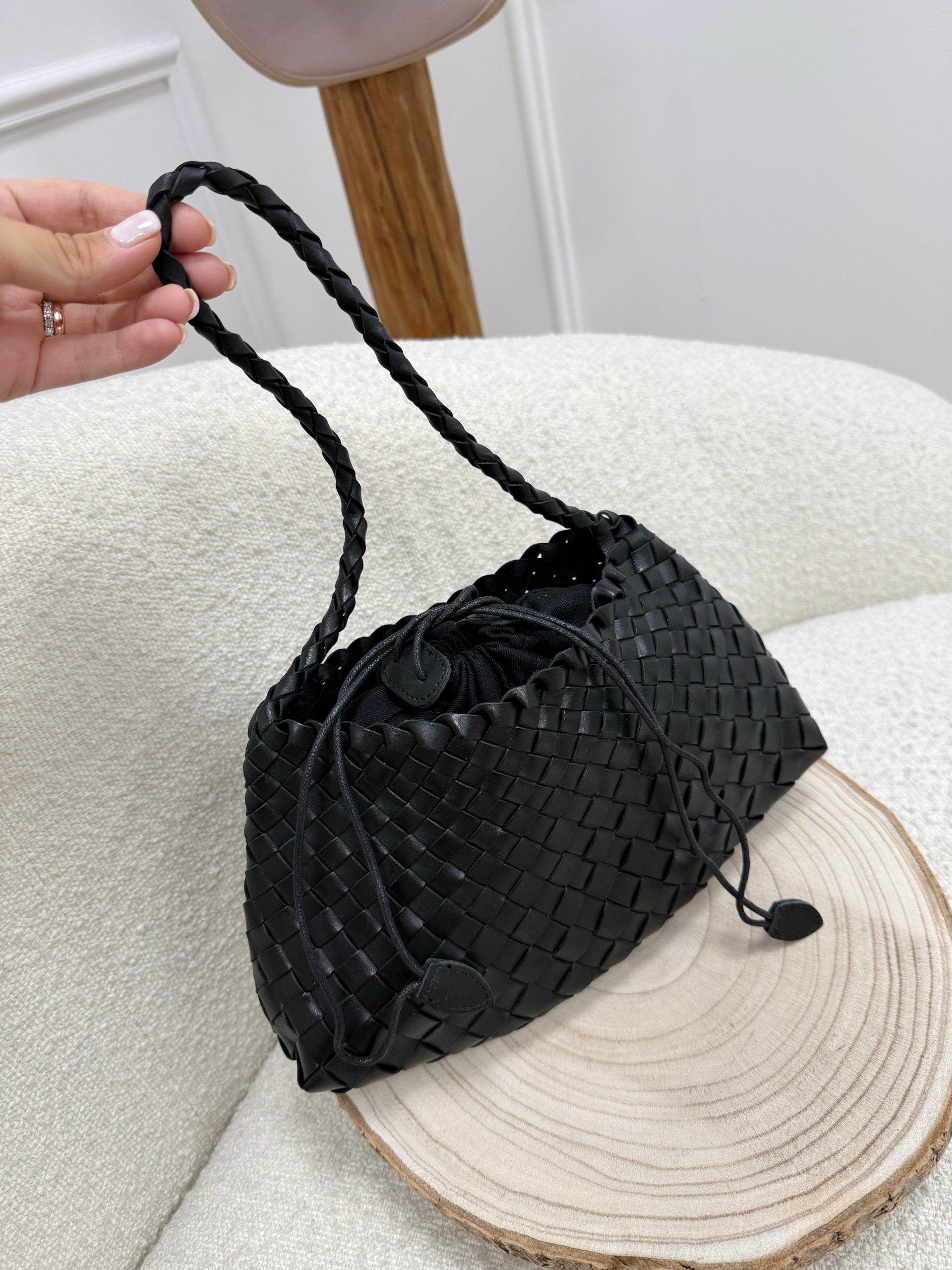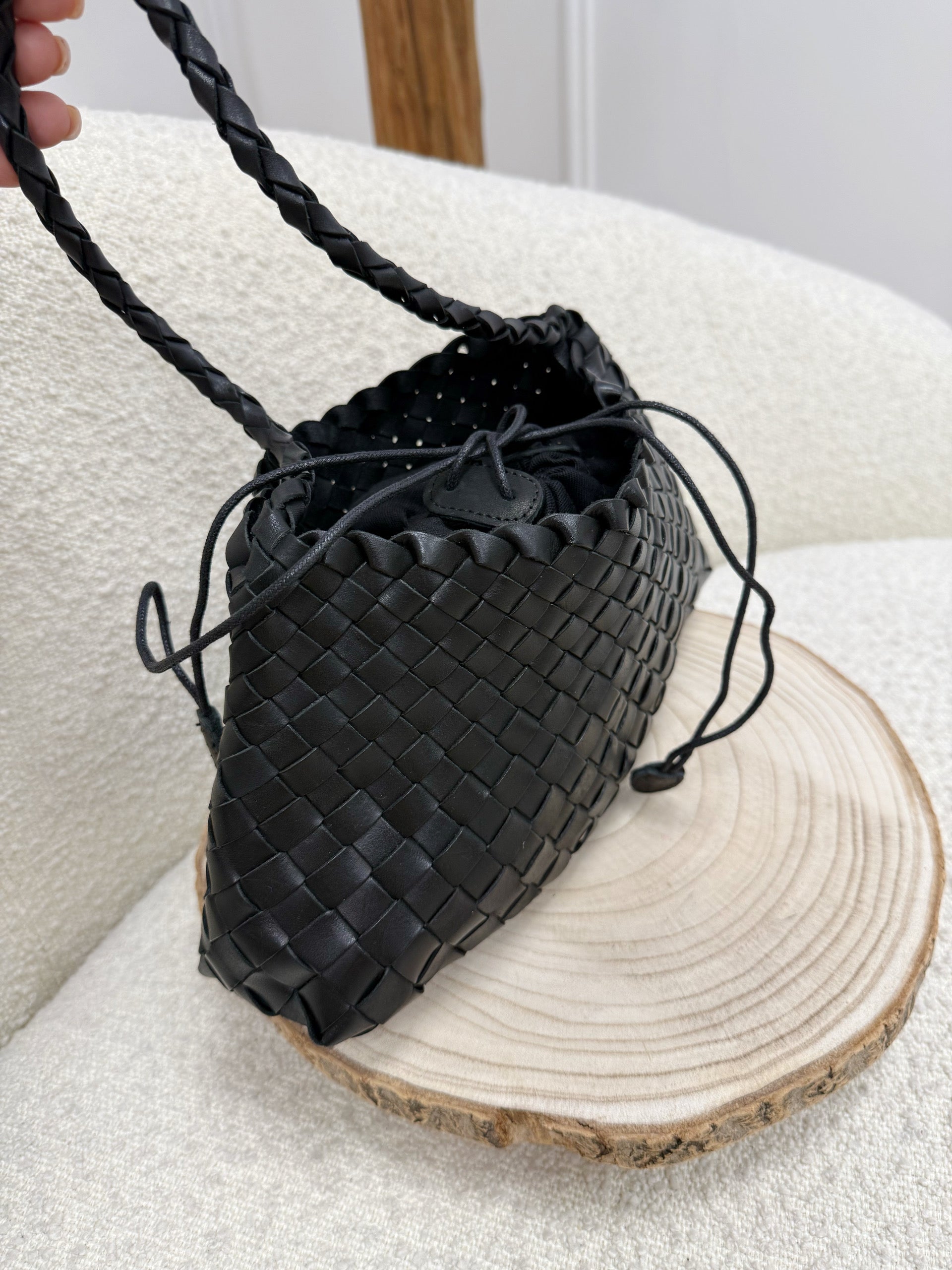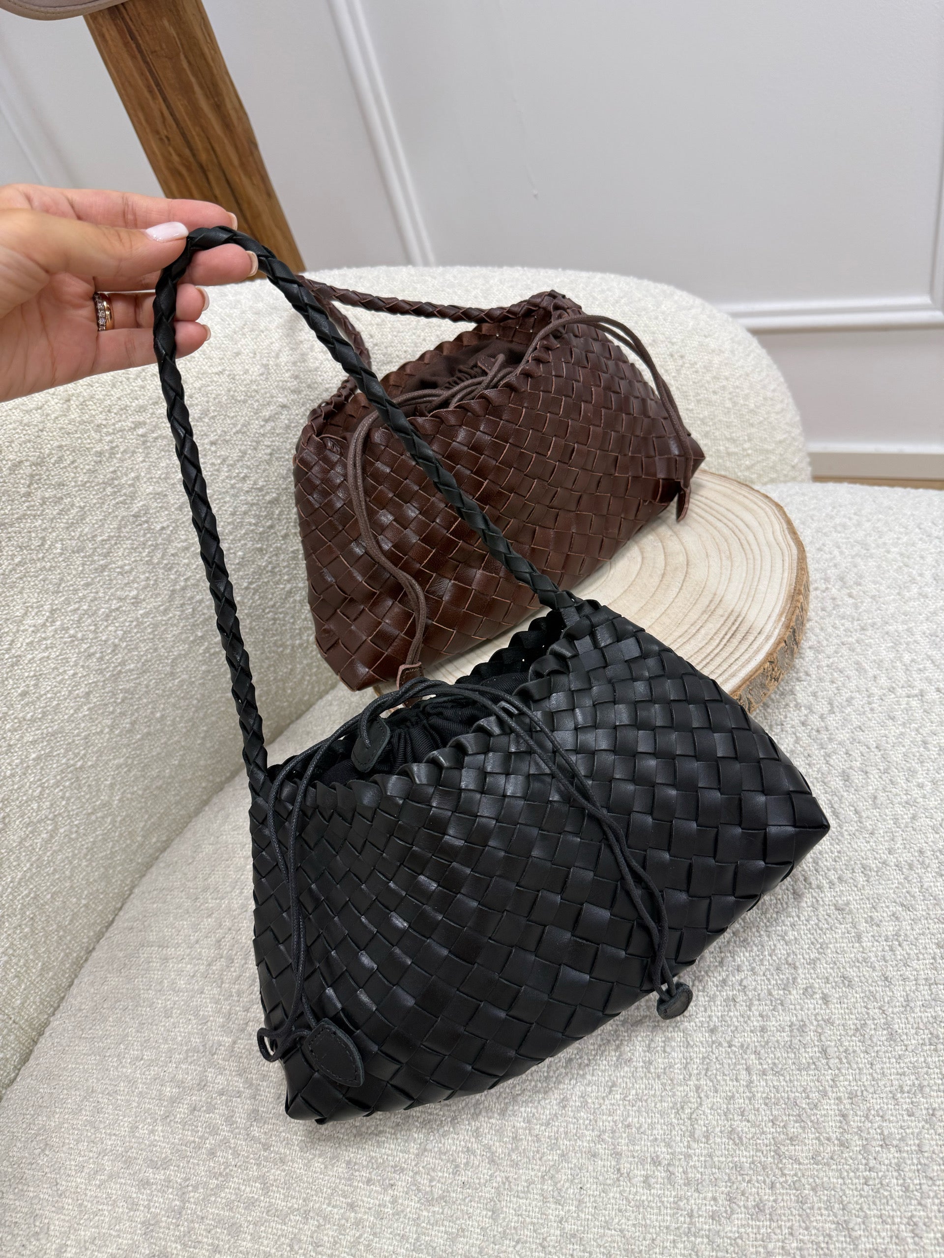 Borsa Naya intrecciata. Modello midi, sacchetto interno con taschine e coulisse. Doppio manico per portarla a mano.