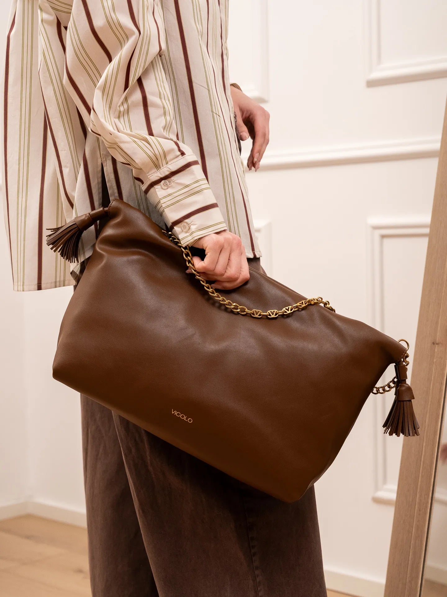 Borsa Tassel maxi in ecopelle Vicolo. Modello con dettaglio di rouches sul bordo. Chiusura con bottoni a pressione con calamita e coulisse in ecopelle con nappine. Dettaglio tracolla catena V in metallo. Tasca interna con cerniera e taschina piatta. Dettagli in metallo color oro.