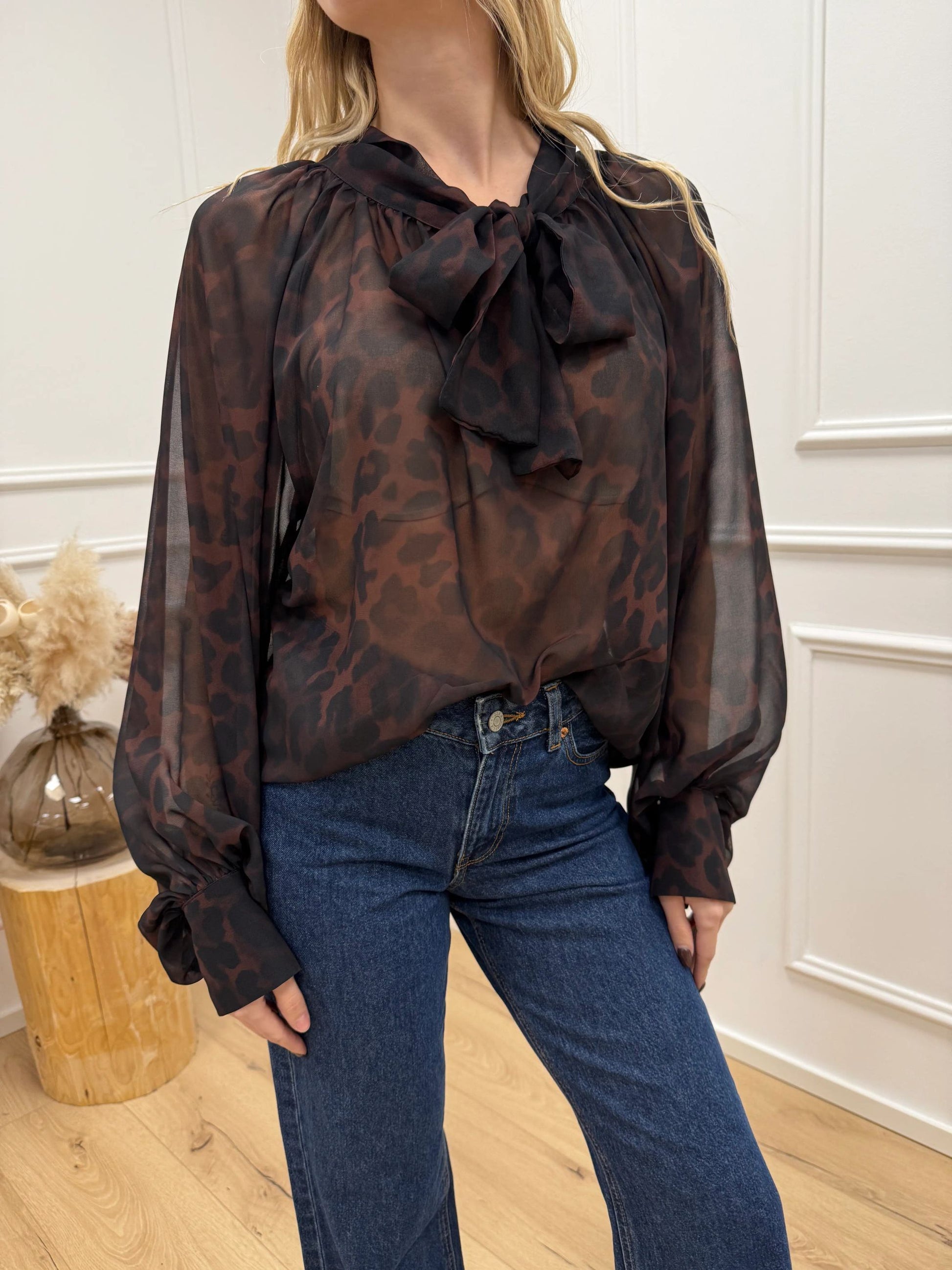 Camicia fantasia maku Kontatto. Modello fit regolare morbido con maxi fiocco al collo. Manica lunga balloon con polsino sul fondo.
