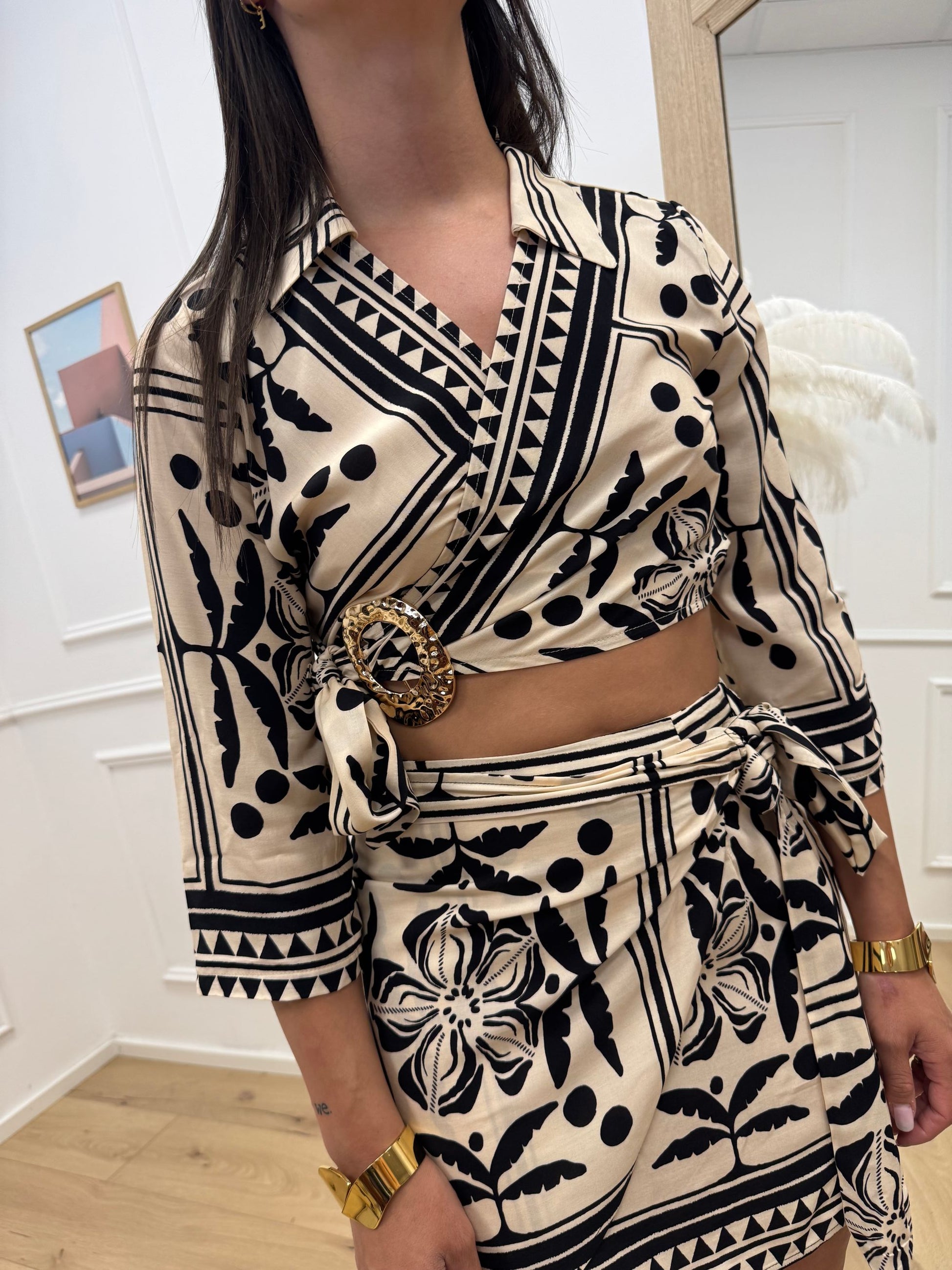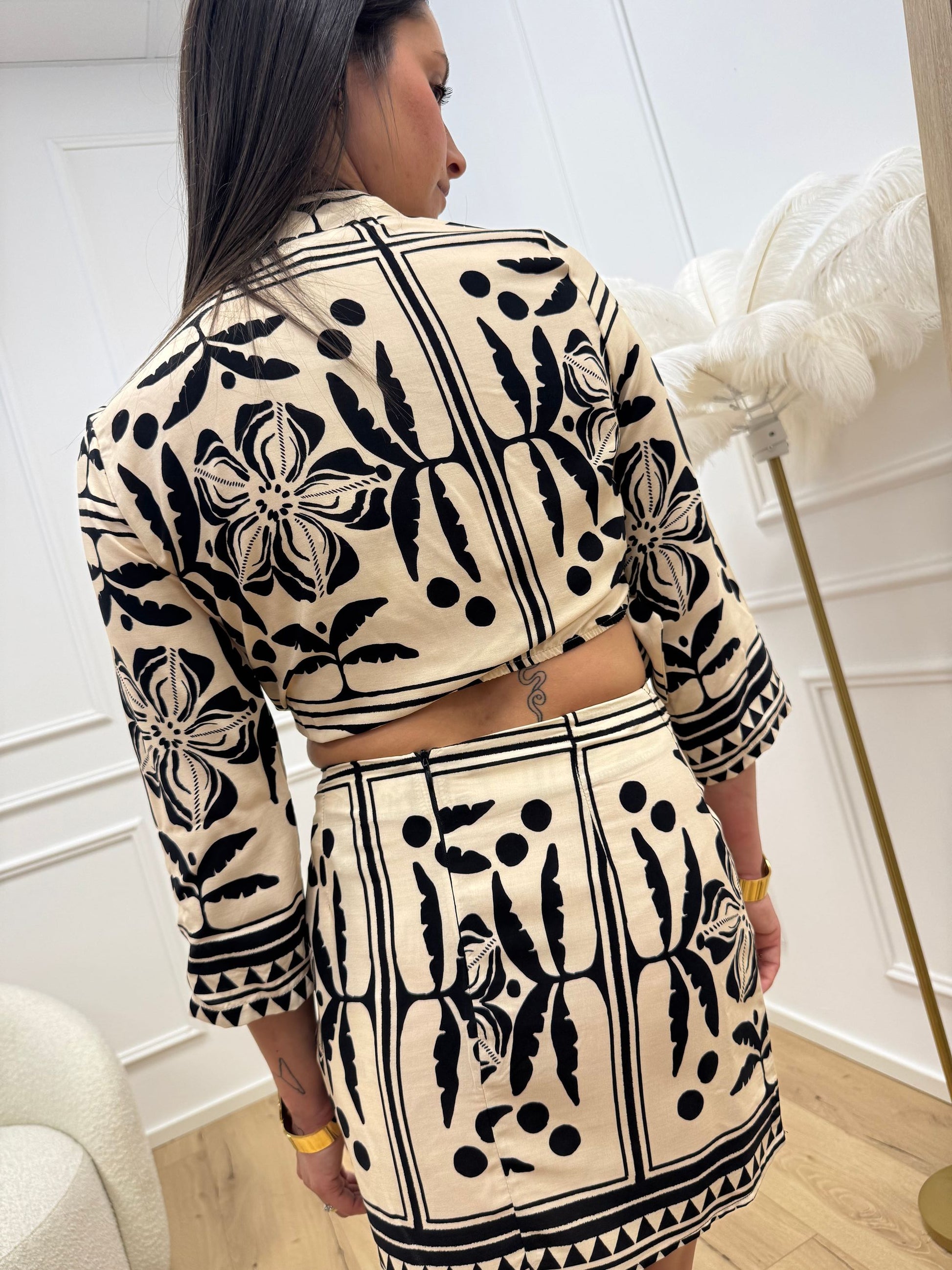 Camicia fantasia Botanique color nero e panna HaveOne. Modello wide leg fit a gamba morbida, vita medio alta e coulisse regolabile.