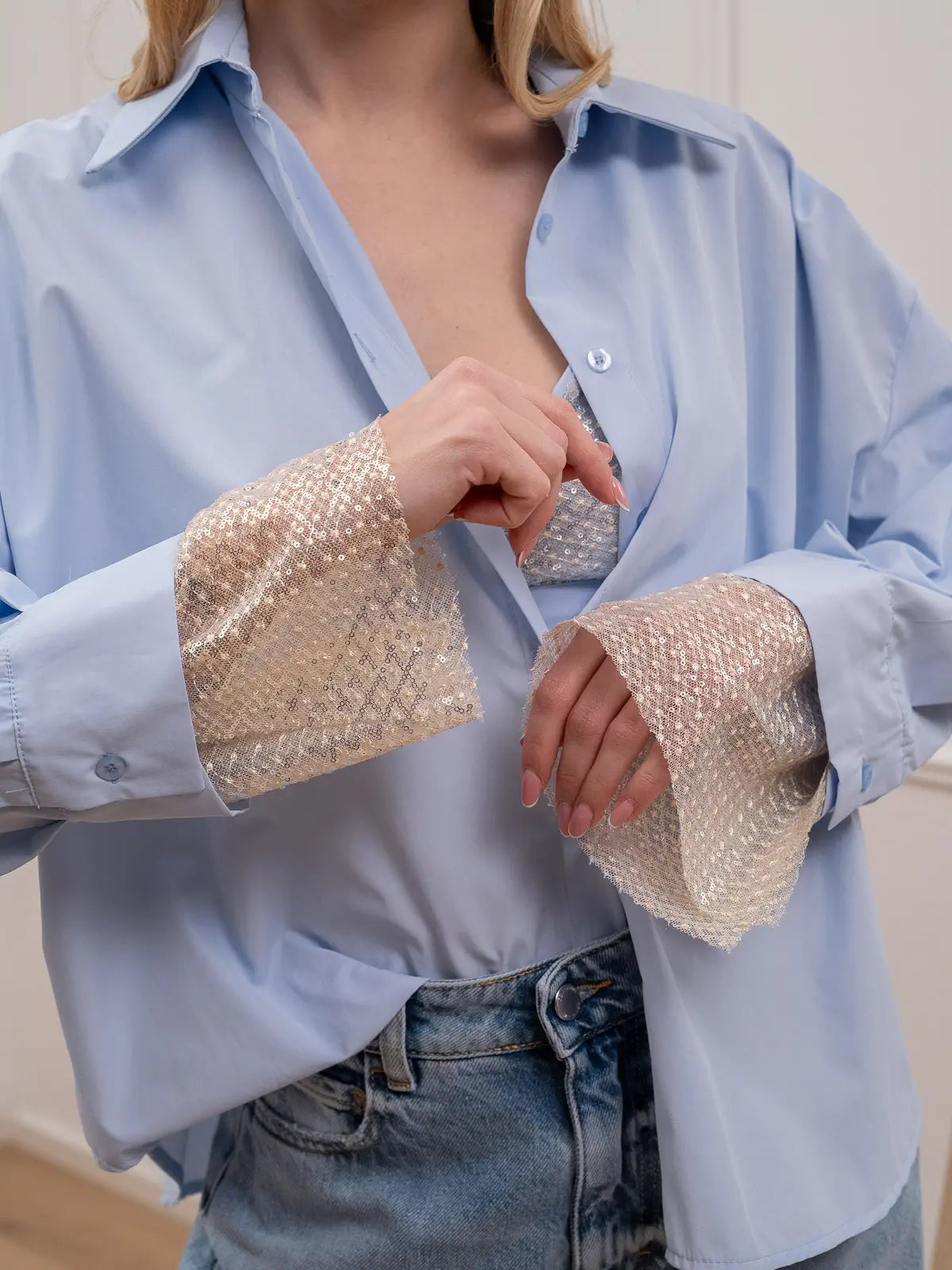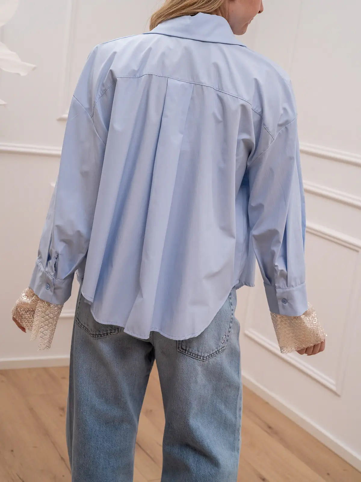 Camicia color celeste HaveOne. Modello fit regolare con colletto e chiusura frontale con bottoncini. Bralette a triangolo con dettaglio di applicazione rete ricamata e paillettes. Stesso dettaglio anche sul fondo del polso.