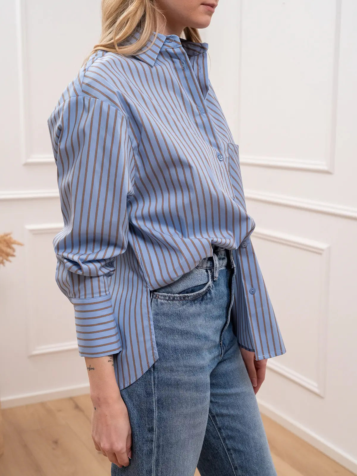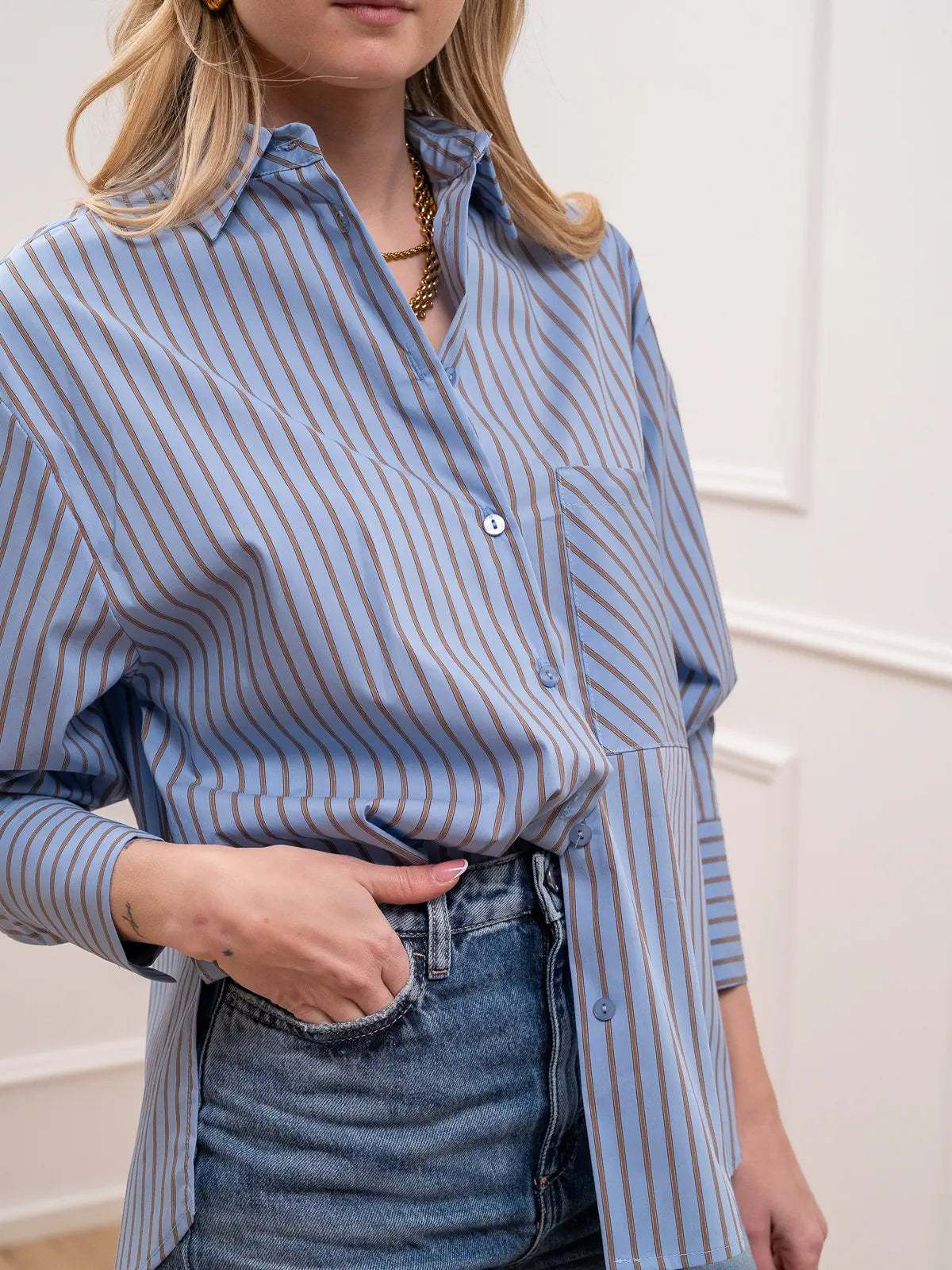 Camicia celeste rigata camel HaveOne. Modello fit oversize con colletto e chiusura frontale con bottoncini. Manica lunga con polsino sul fondo. Applicazione di tasca lato cuore.