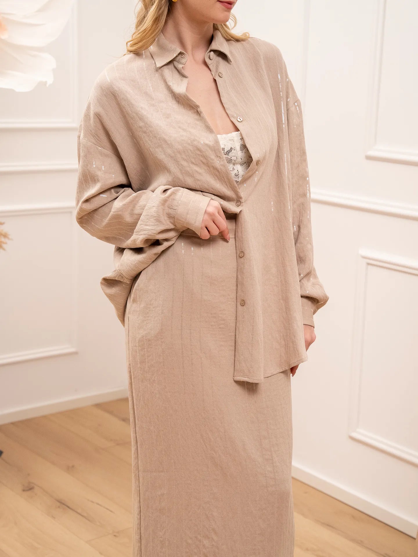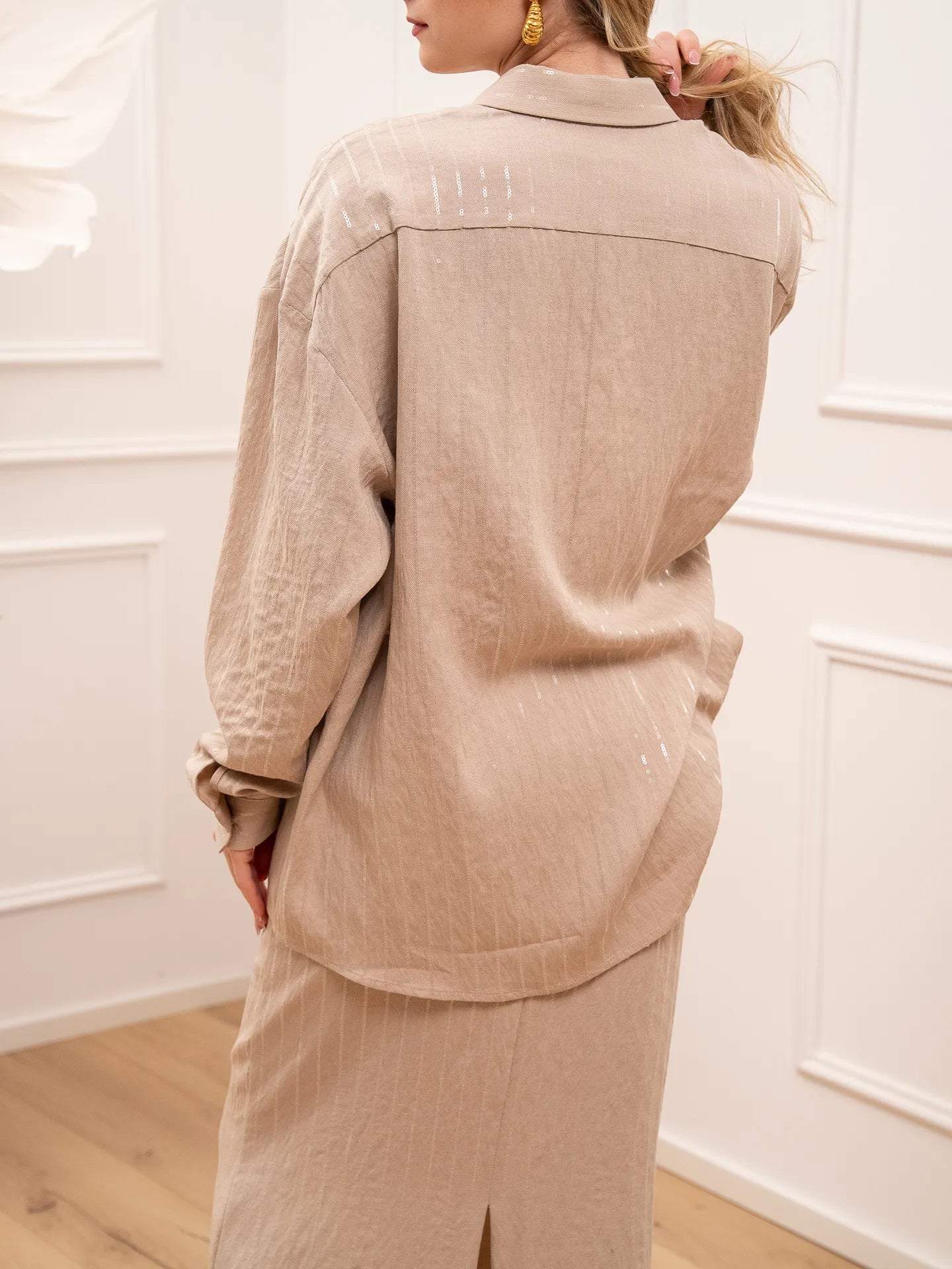 Camicia Glam color sabbia gessata con paillettes trasparenti Silence Limited. Modello fit oversize con colletto e chiusura frontale con bottoni. Maniche lunghe con polsino sul fondo.