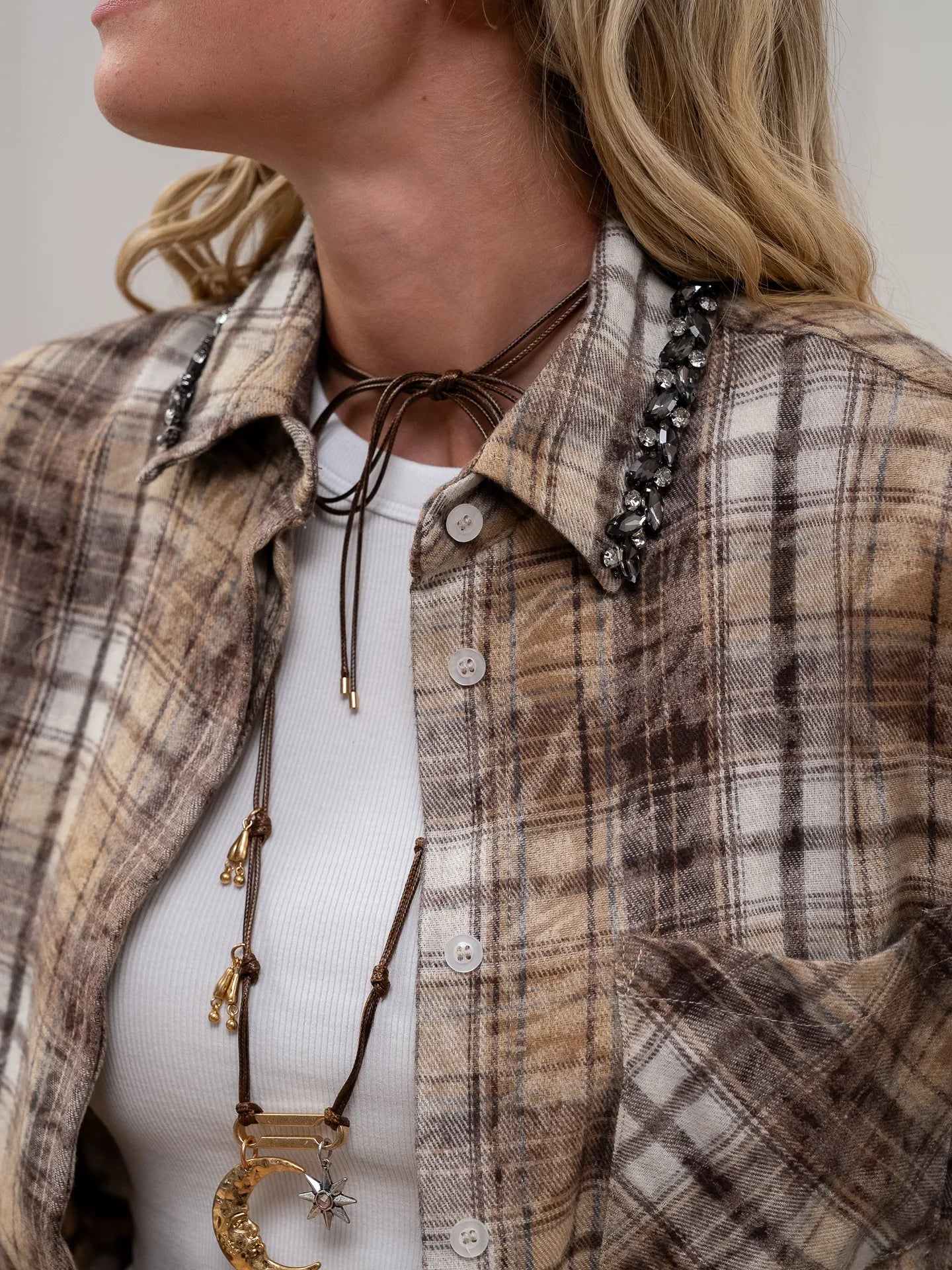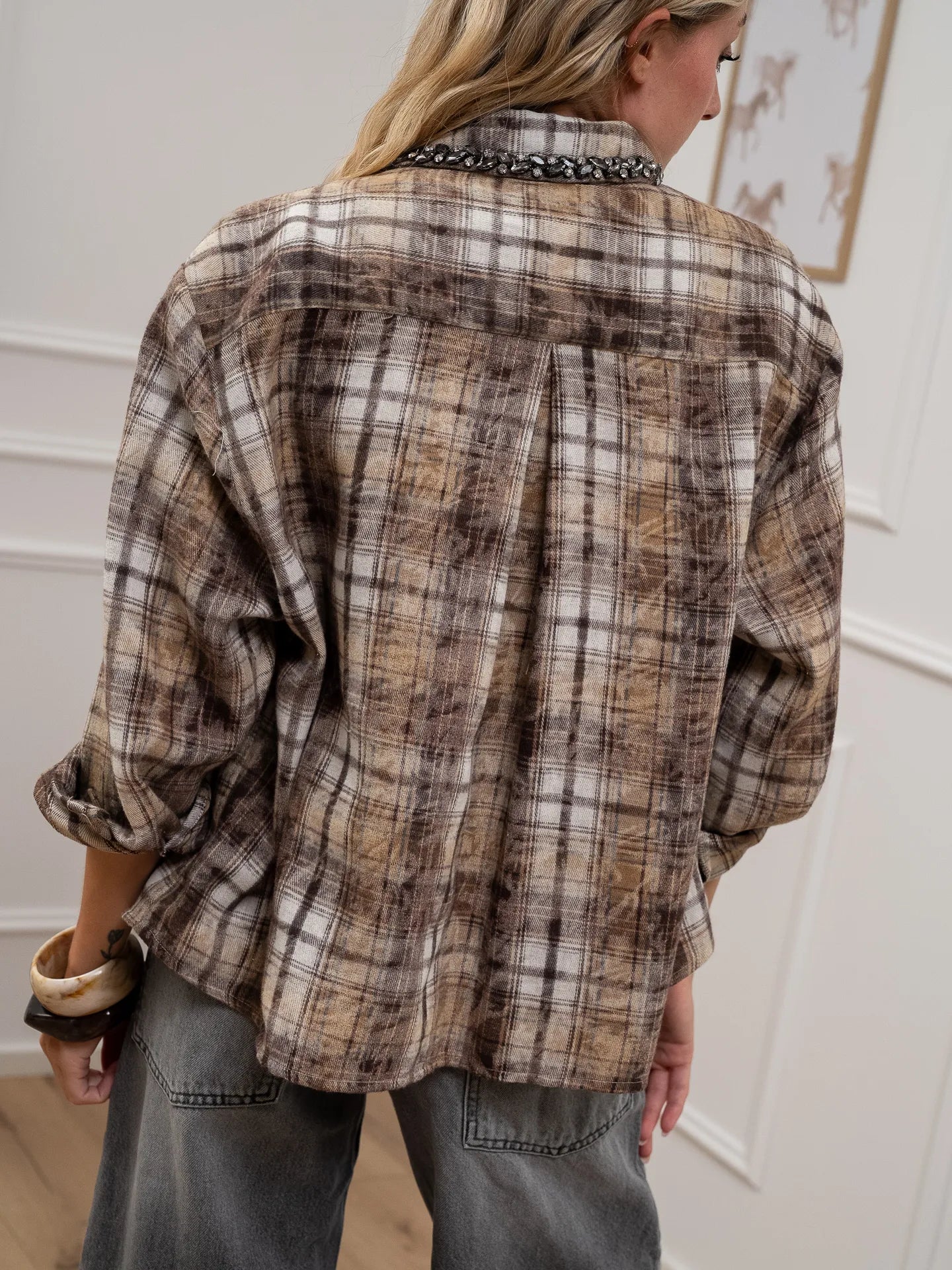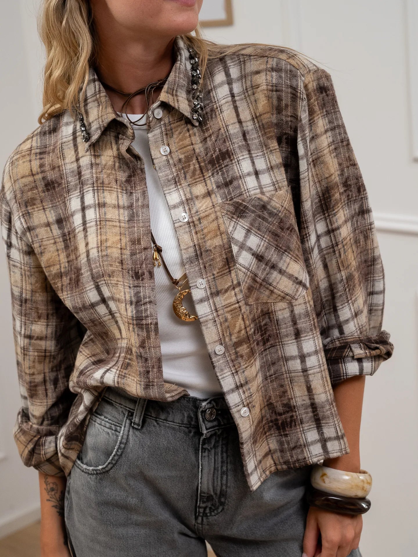Camicia in flanella stampa quadri moro Vicolo. Modello fit regolare con colletto e dettaglio strass. Chiusura frontale con bottoni nascosti. Manica lunga con polsino ampio e alto.