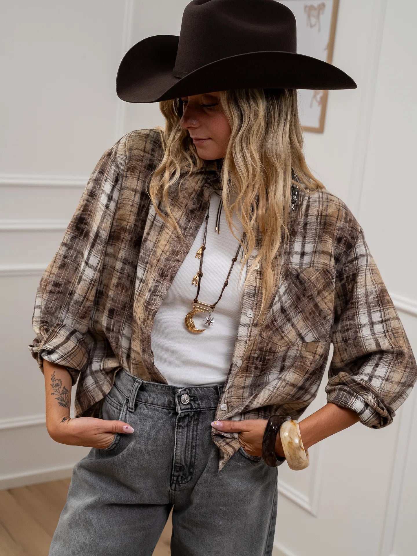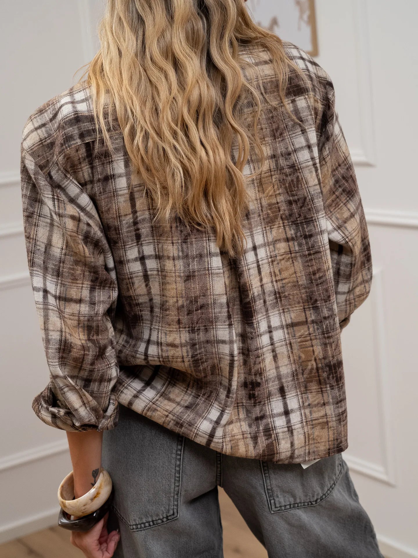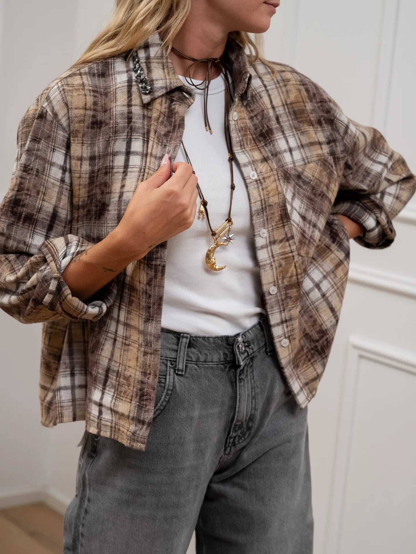 Camicia in flanella stampa quadri moro Vicolo. Modello fit regolare con colletto e dettaglio strass. Chiusura frontale con bottoni nascosti. Manica lunga con polsino ampio e alto.