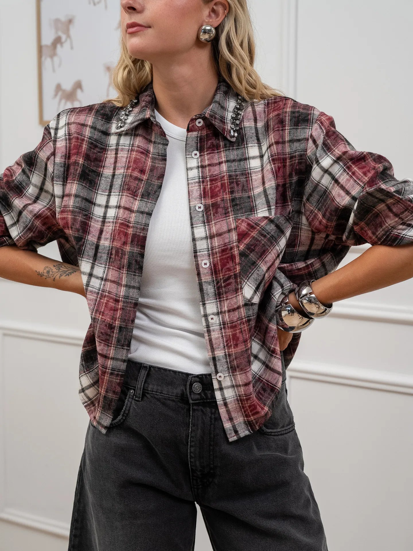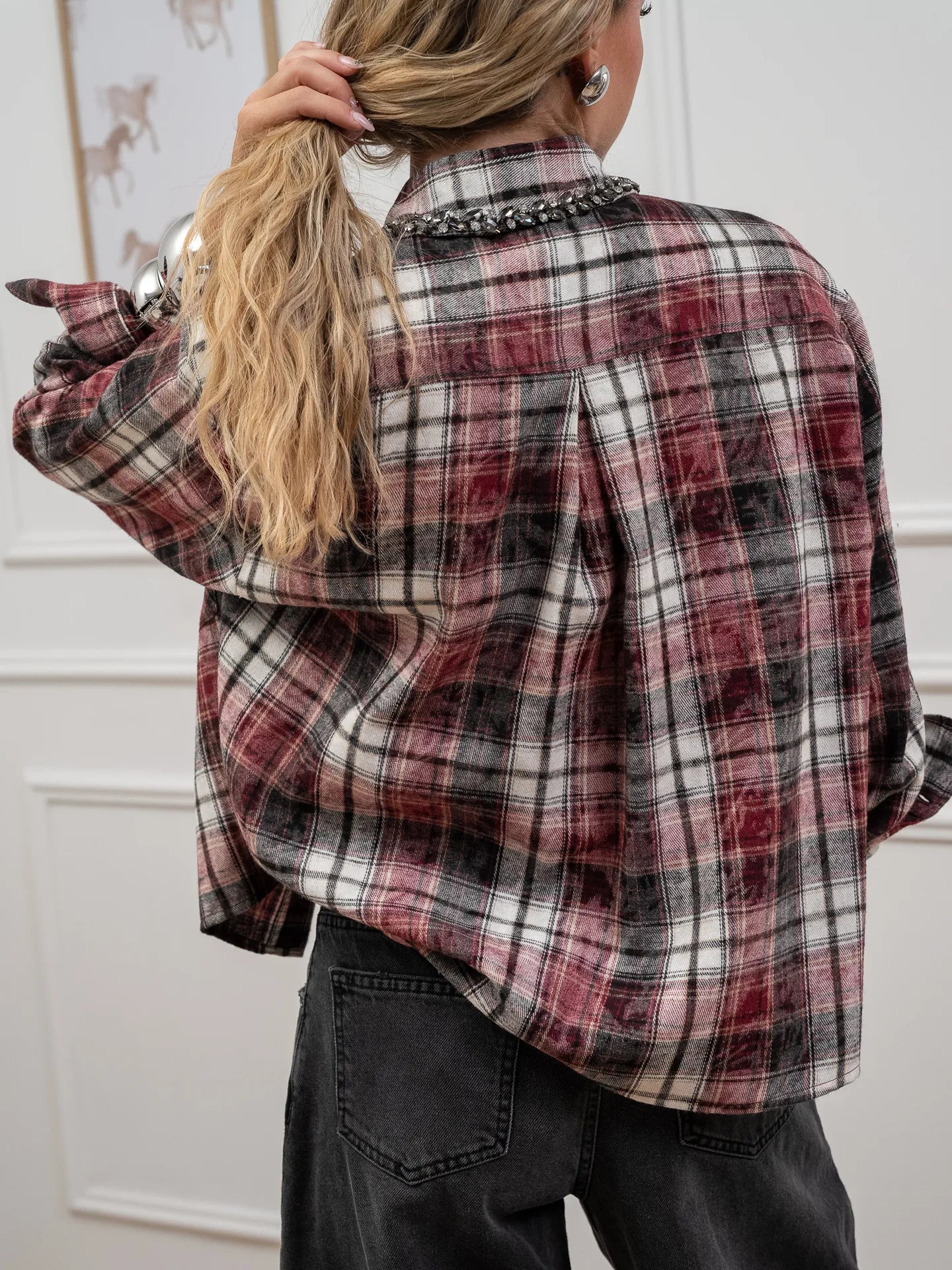 Camicia in flanella stampa quadri rossa Vicolo. Modello fit regolare con colletto e dettaglio strass. Chiusura frontale con bottoni nascosti. Manica lunga con polsino ampio e alto.