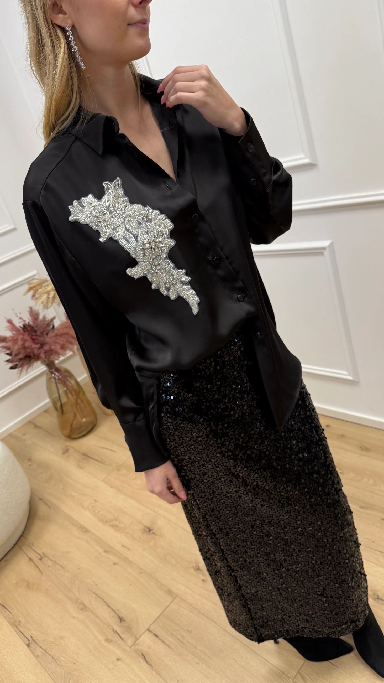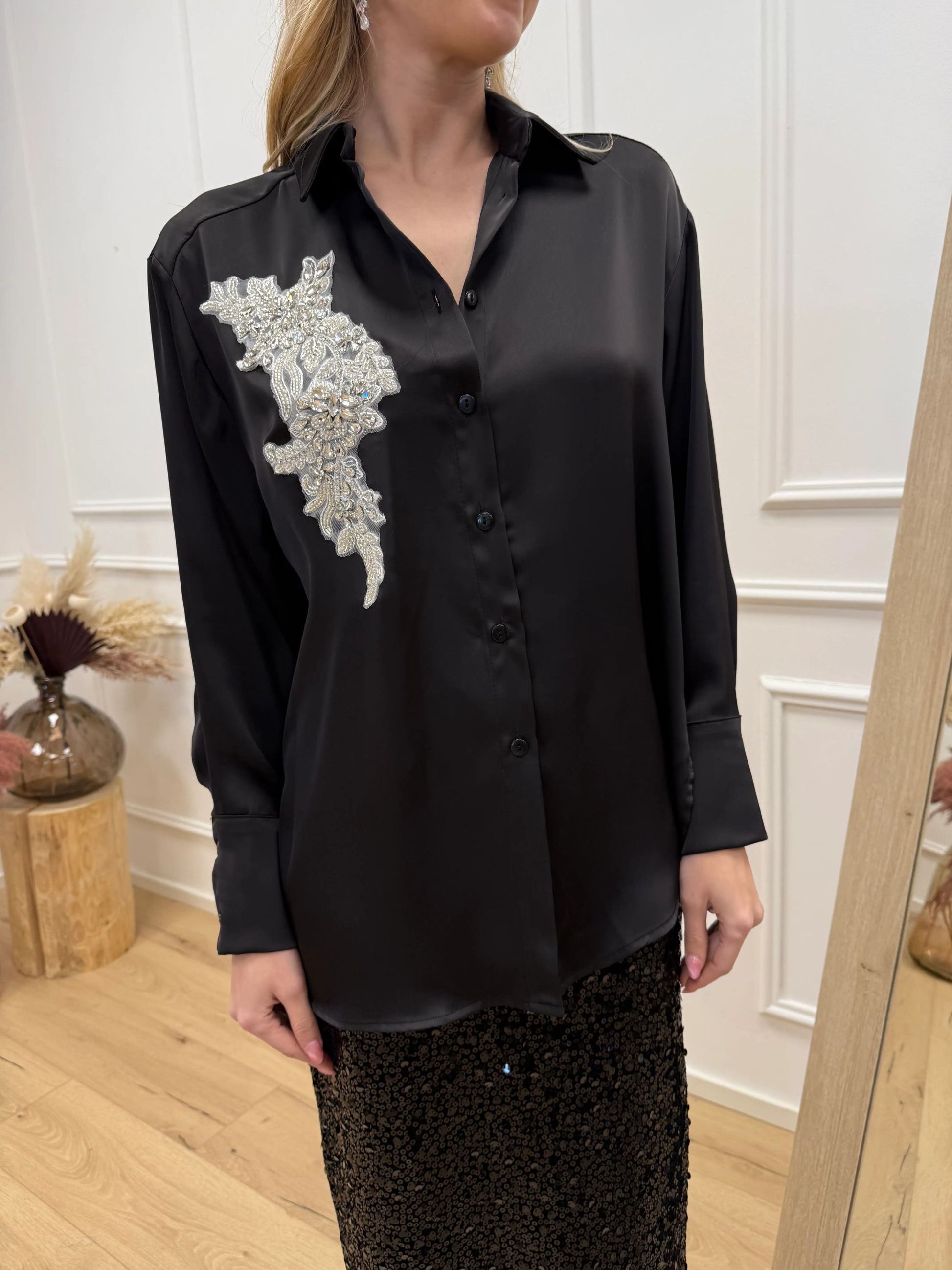 Camicia in satin nero con patch gioiello - HaveOne