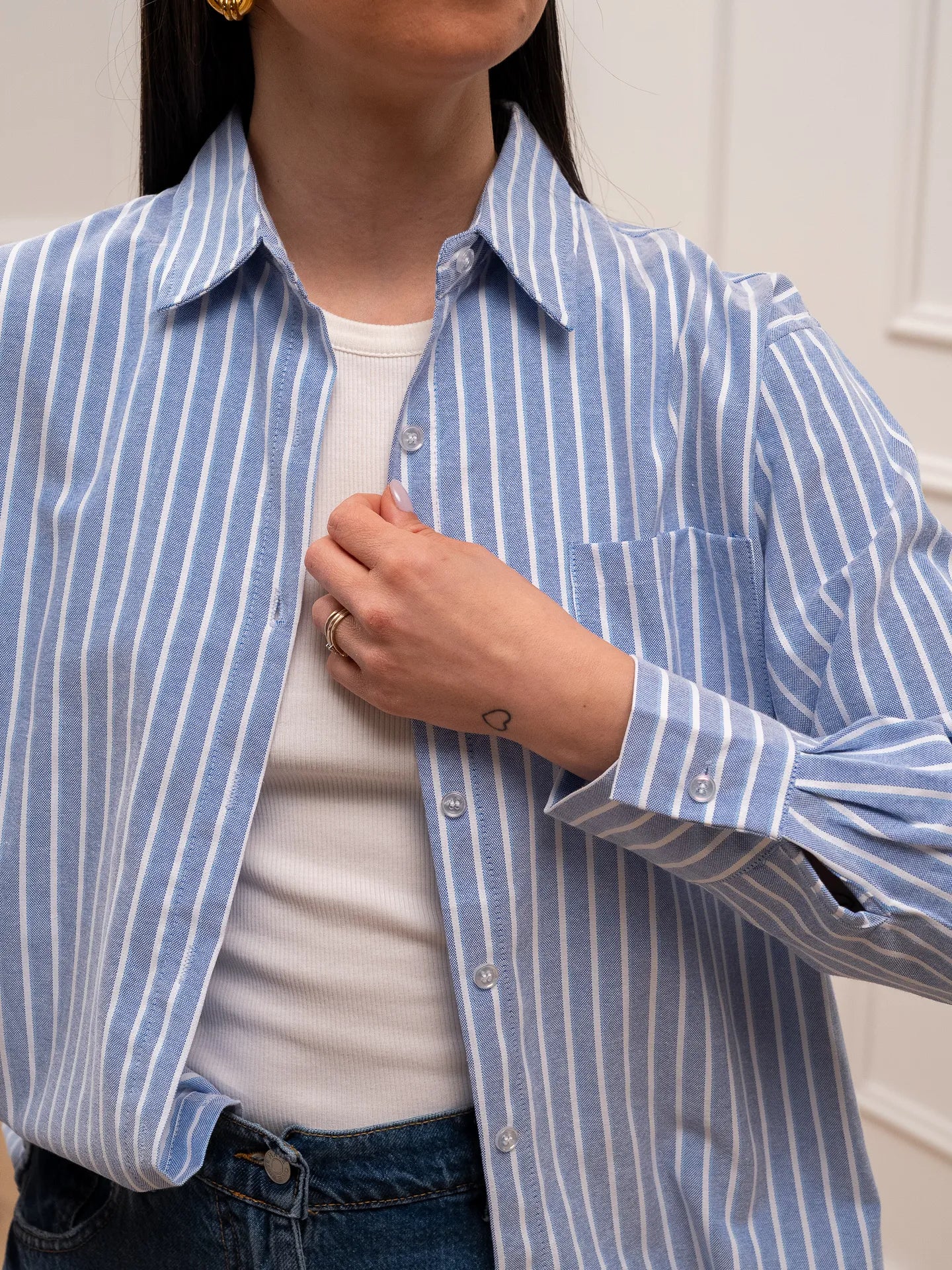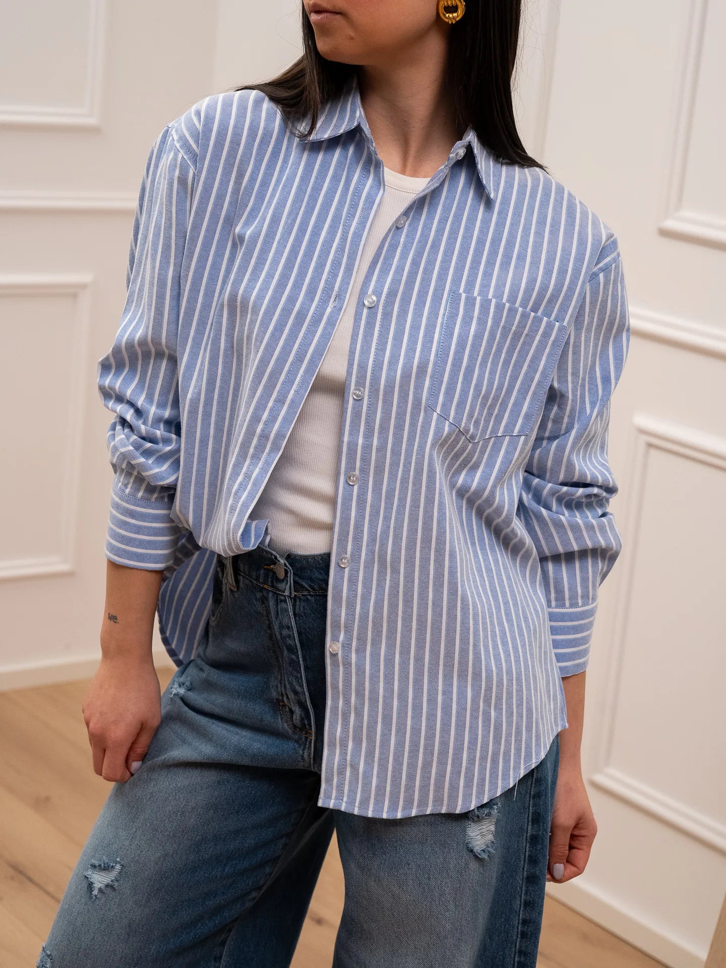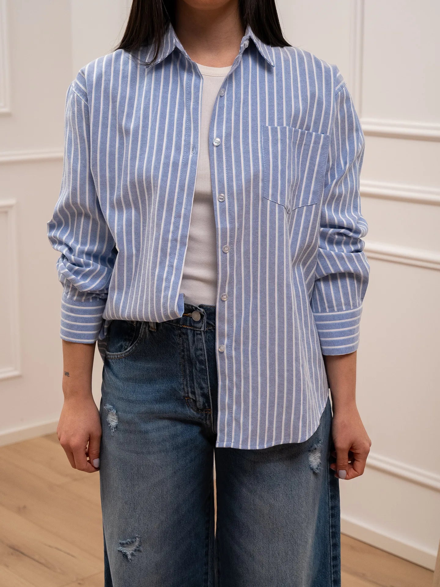Camicia Melody rigata sui toni del blu Crispy. Modello basic fit morbido con colletto e chiusura frontale con bottoncini. Tasca applicata lato cuore.