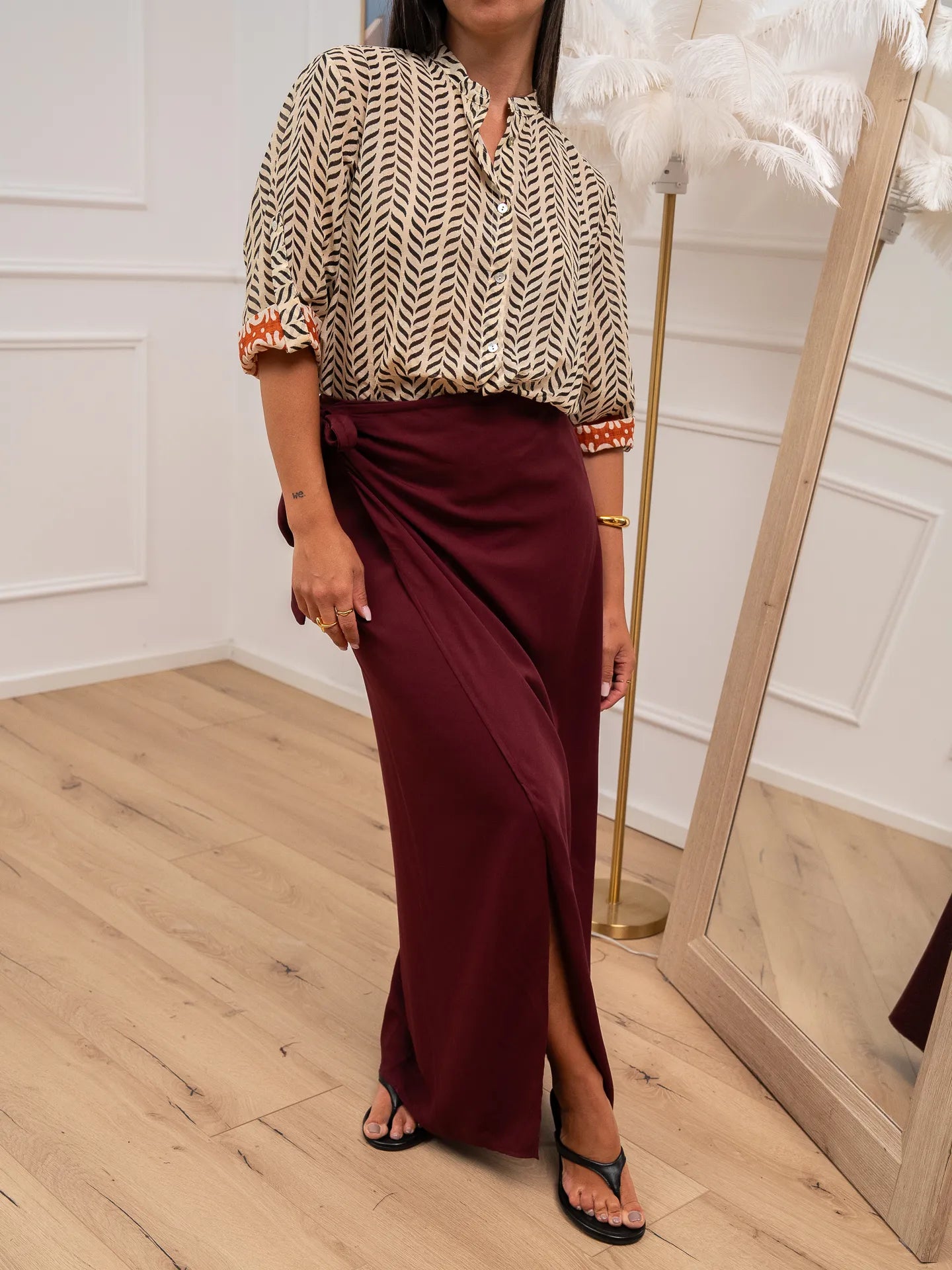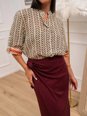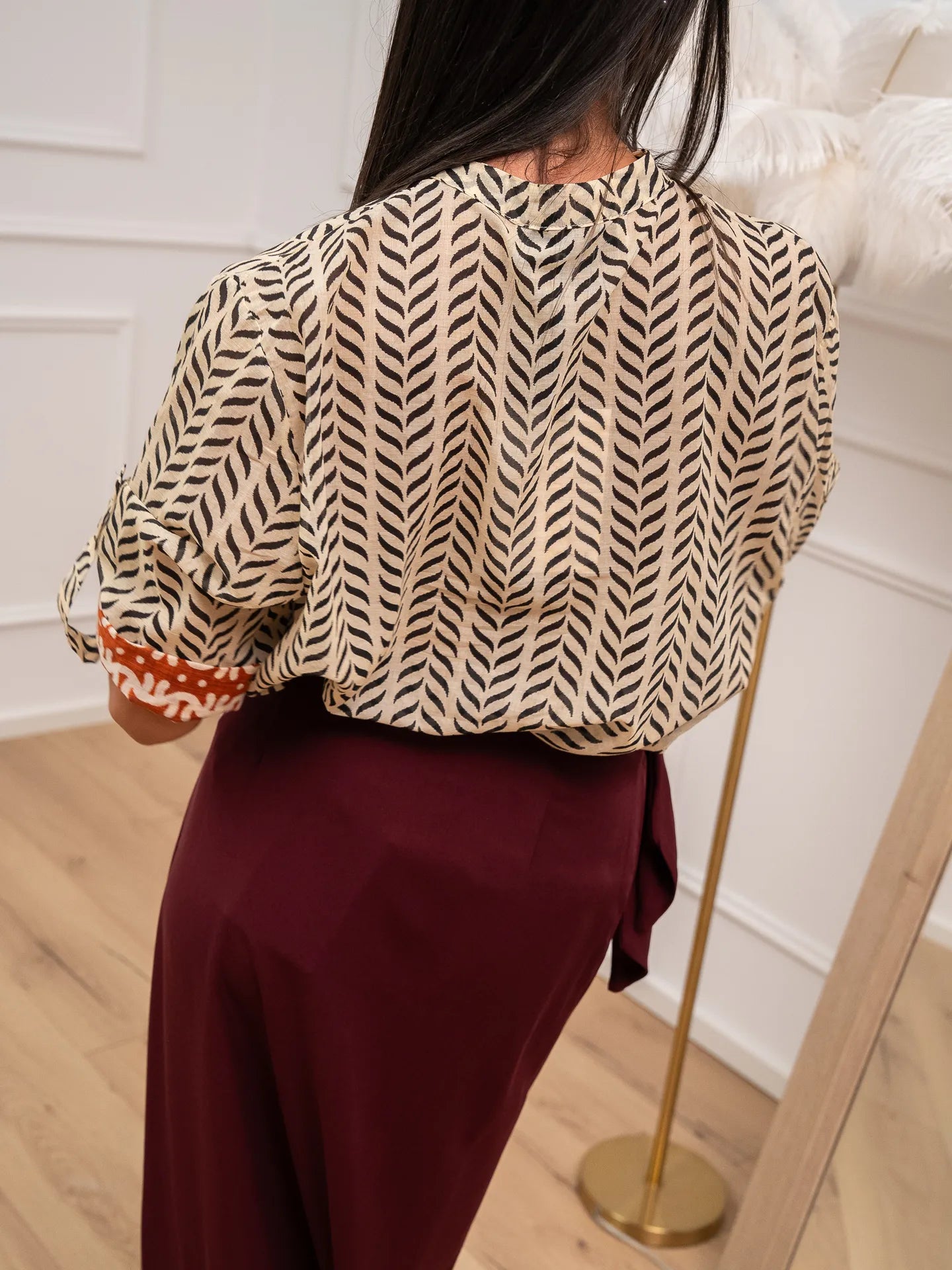 Camicia voile in mussola di cotone Nomad burro e nero HaveOne. Modello con scollo a v e chiusura frontale a bottoncini. Mezza manica e fiocco frontale.