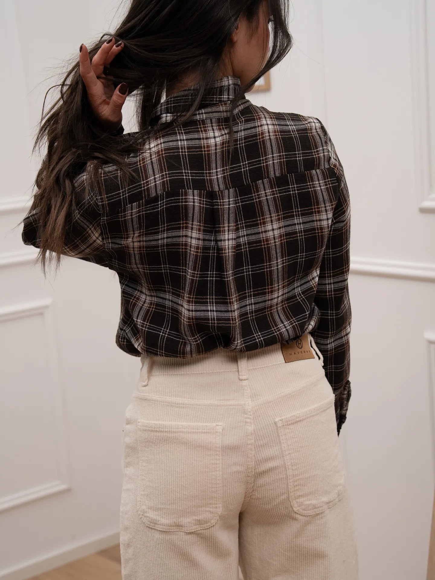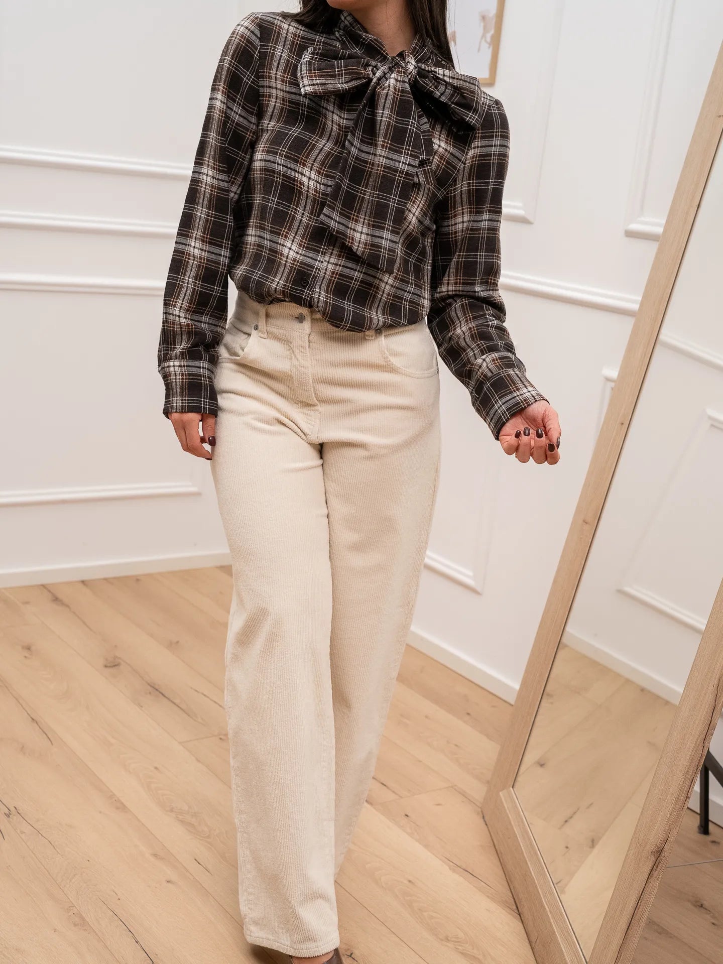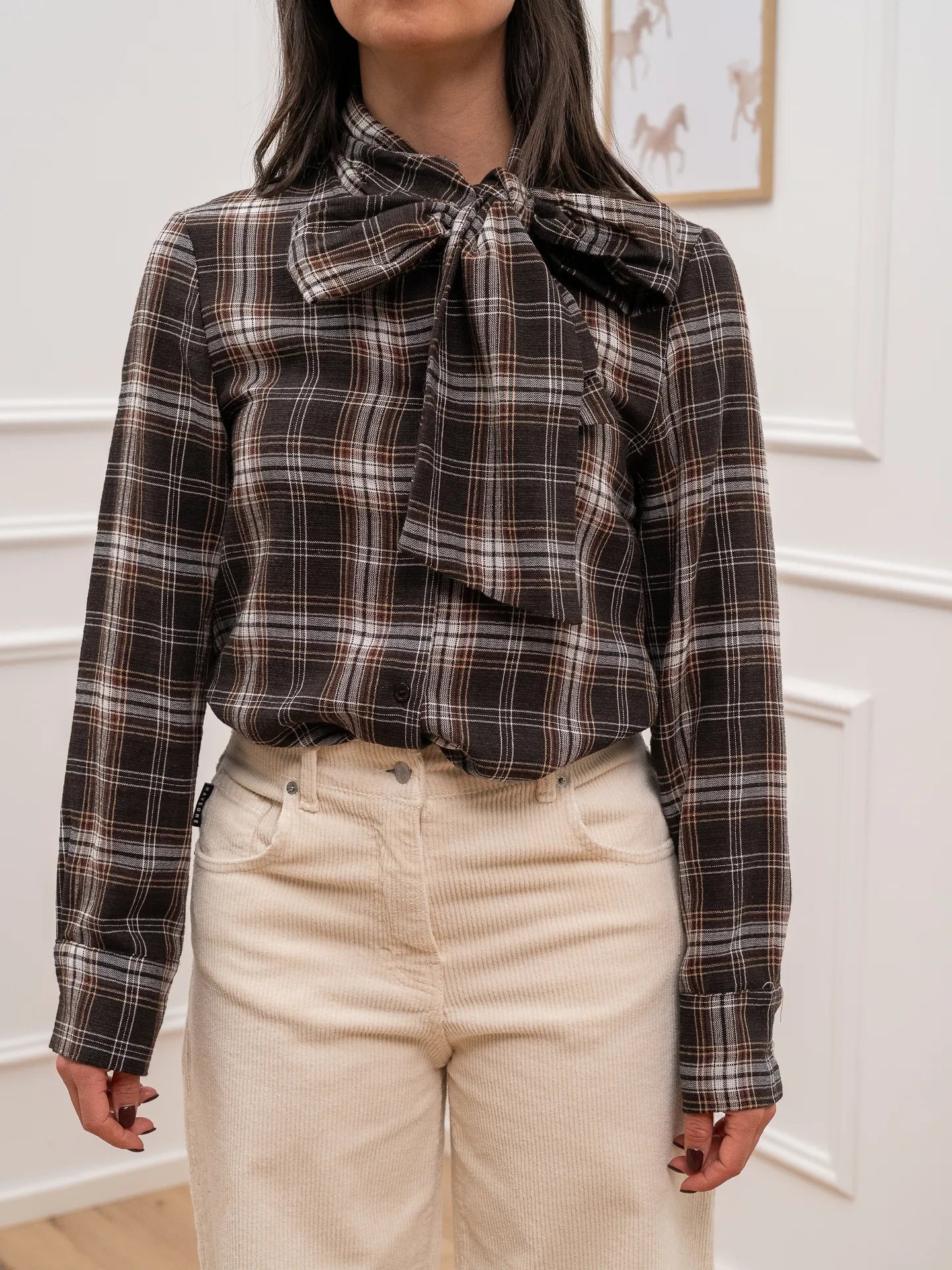 Camicia tartan sui toni del moro HaveOne. Modello fit regolare con chiusura frontale a bottoncini e dettaglio di fiocco al collo.