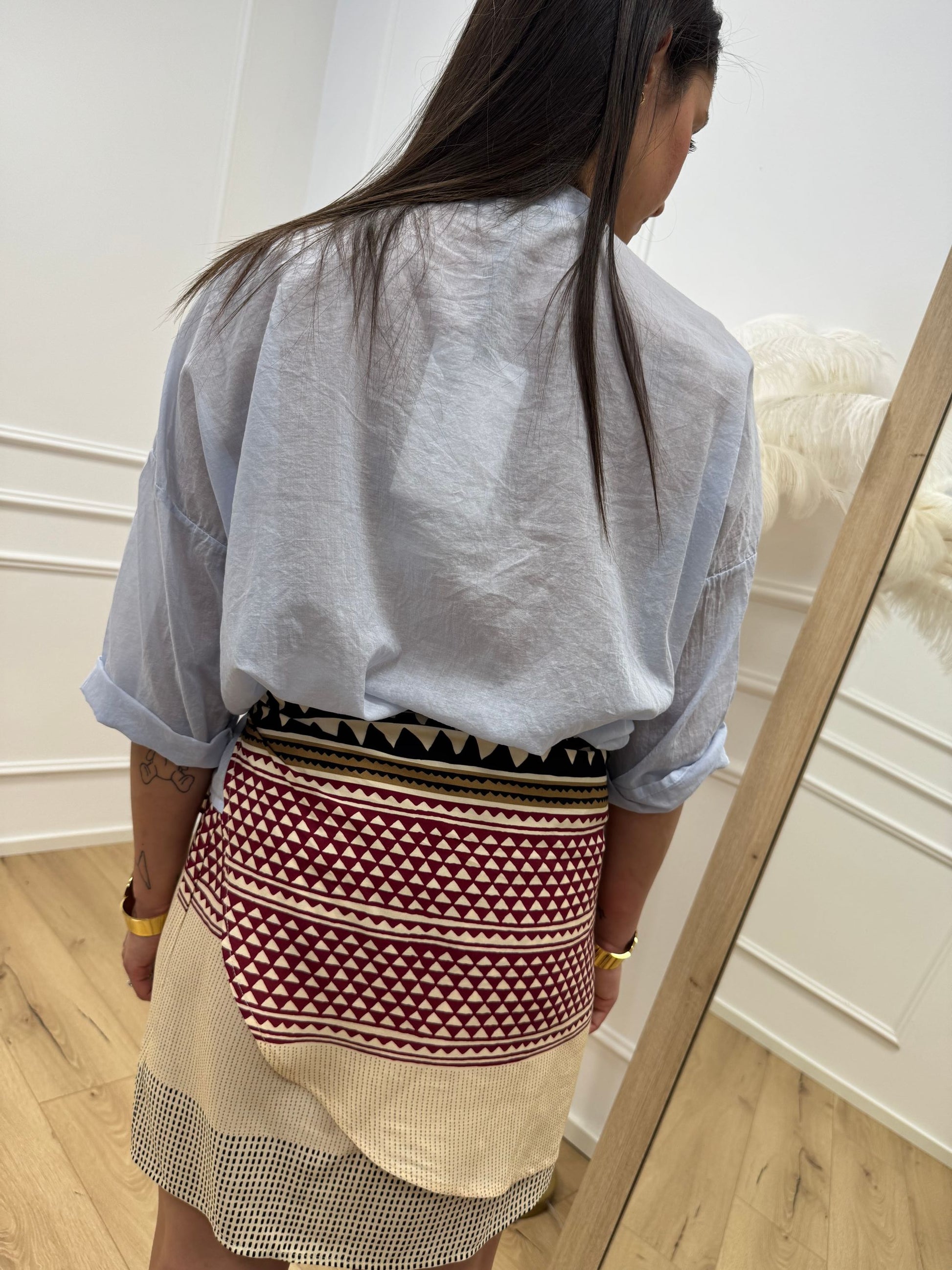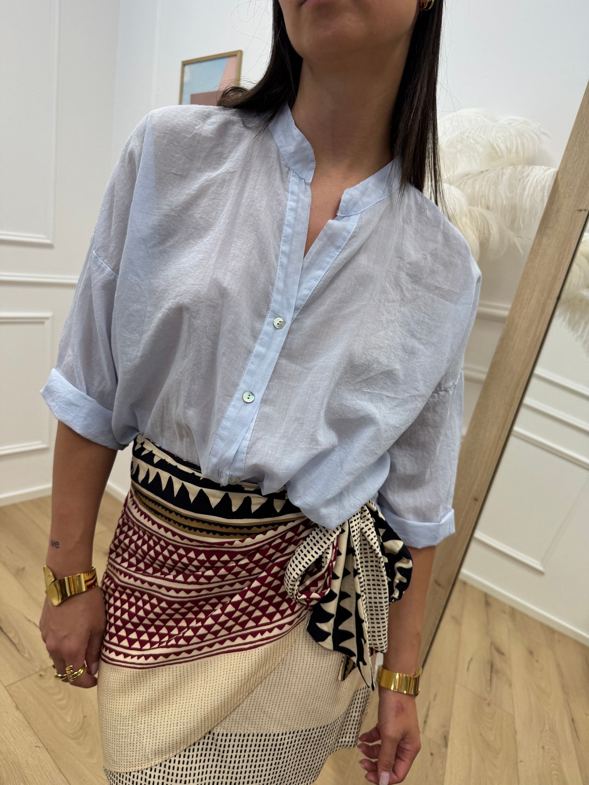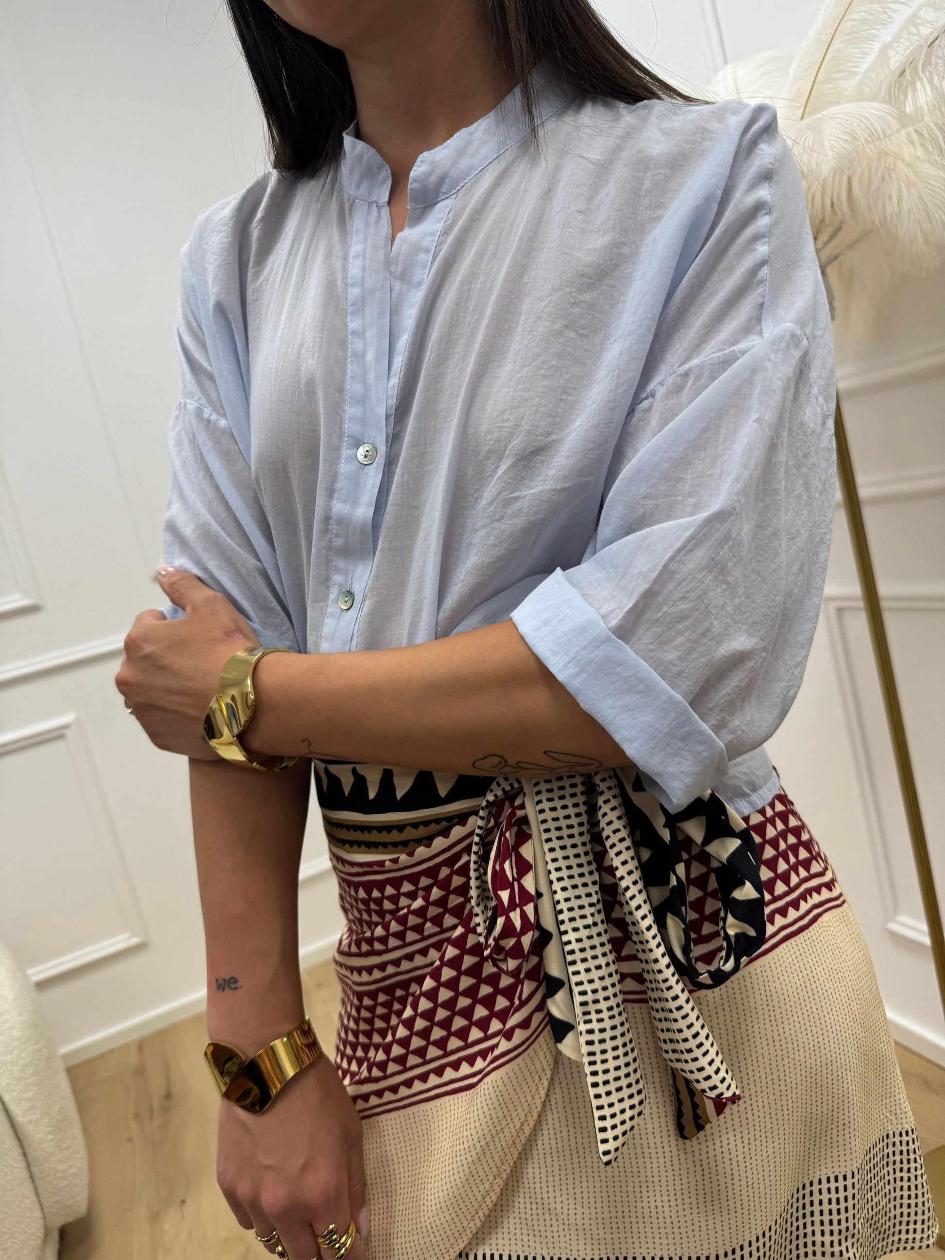 Camicia voile in mussola di cotone color air HaveOne. Modello con scollo a v e chiusura frontale a bottoncini. Mezza manica e fiocco frontale.