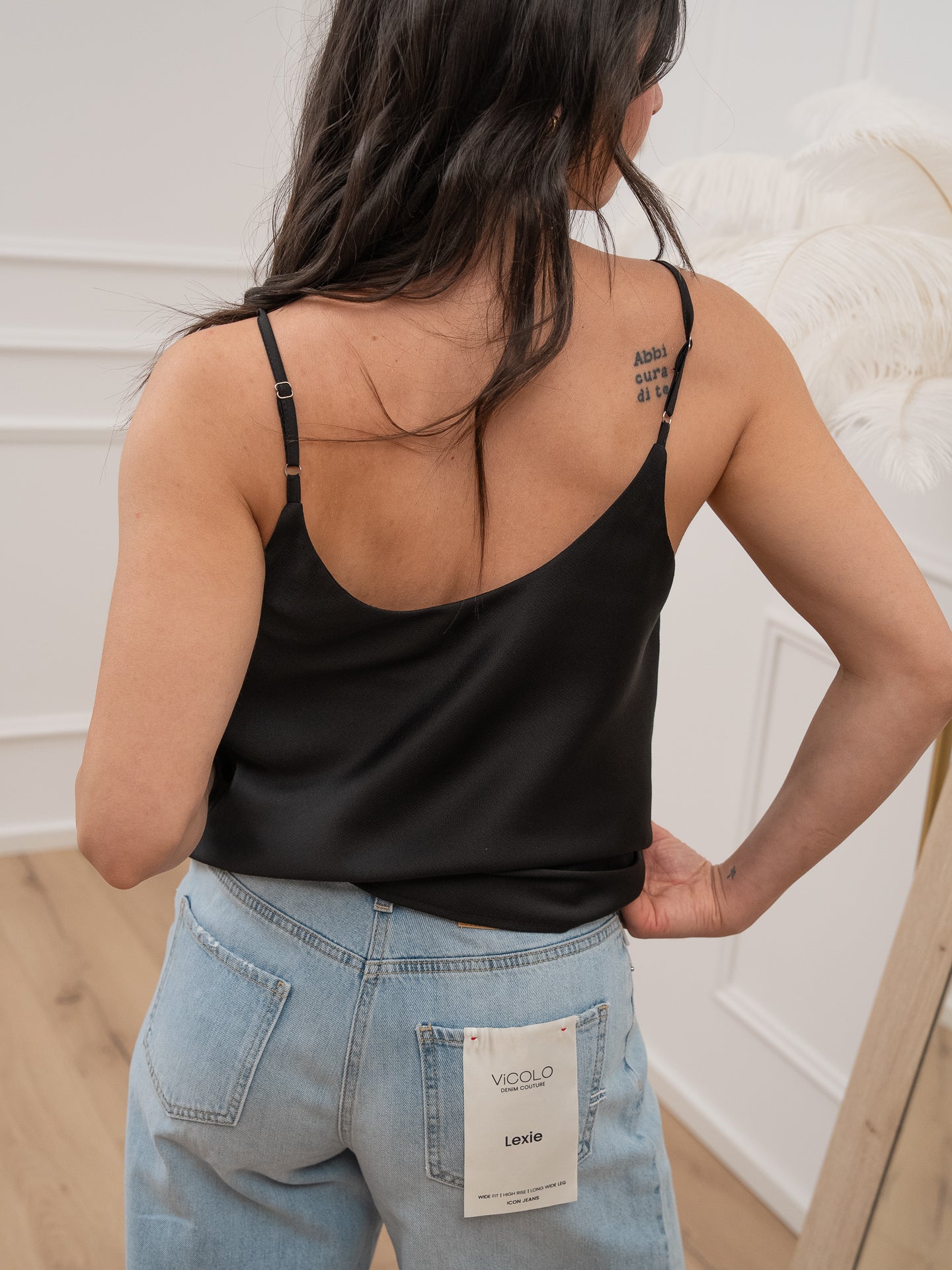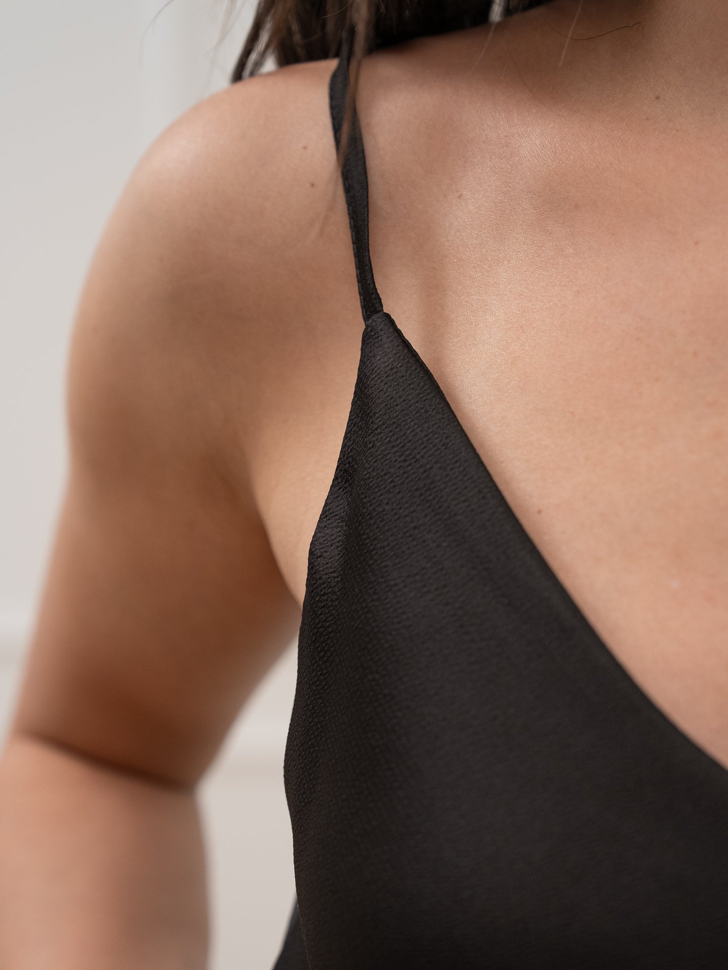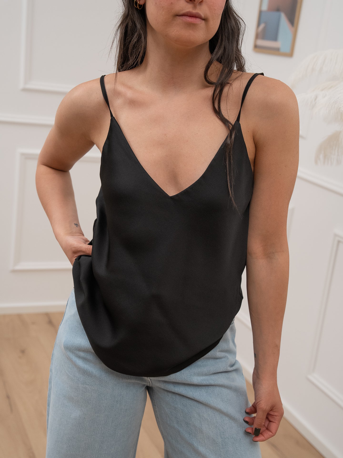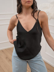 Canotta color nero in raso martellato Vicolo. Modello basic scollo a v con spalline sottili regolabili.
