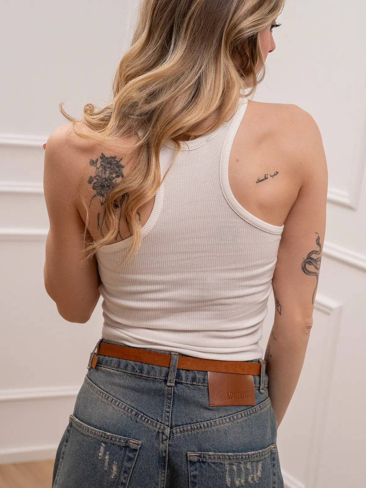 Canotta color bianco a costine Vicolo. Modello maxi scollo america, fit regolare.