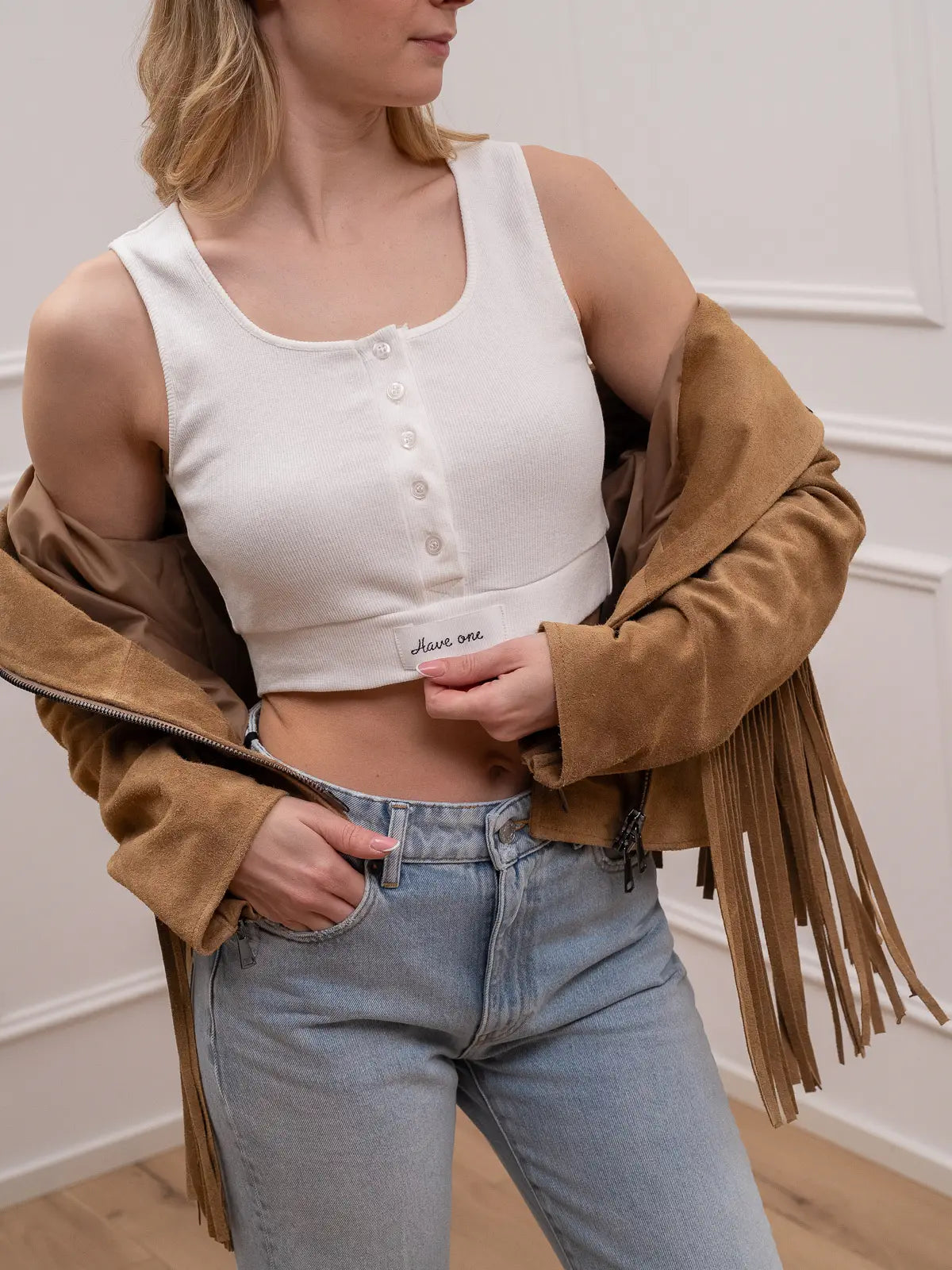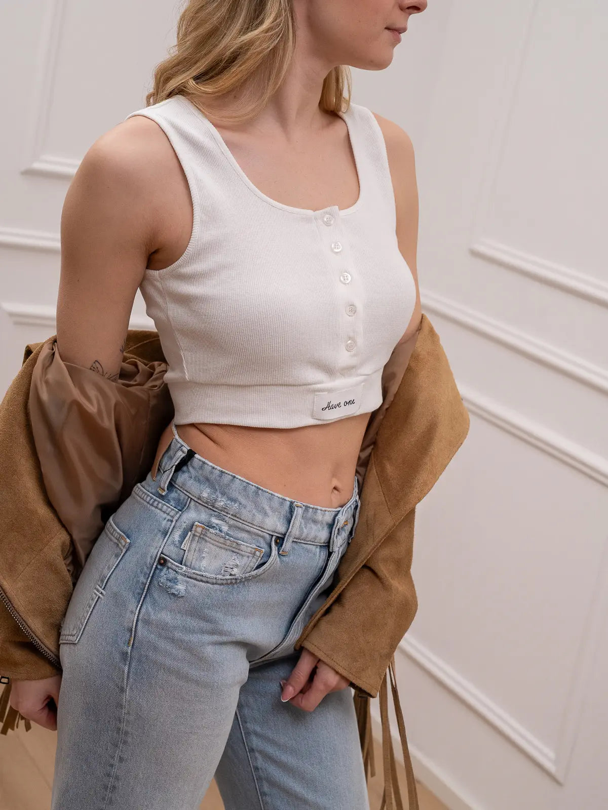 Canotta color bianco HaveOne. Modello serafino scollo rotondo con bottoncini, fit crop e dettaglio di etichetta logo.