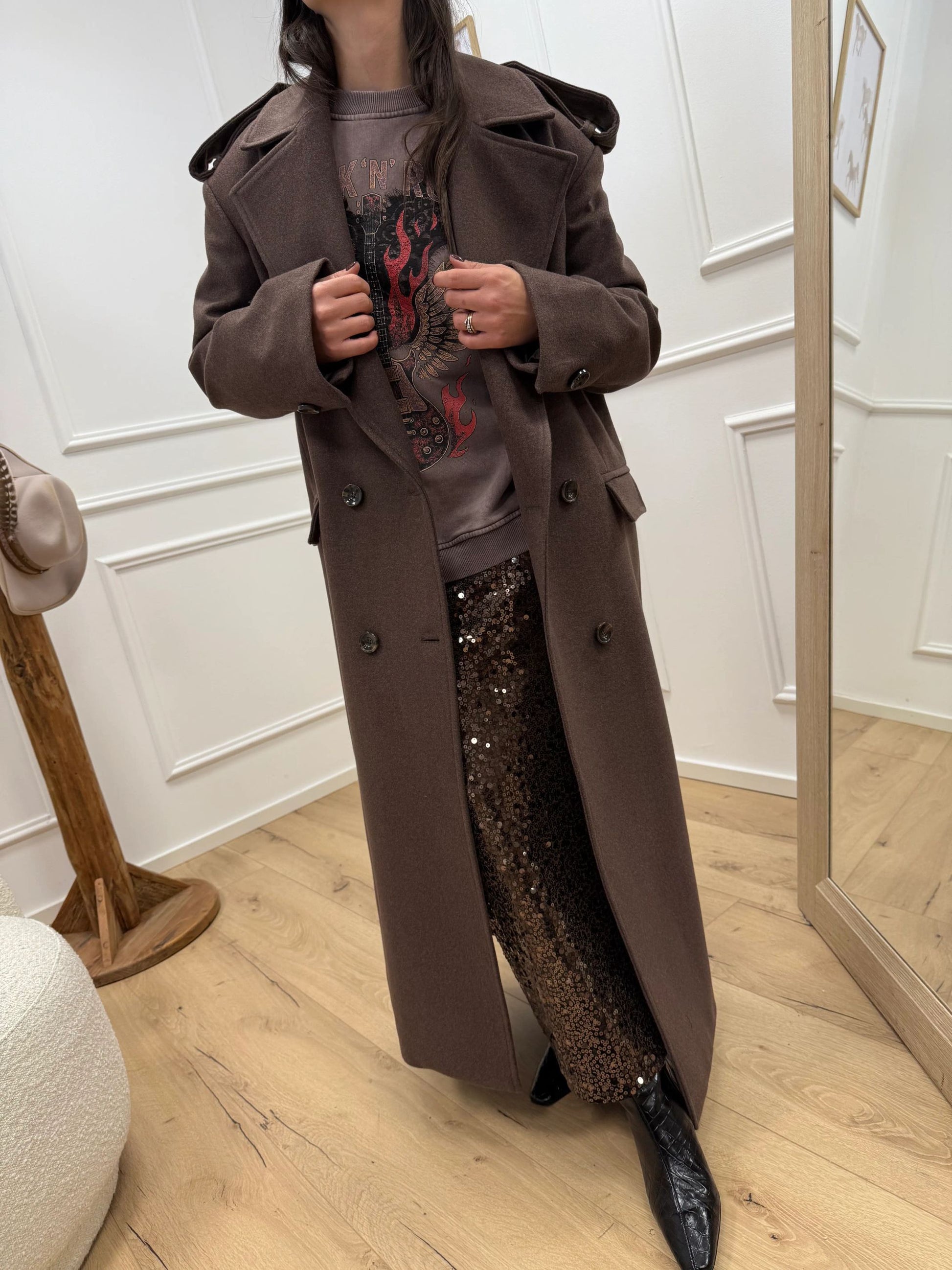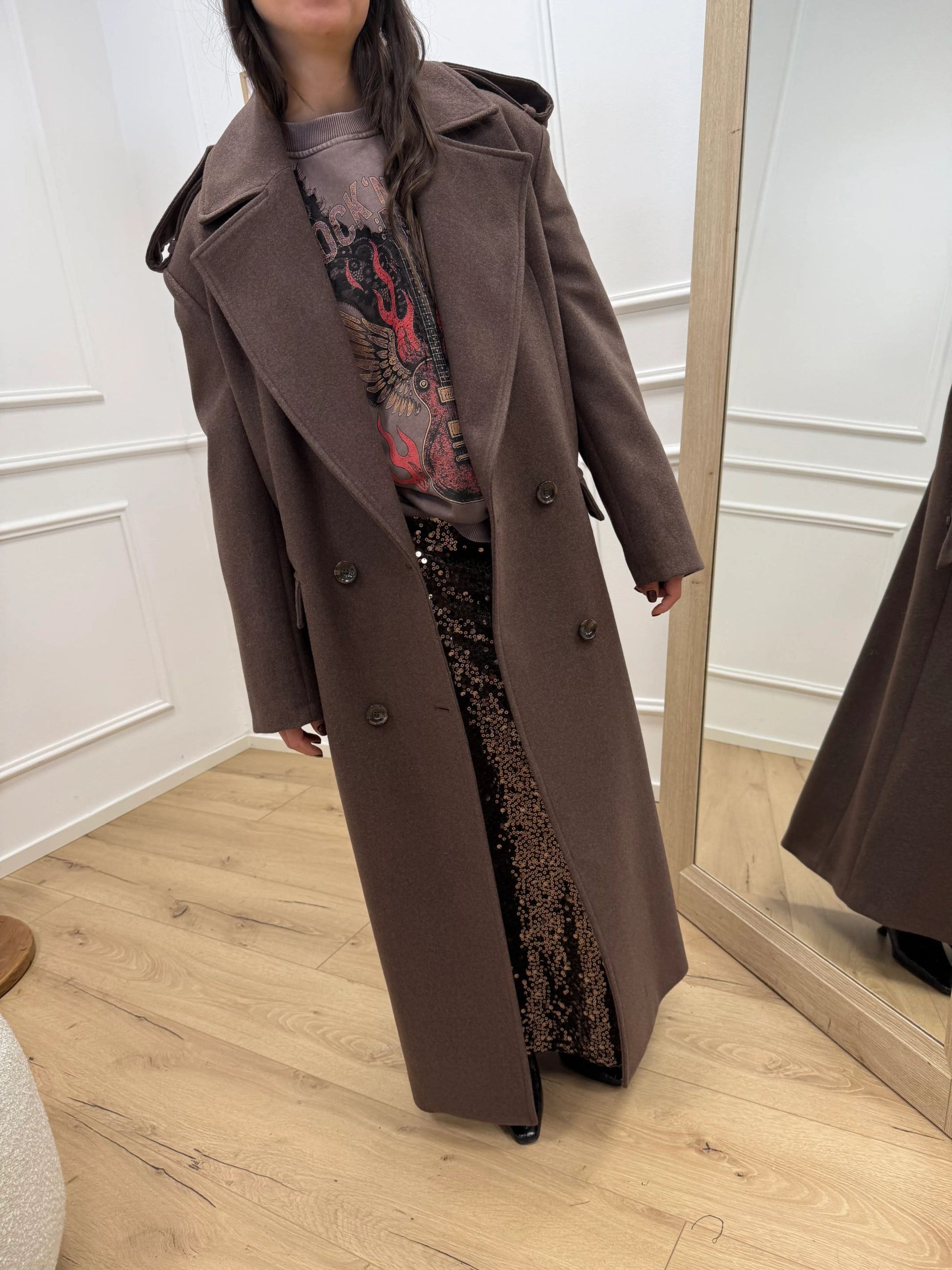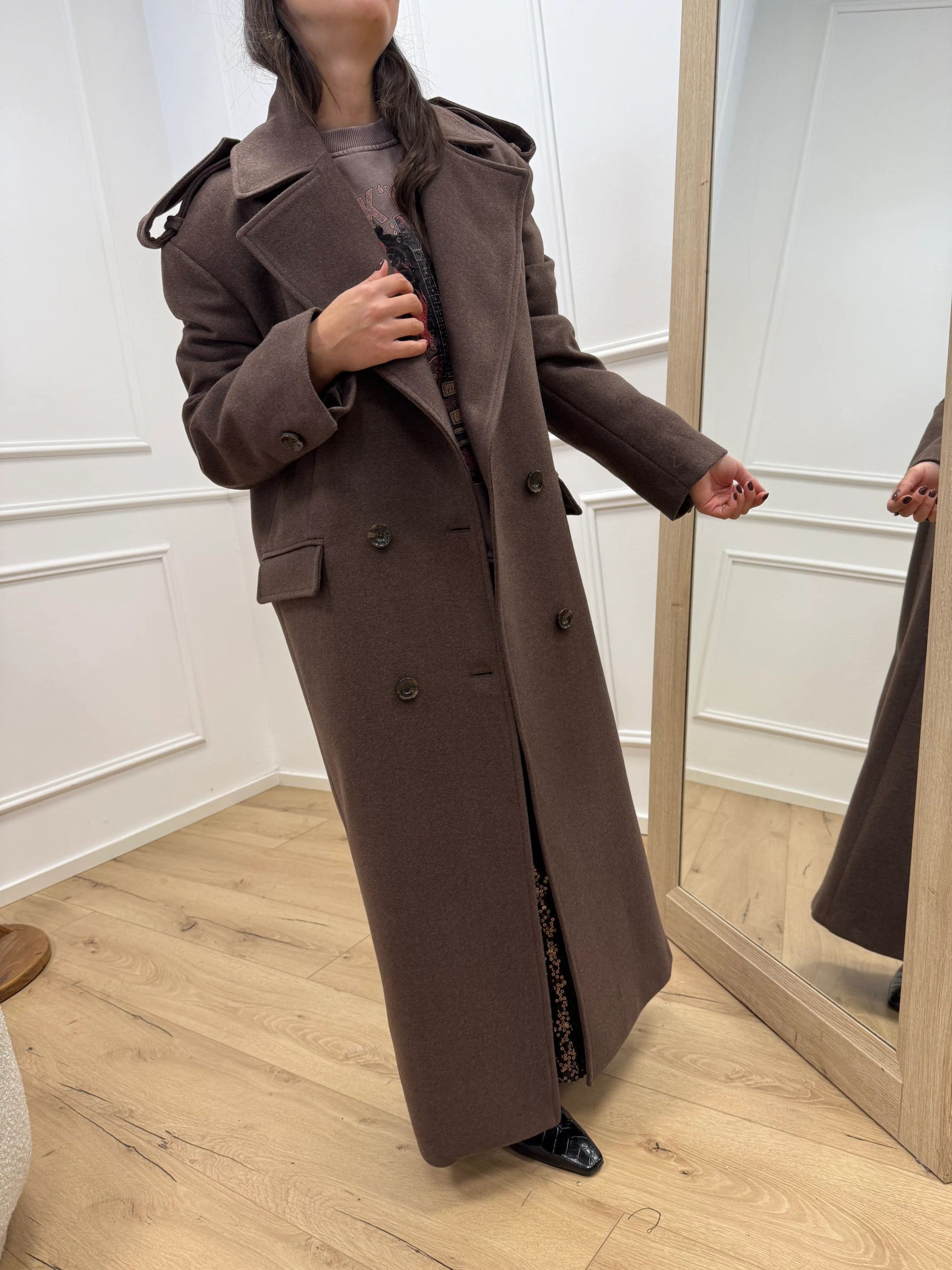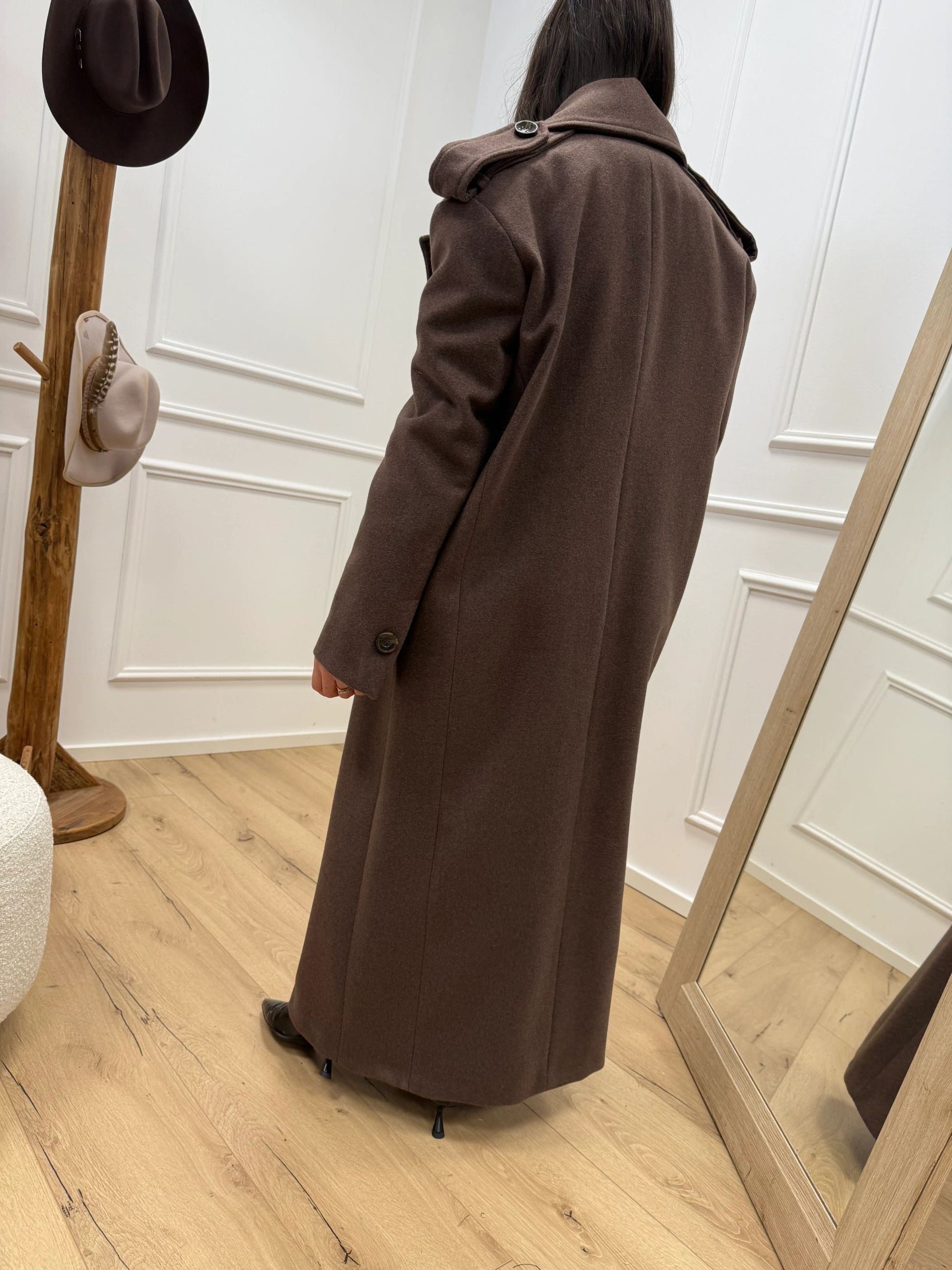 Cappotto color fondente HaveOne. Modello lungo con chiusura doppiopetto frontale. Fit oversize, collo revers e laccetto sulle spalle. Tasche con patta frontali. Maniche lunghe con bottone sul polso.