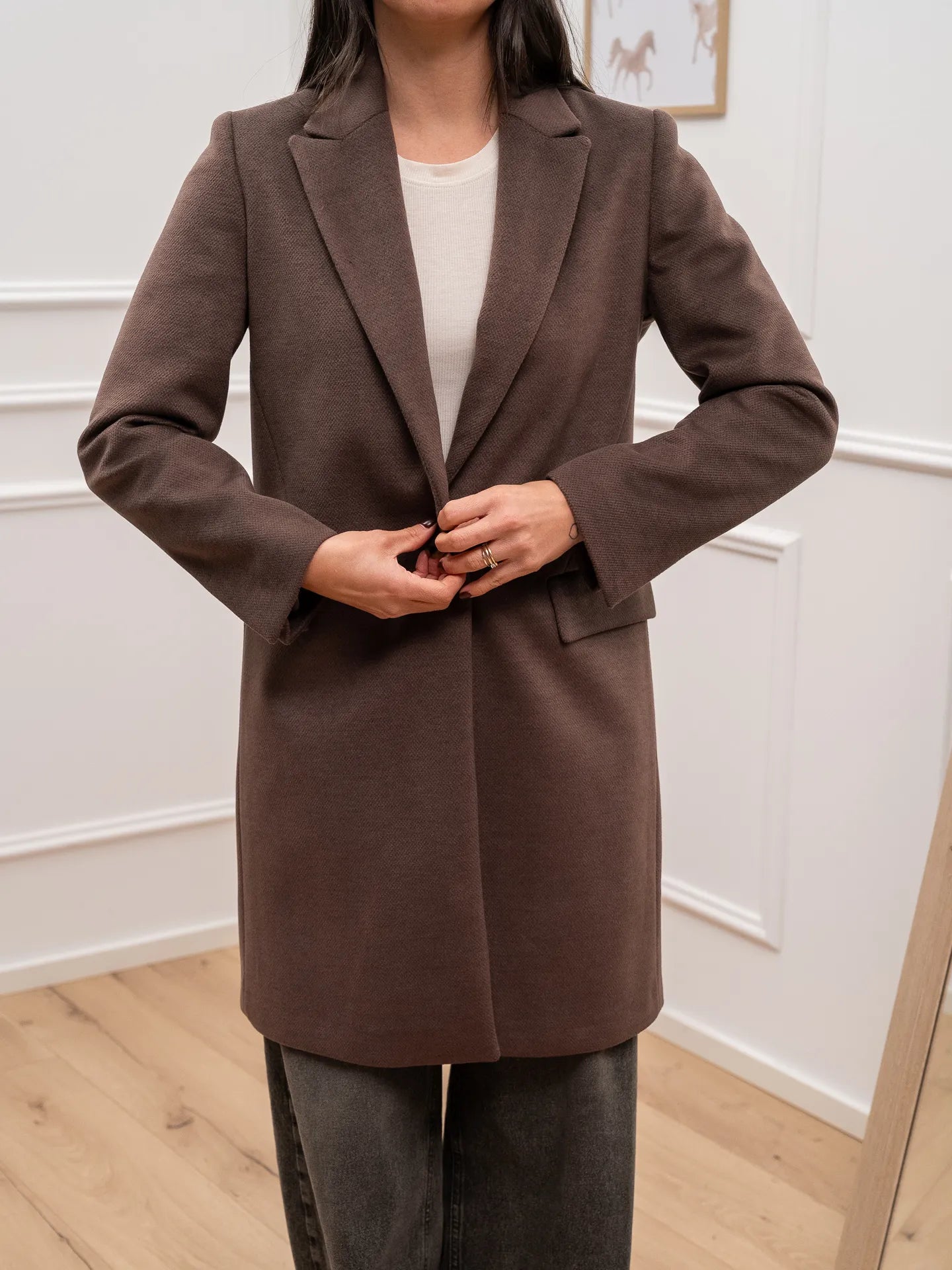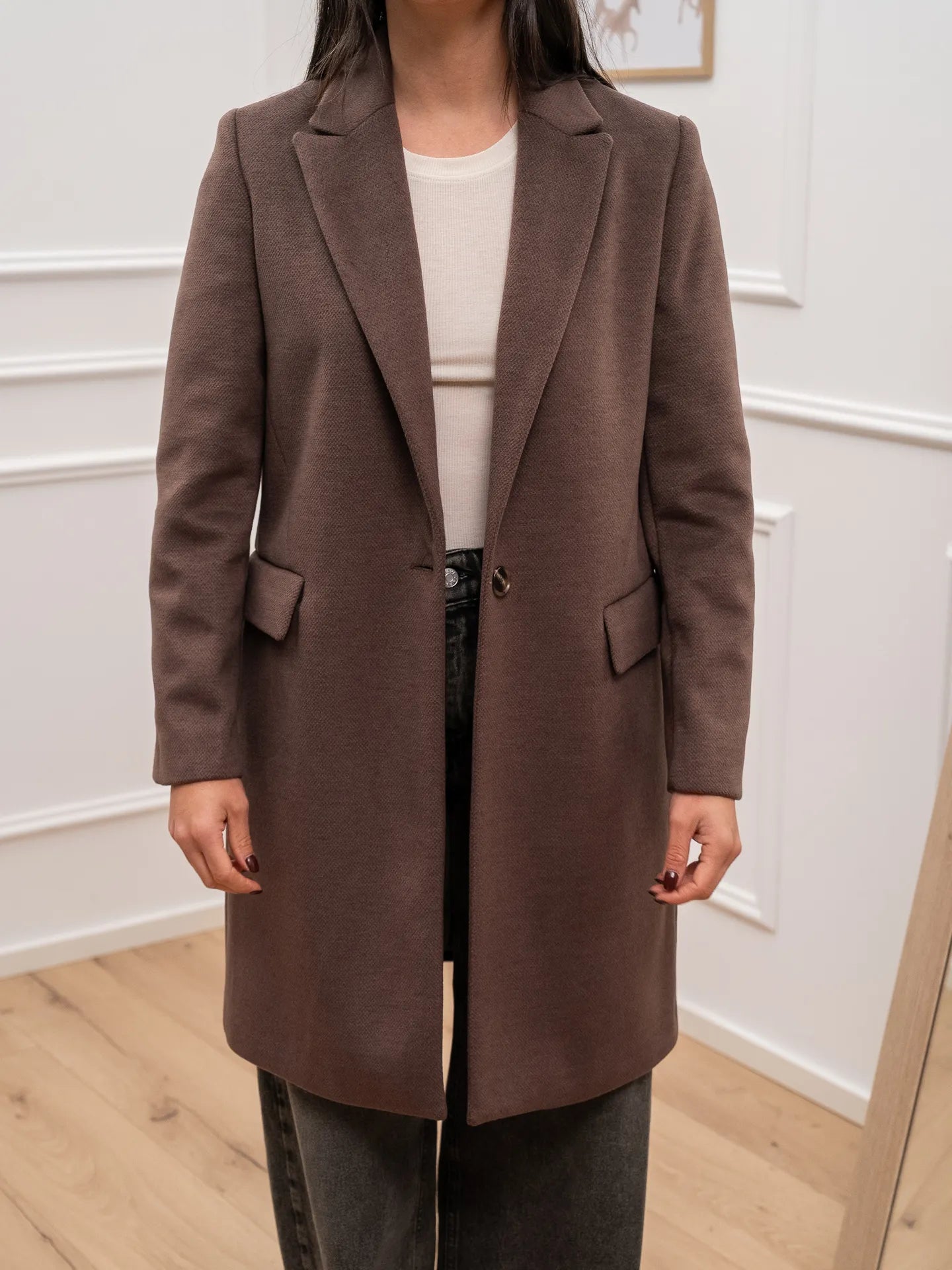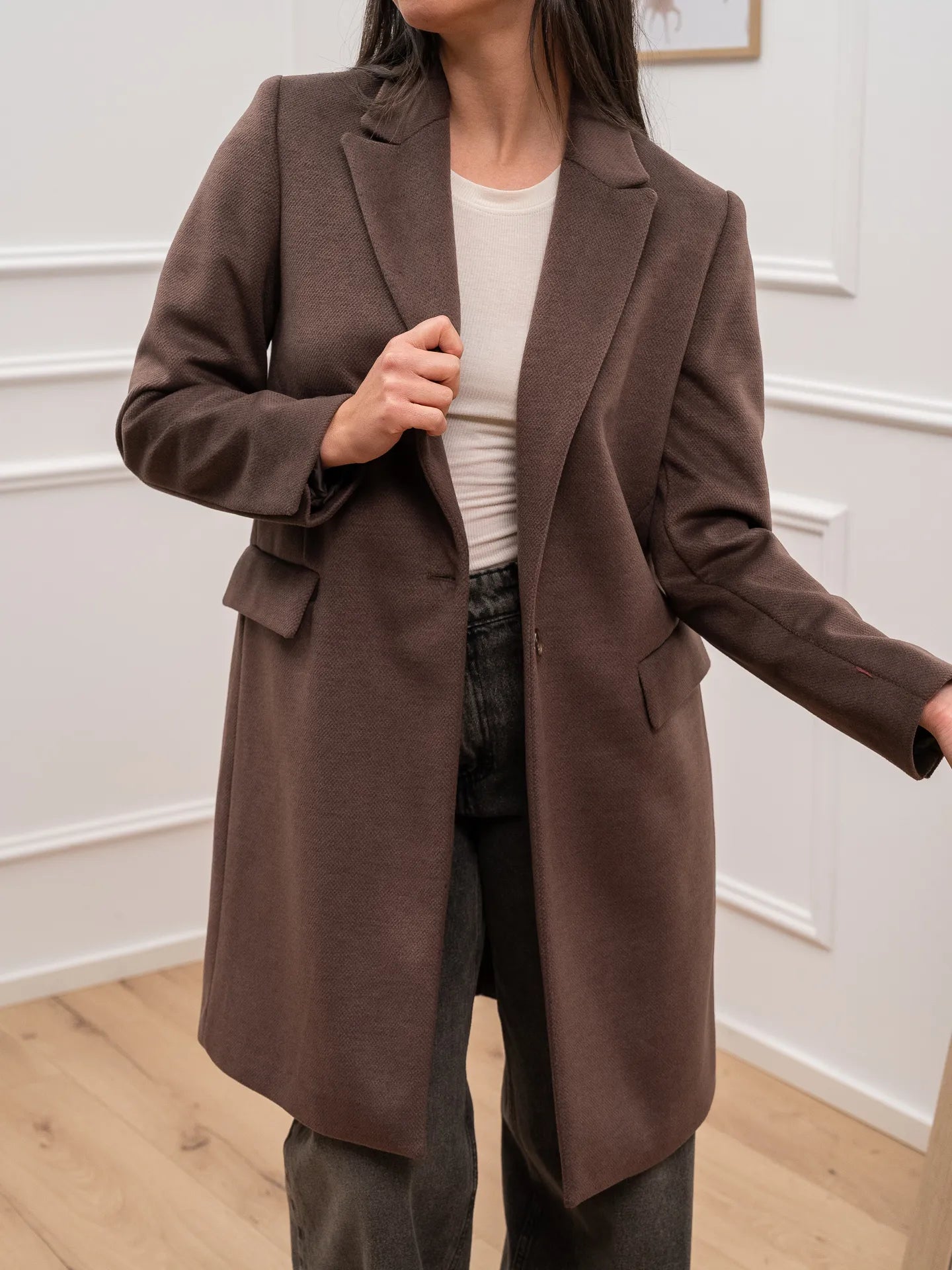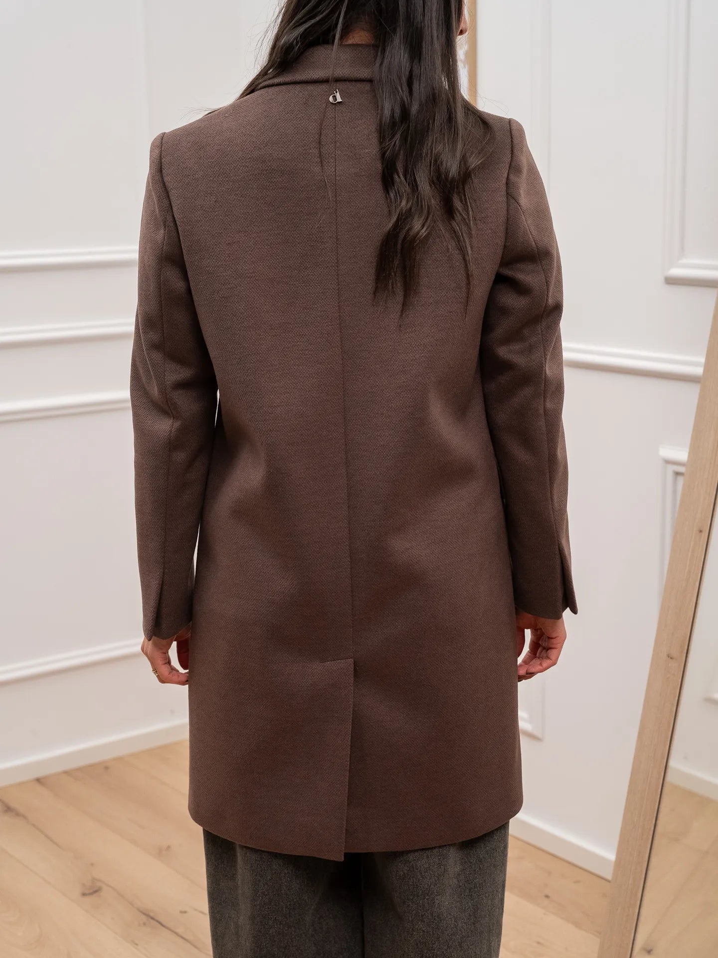 Cappotto color moro Dixie. Modello slim fit con chiusura frontale ad un bottone. Tasche orizzontali a patta.