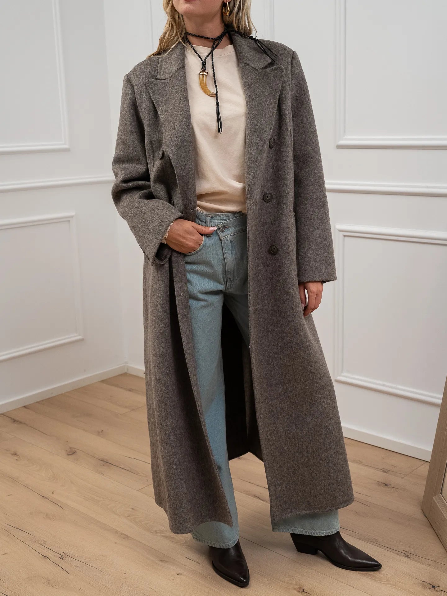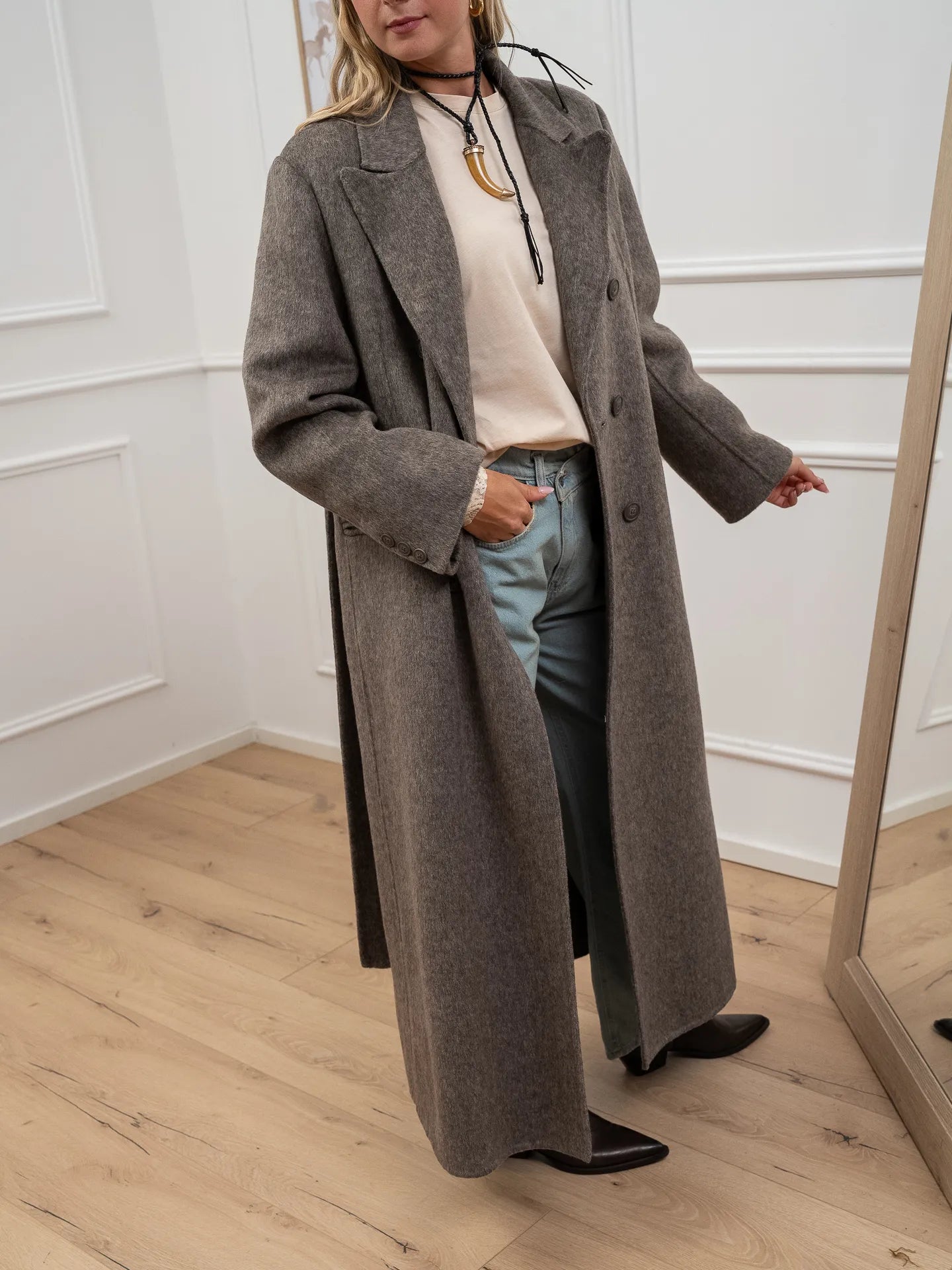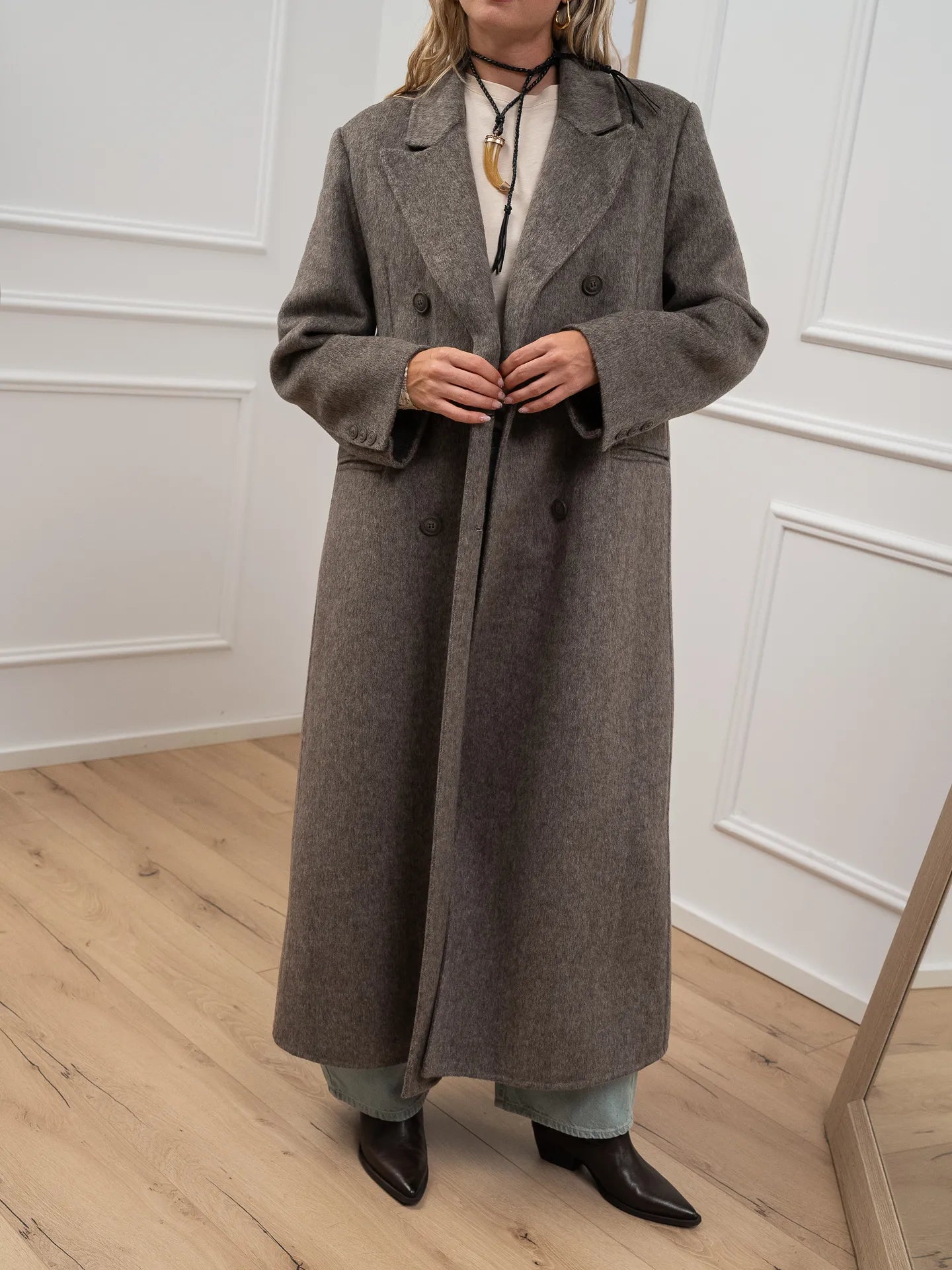 Cappotto color fango mélange HaveOne. Modello lungo strutturato con spalline leggermente imbottite. Chiusura doppiopetto a sei bottoni. Dettaglio di cintura in vita tono su tono rimovibile.