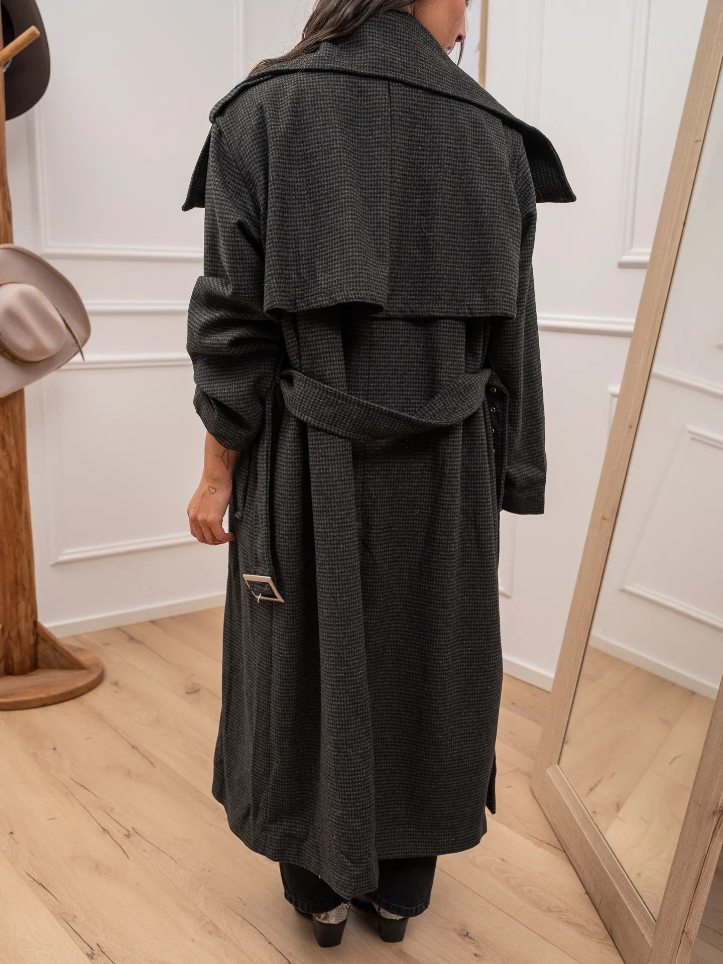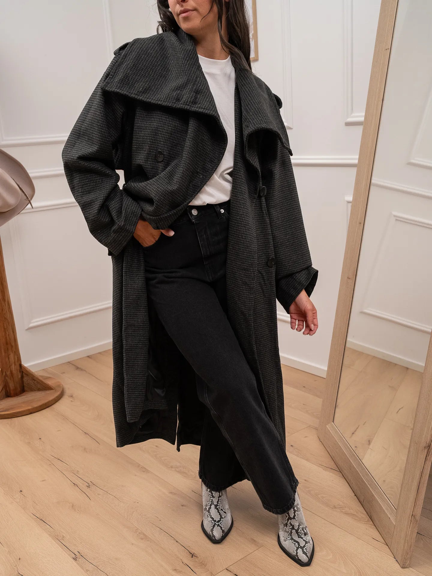 Cappotto fantasia pied de poule sui toni del grigio e nero Glamorous. Modello lungo stile trench collo ampio, chiusura frontale con bottoni doppiopetto e cintura.