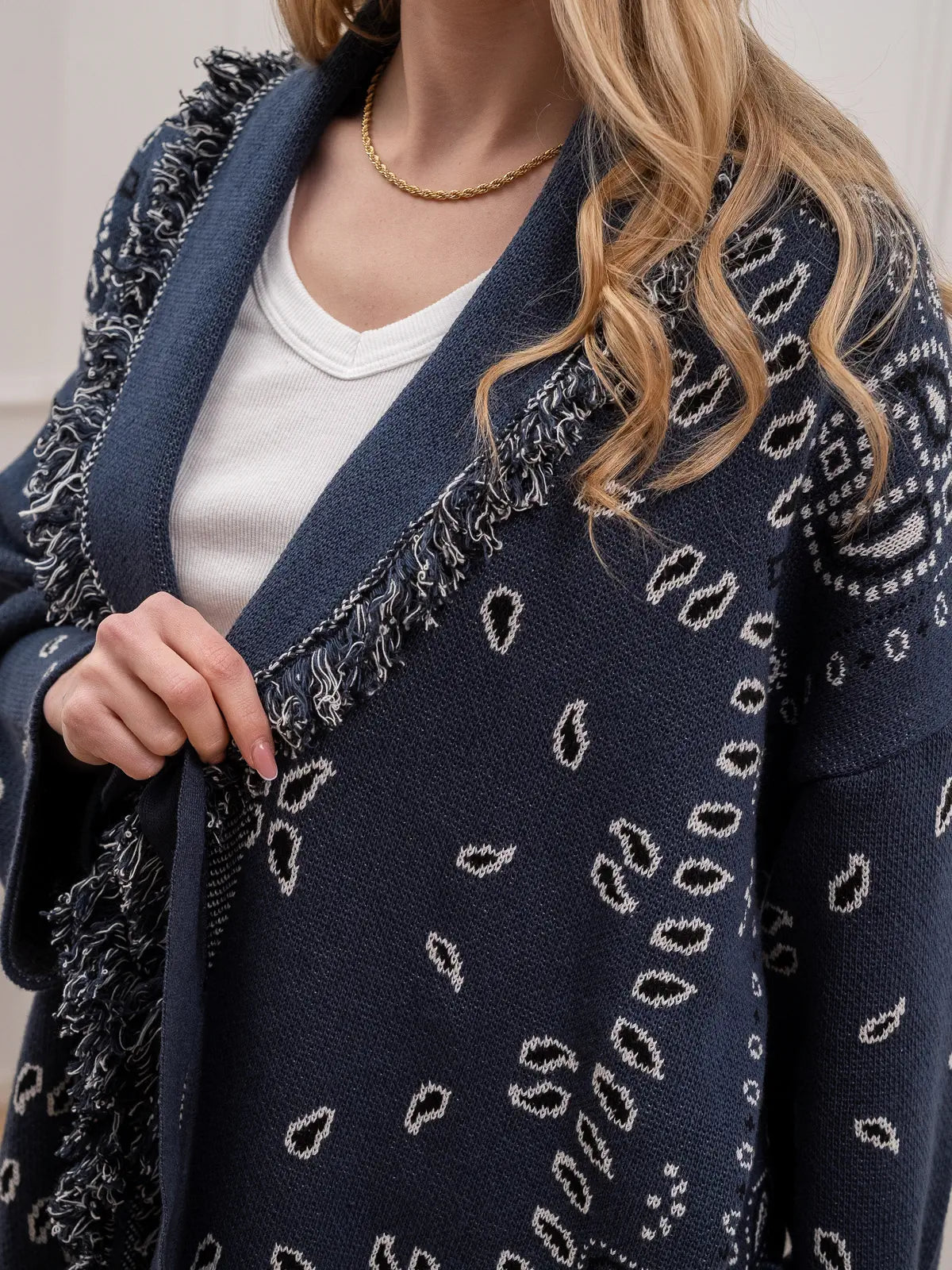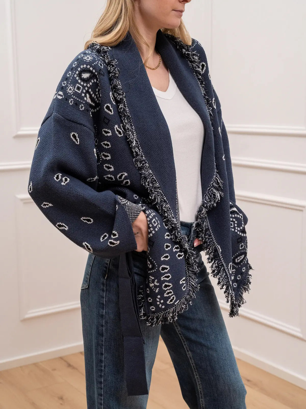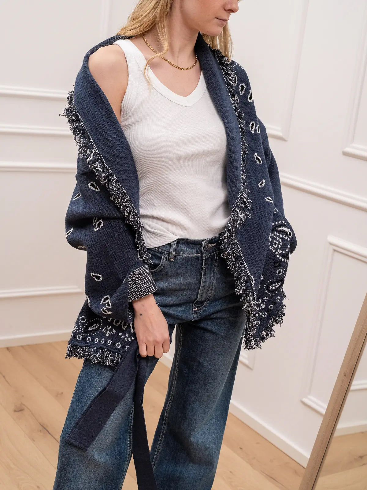 Cardigan fantasia bandana sui toni del blu, bianco e nero Tensione In. Modello alanui senza chiusura con bordi sfrangiati e cinturina da annodare in vita.