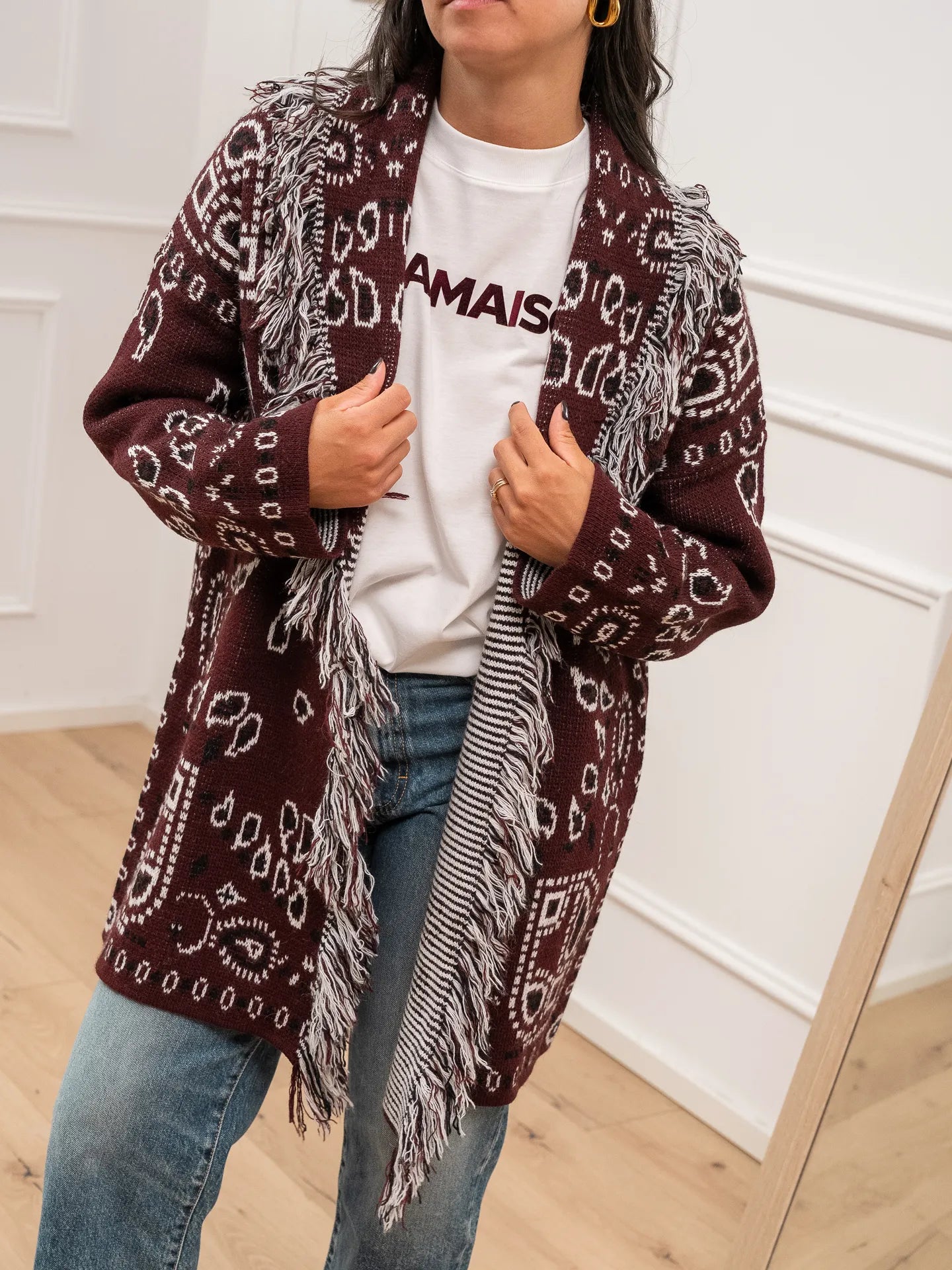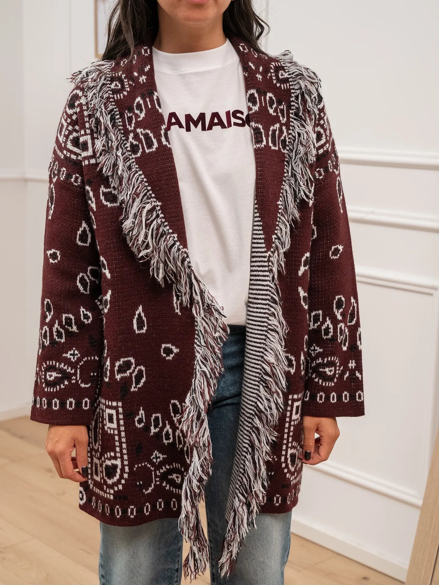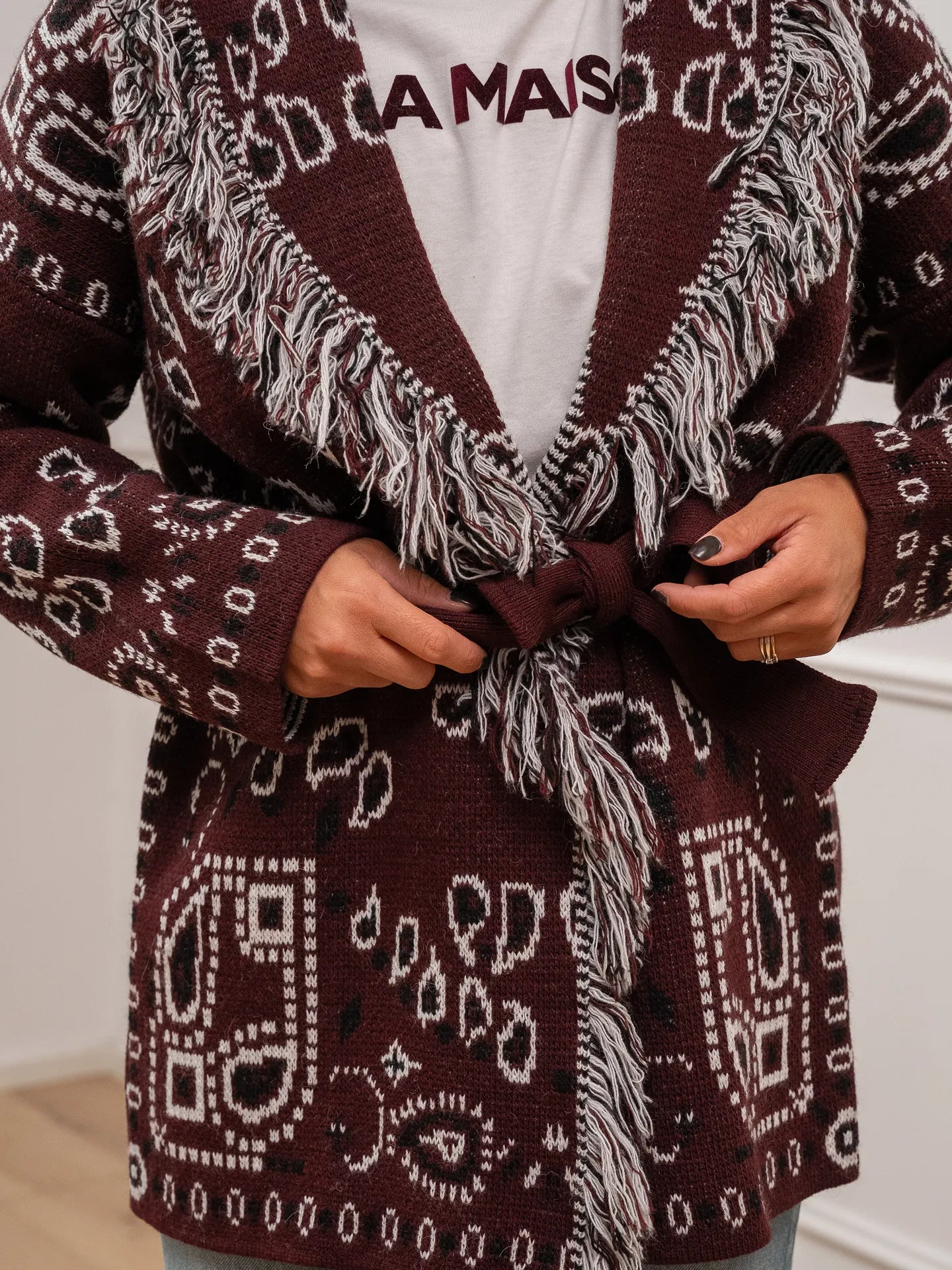 Cardigan alanui bandana bordeaux, nero e bianco Vicolo. Modello fit morbido con collo sciallato e manica lunga e fusciacca da annodare in vita. Dettaglio di bordi sfrangiati.