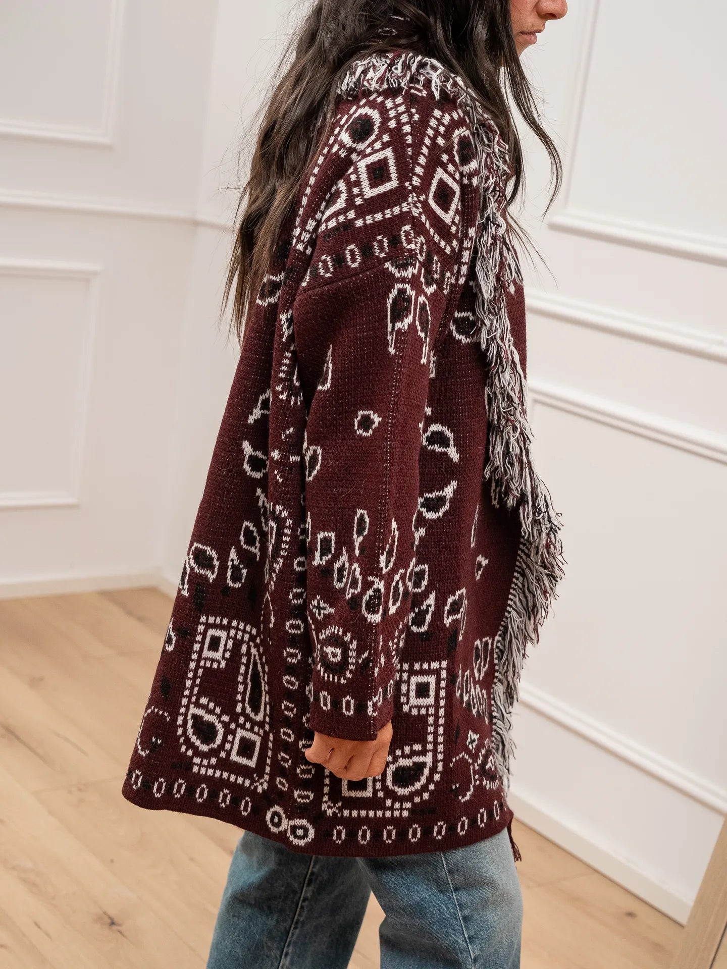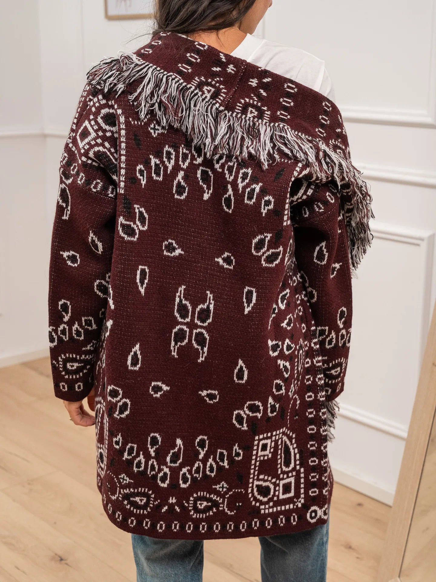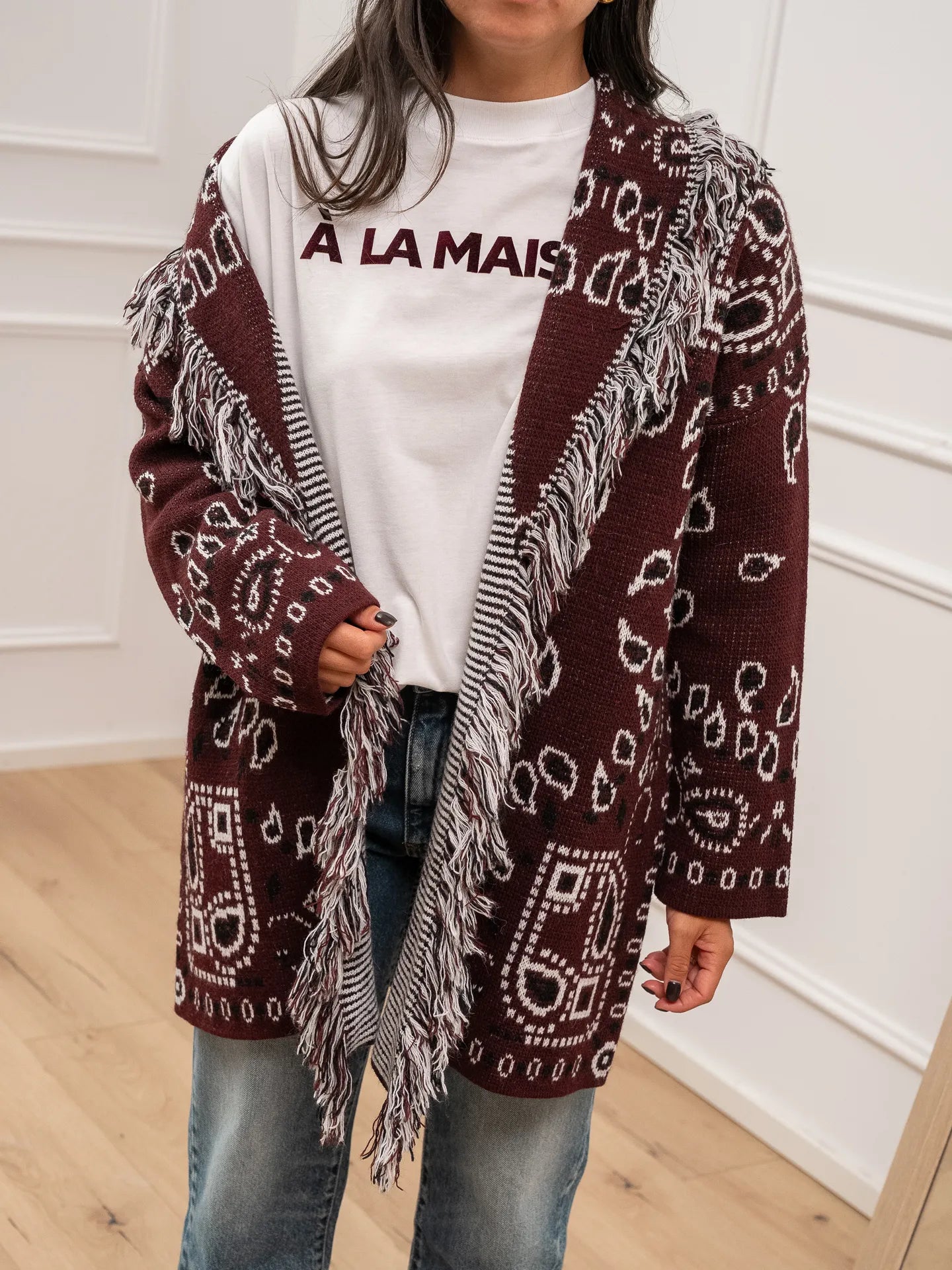 Cardigan alanui bandana bordeaux, nero e bianco Vicolo. Modello fit morbido con collo sciallato e manica lunga e fusciacca da annodare in vita. Dettaglio di bordi sfrangiati.