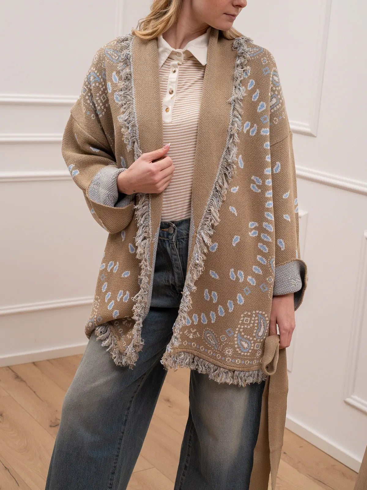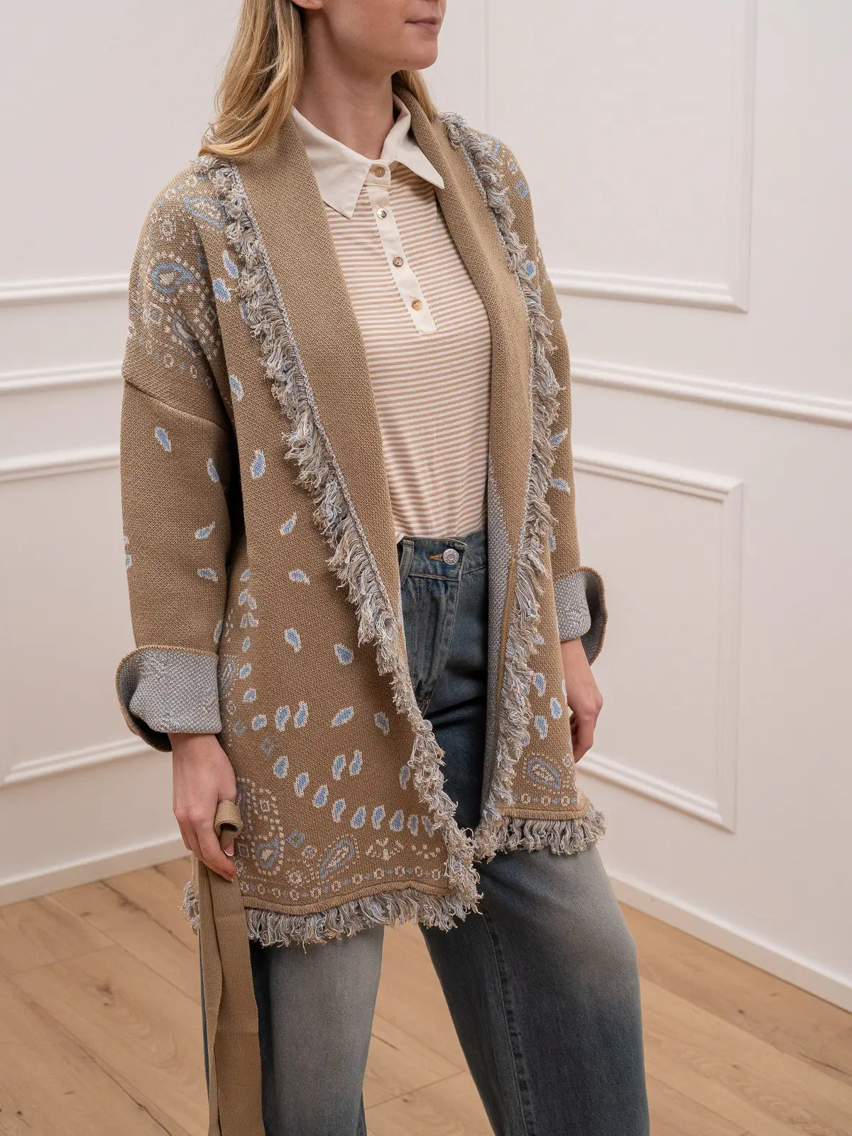 Cardigan fantasia bandana sui toni del sabbia, bianco e celeste Tensione In. Modello alanui senza chiusura con bordi sfrangiati e cinturina da annodare in vita.