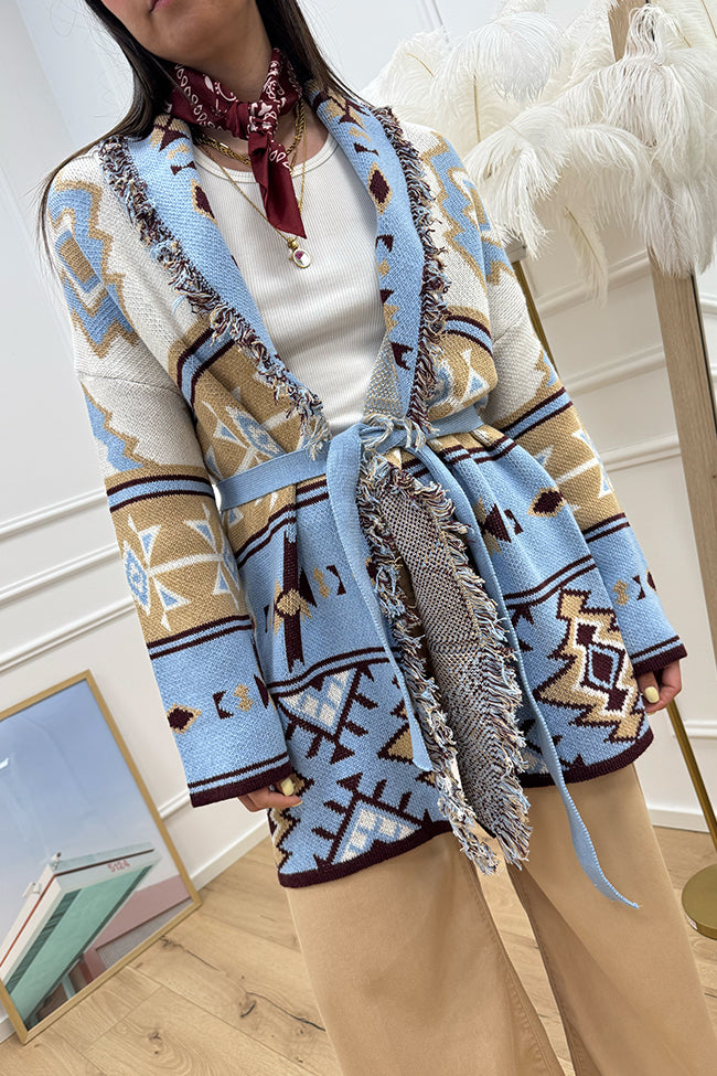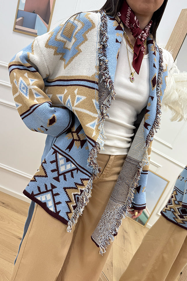 Cardigan in fantasia sui toni del celeste, latte e vino HaveOne. Modello alanui sfrangiato sui i profili, con manica lunga e fusciacca rimovibile.