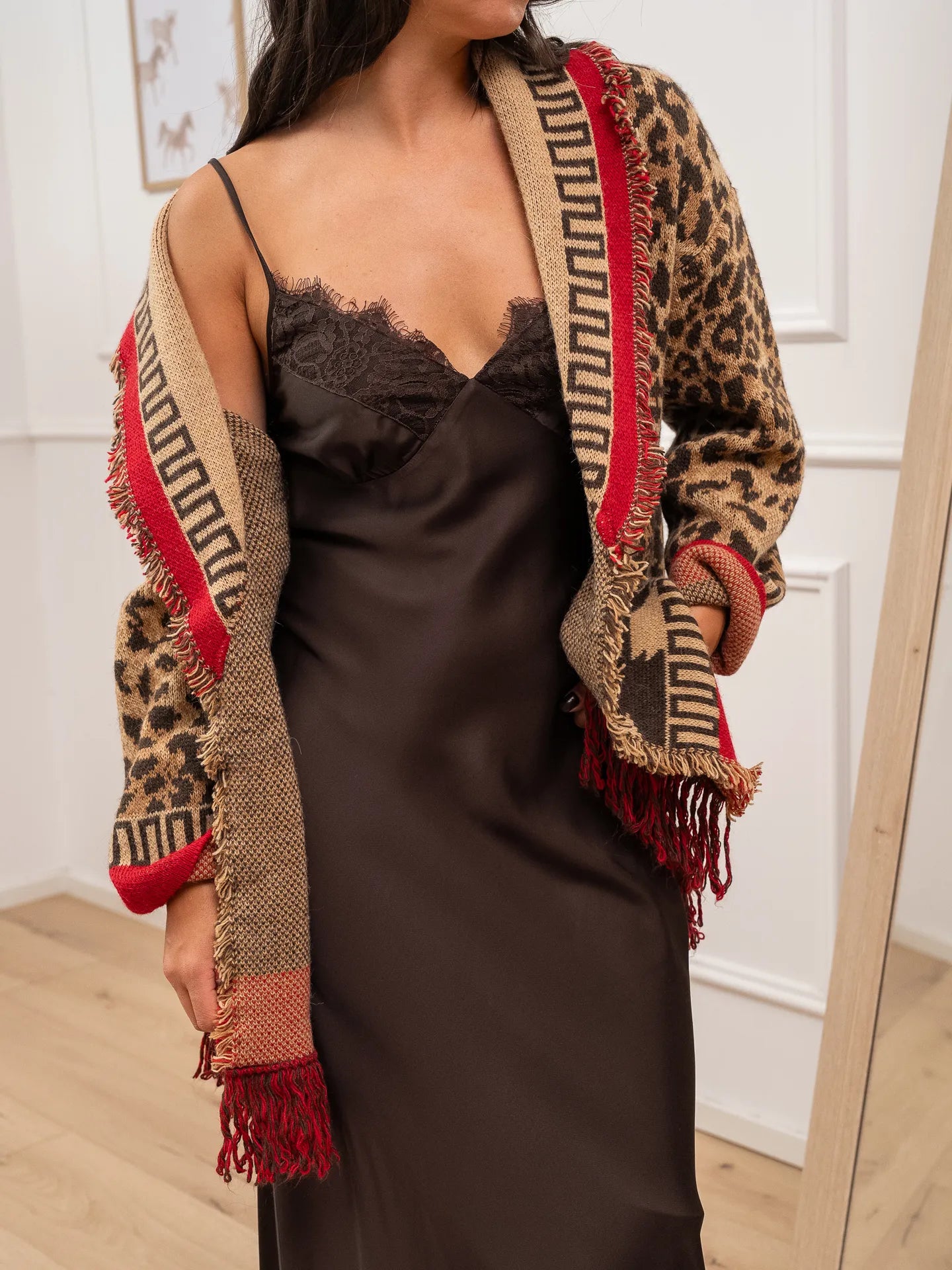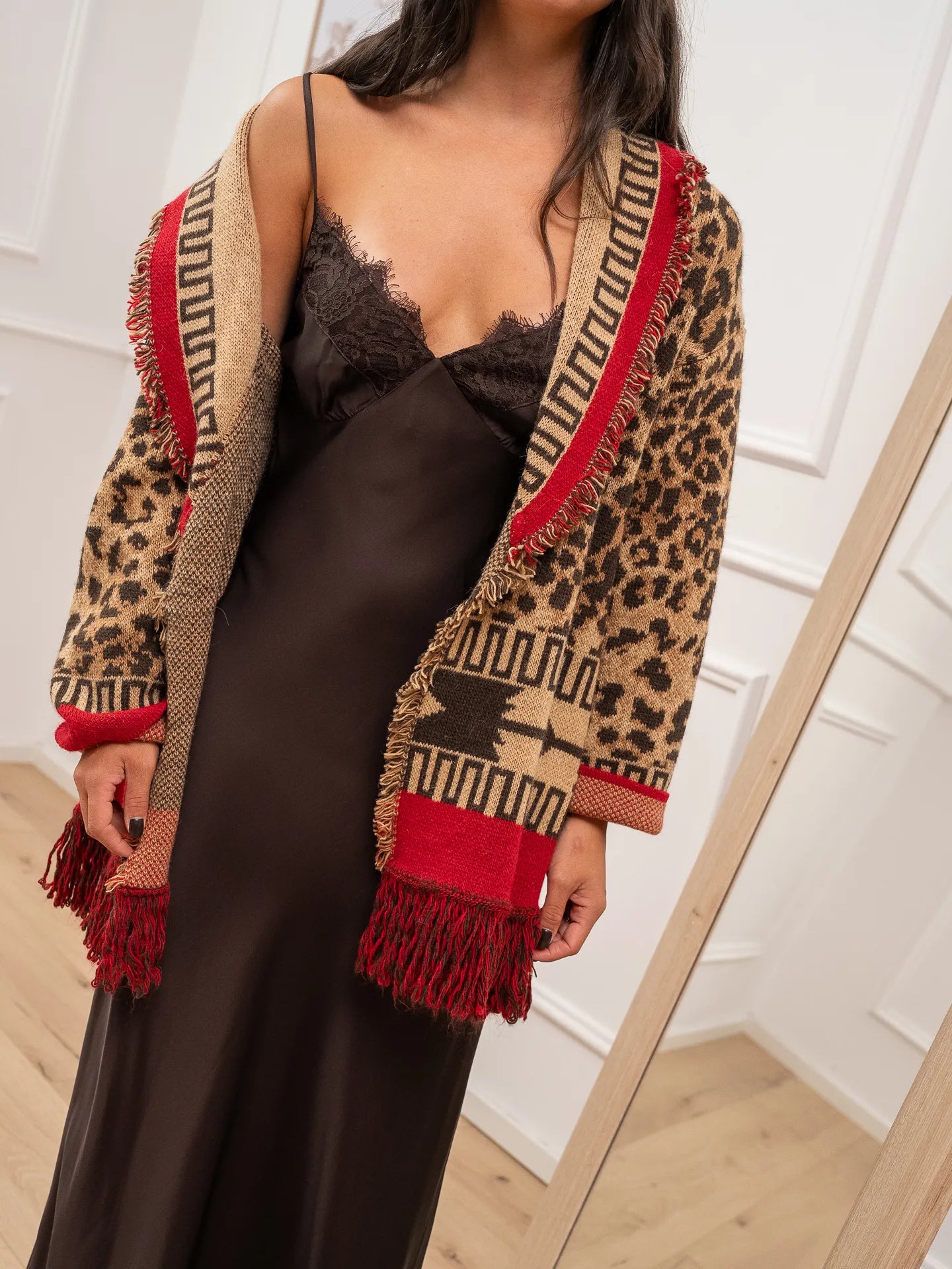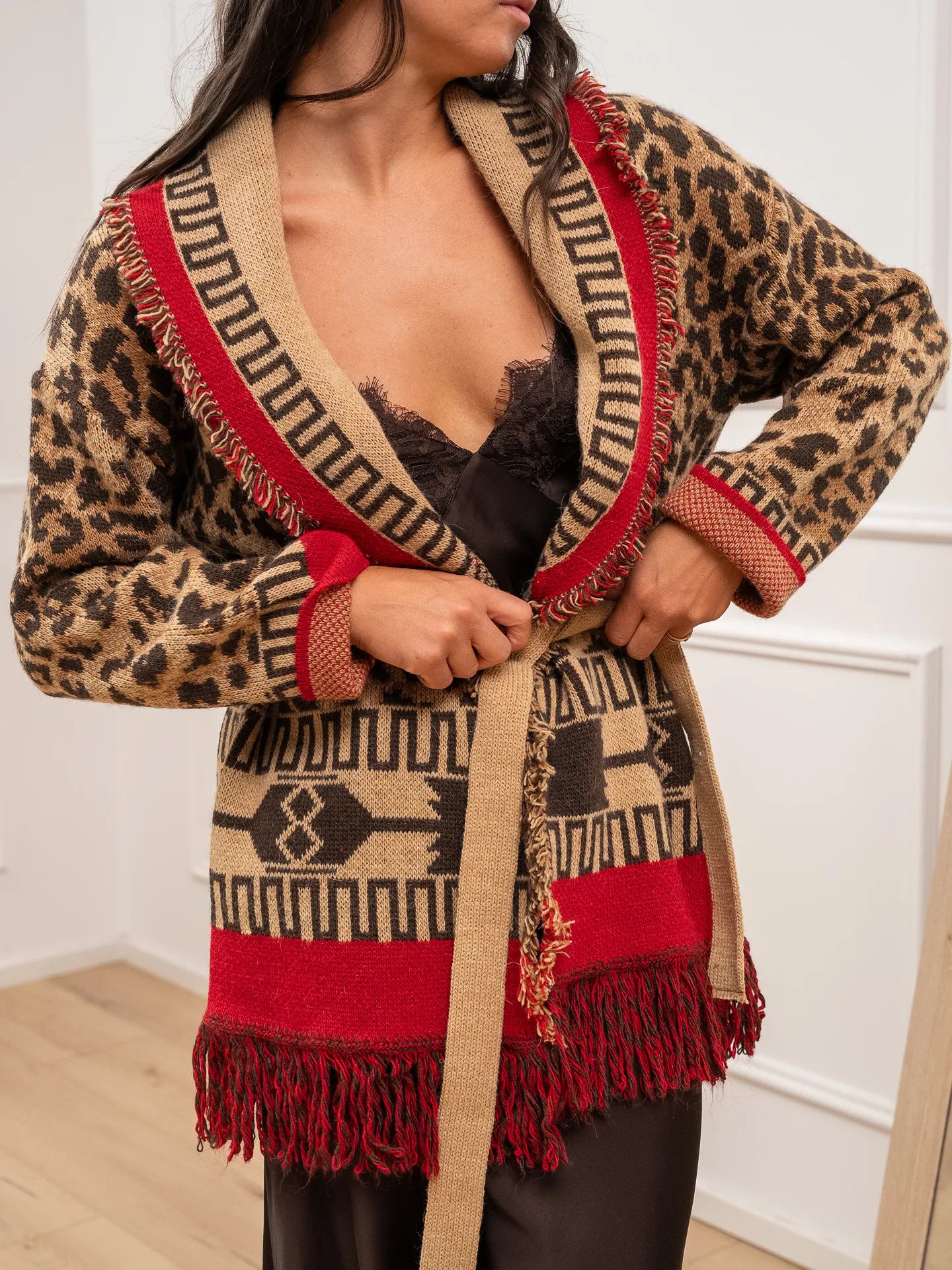 Cardigan alanui fantasia maku camel, moro e rosso HaveOne. Modello fit morbido con collo revers e cintura da annodare in vita. Dettaglio di bordi sfrangiati.