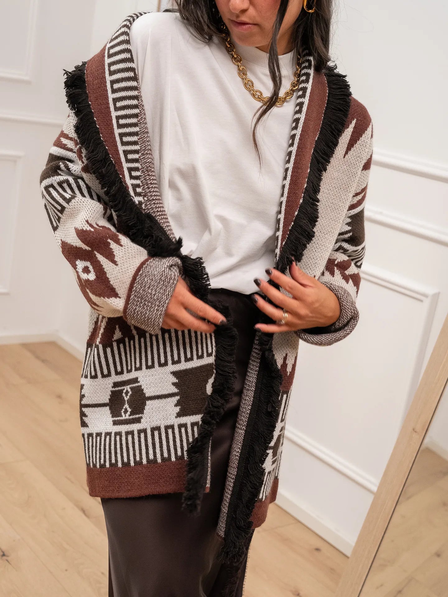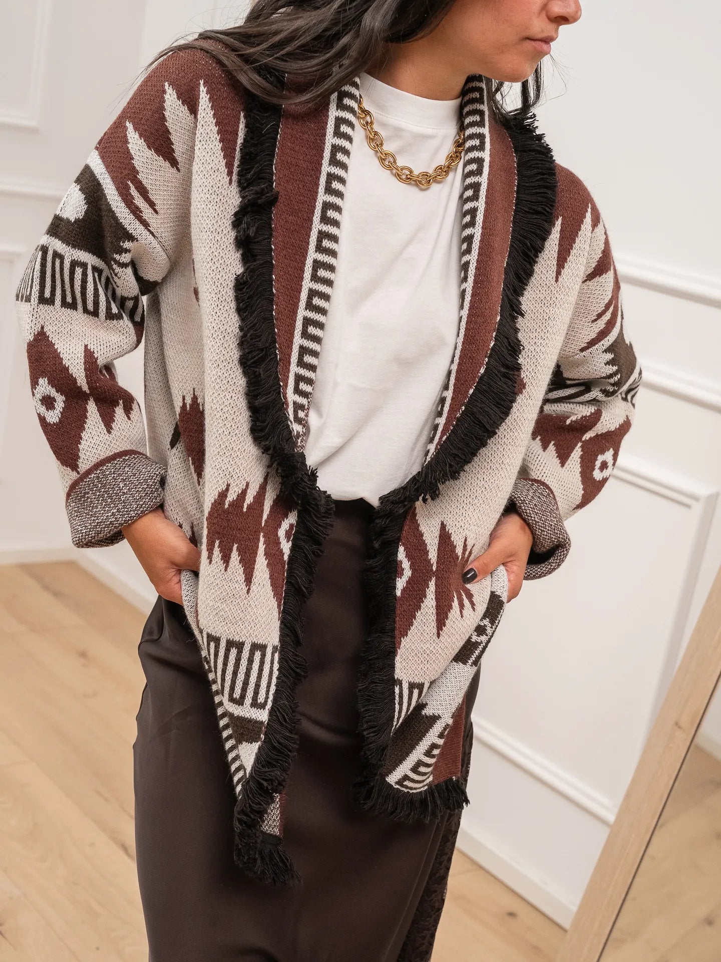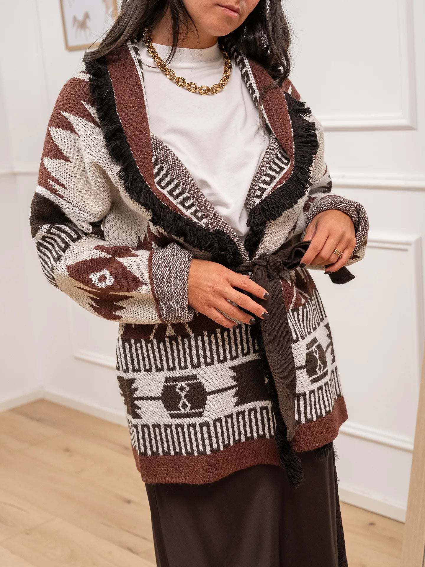 Cardigan alanui bandana mogano, panna e moro Vicolo. Modello fit morbido con collo sciallato e manica lunga e fusciacca da annodare in vita. Dettaglio di bordi sfrangiati.