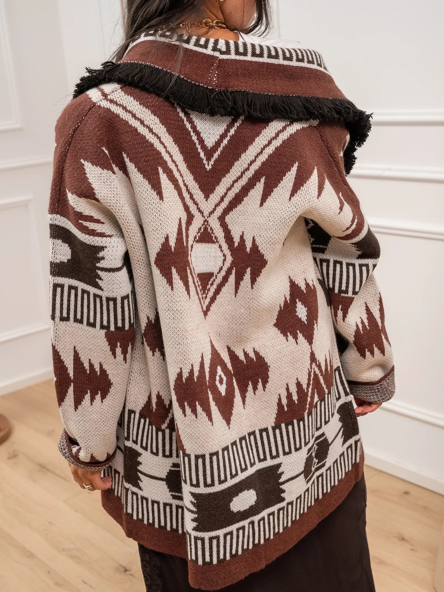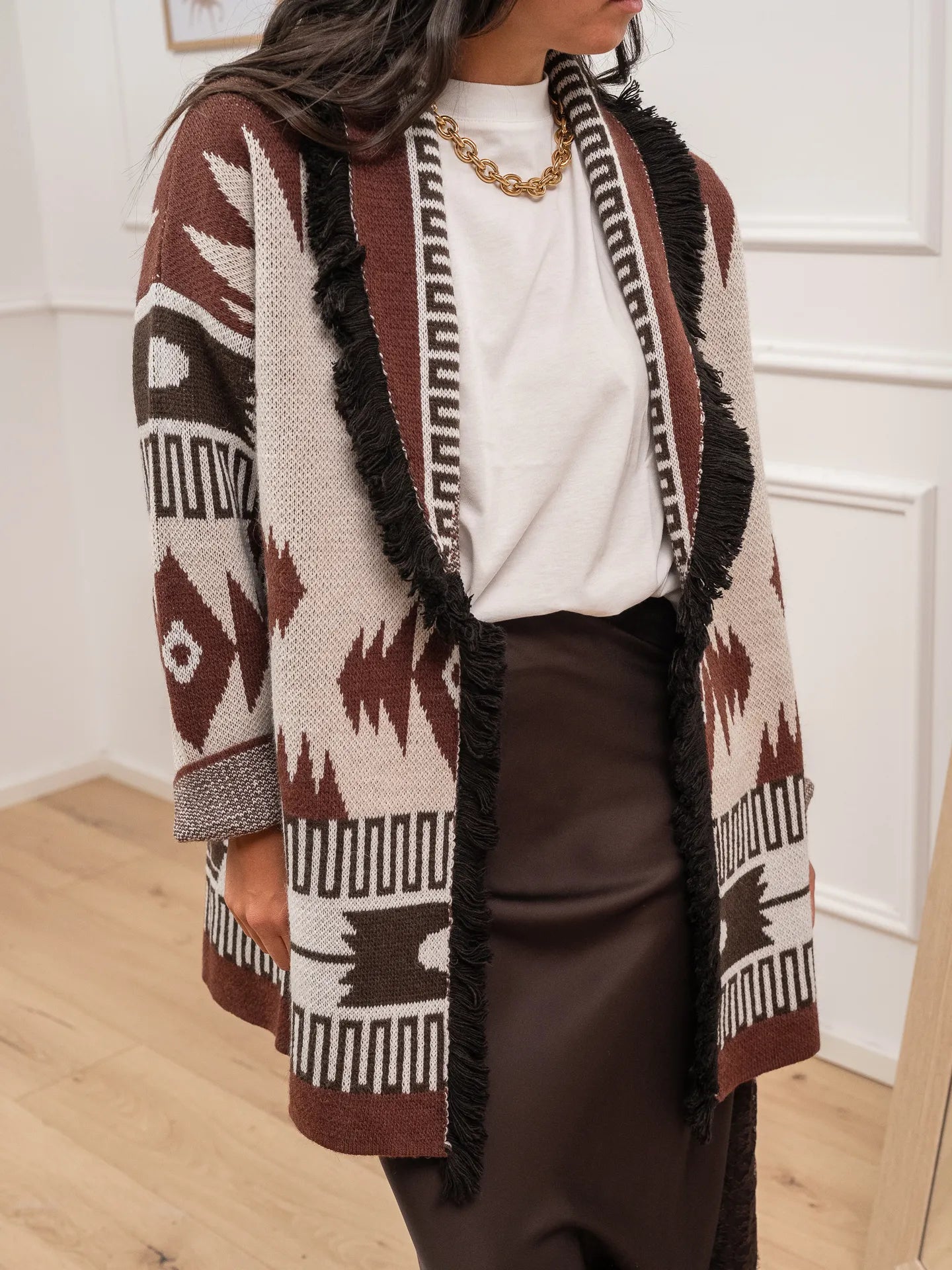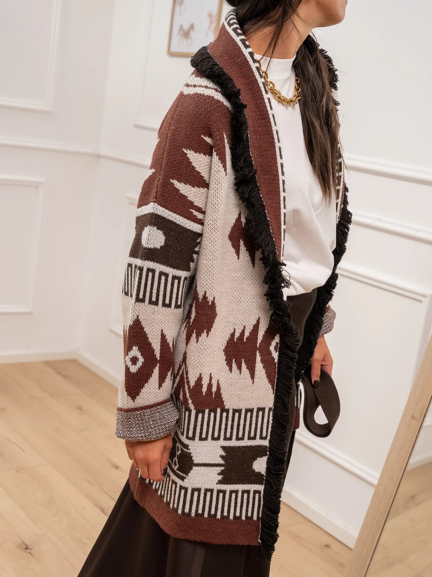 Cardigan alanui bandana mogano, panna e moro Vicolo. Modello fit morbido con collo sciallato e manica lunga e fusciacca da annodare in vita. Dettaglio di bordi sfrangiati.