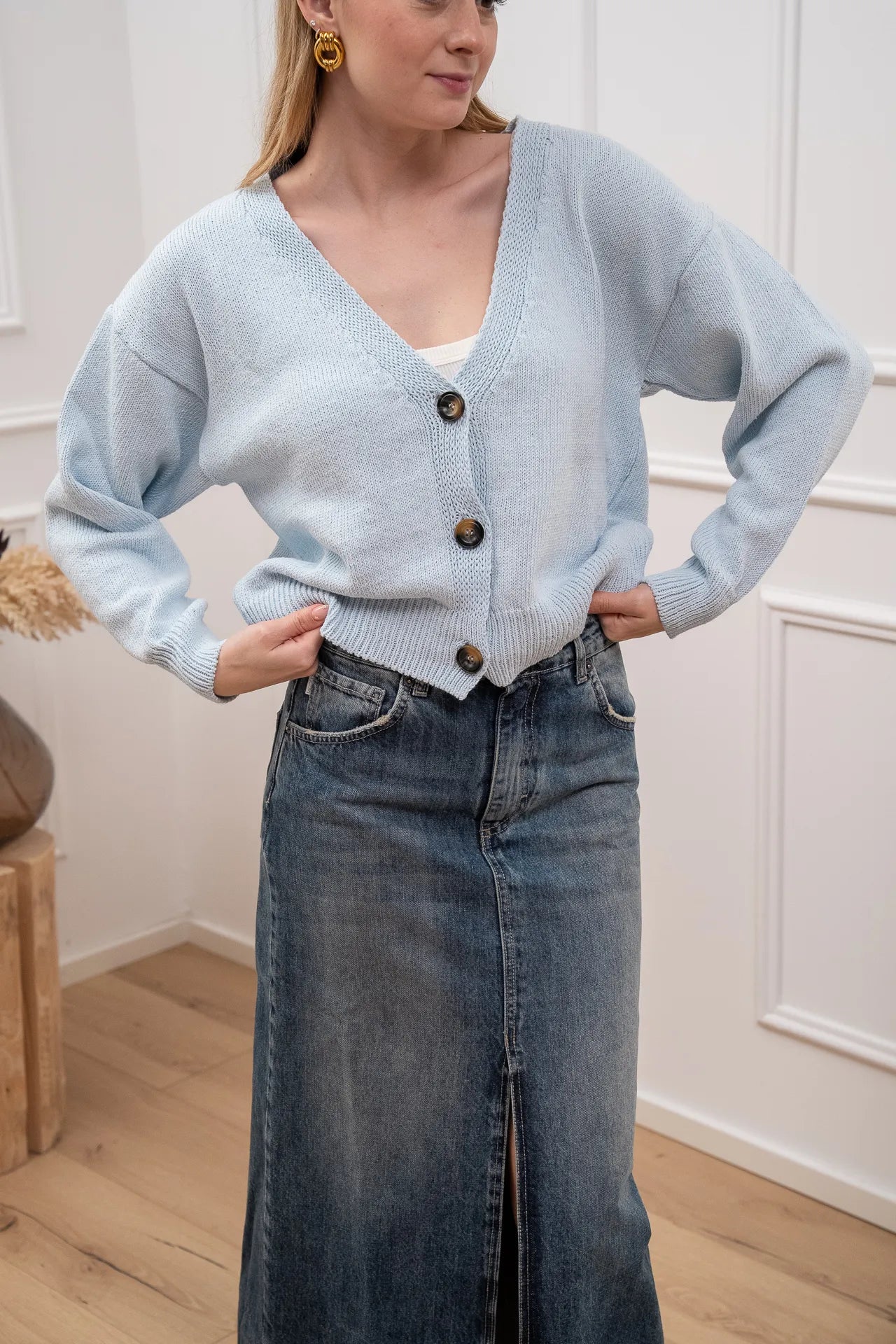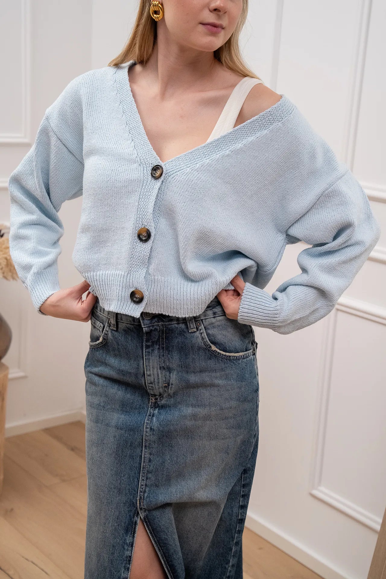 Cardigan basic color celeste Vicolo. Modello fit morbido con scollo a v e chiusura con bottoni in osso. Finiture a coste.